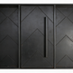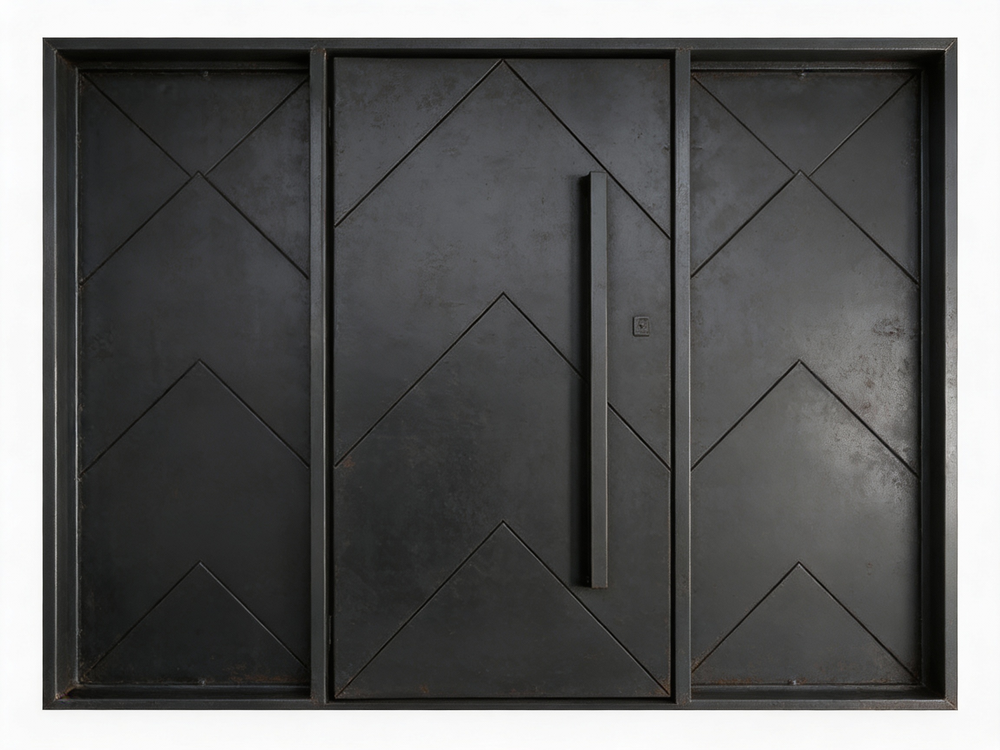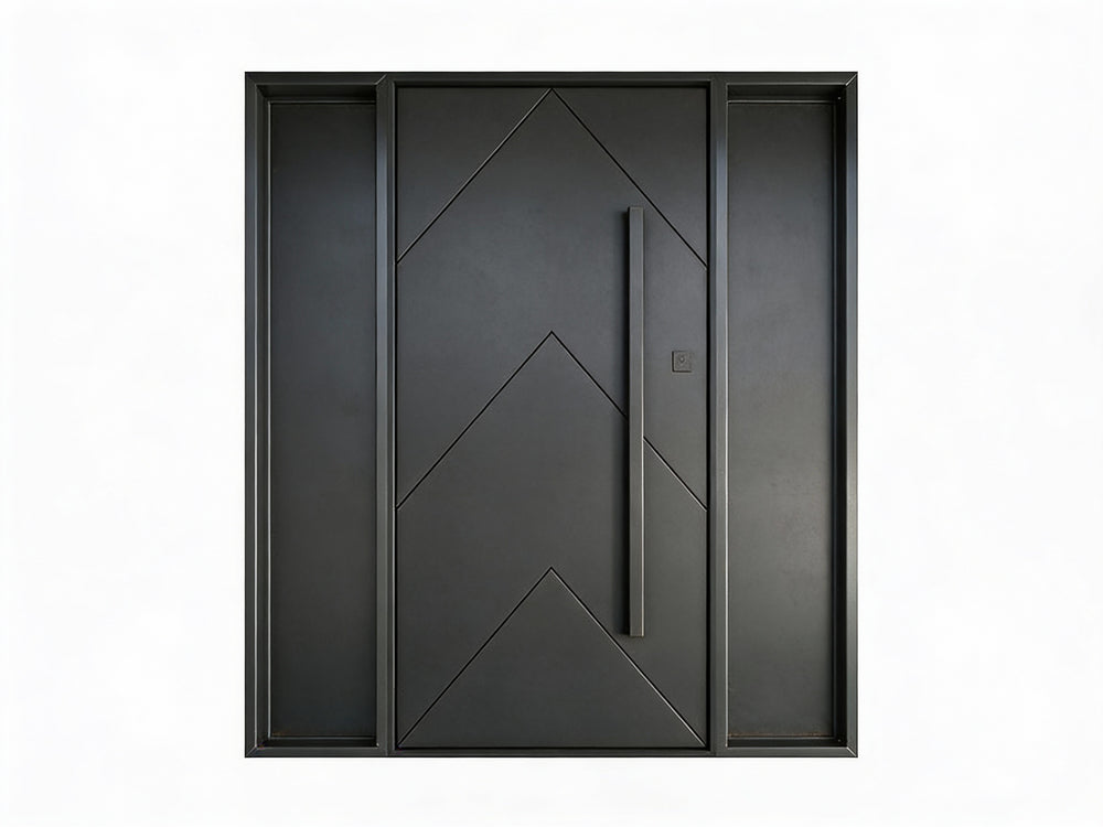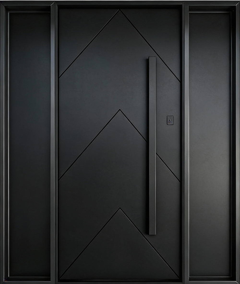 Modern Chevron Wrought Iron Entry Door Pre-Hung Steel Door with Vertical Pull Handle & Side Glass Panels Model # IWD986