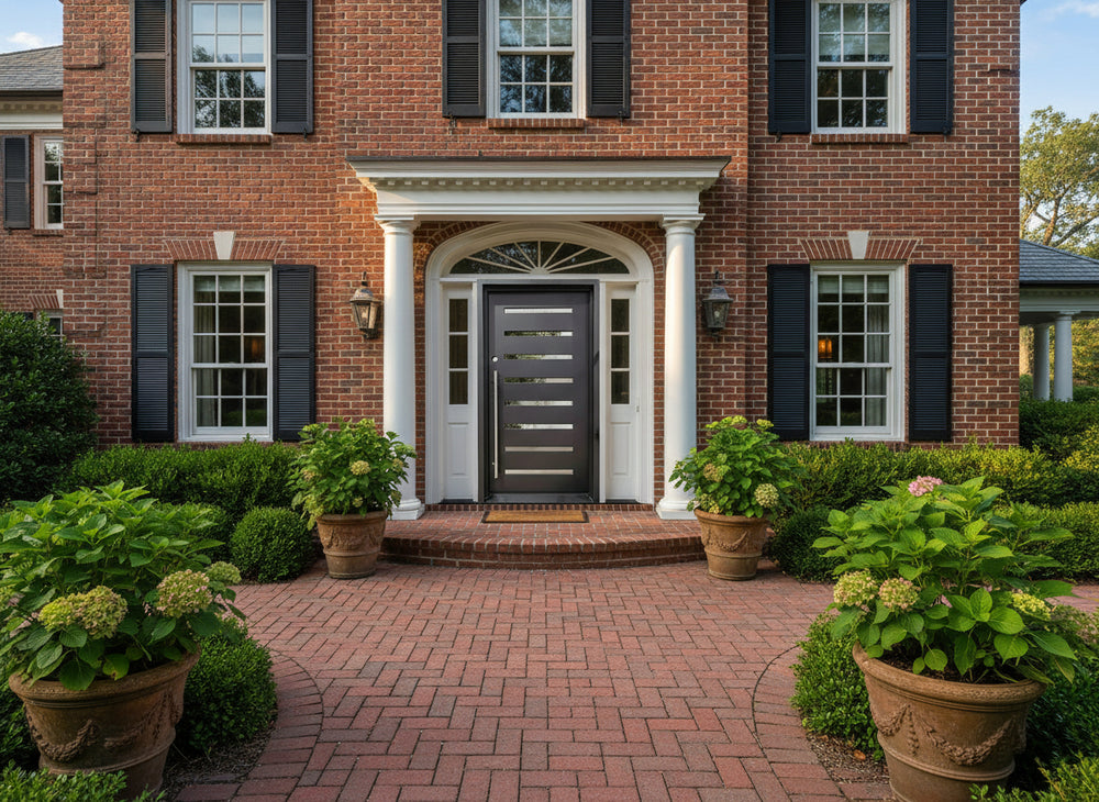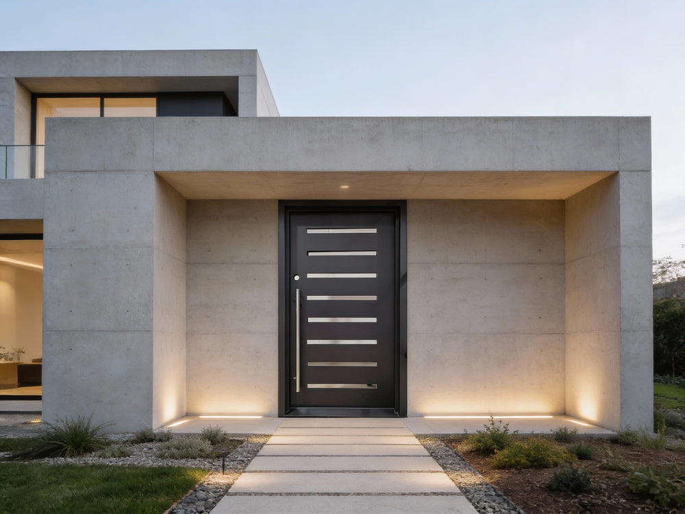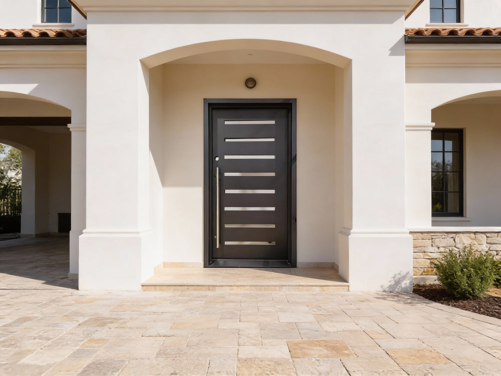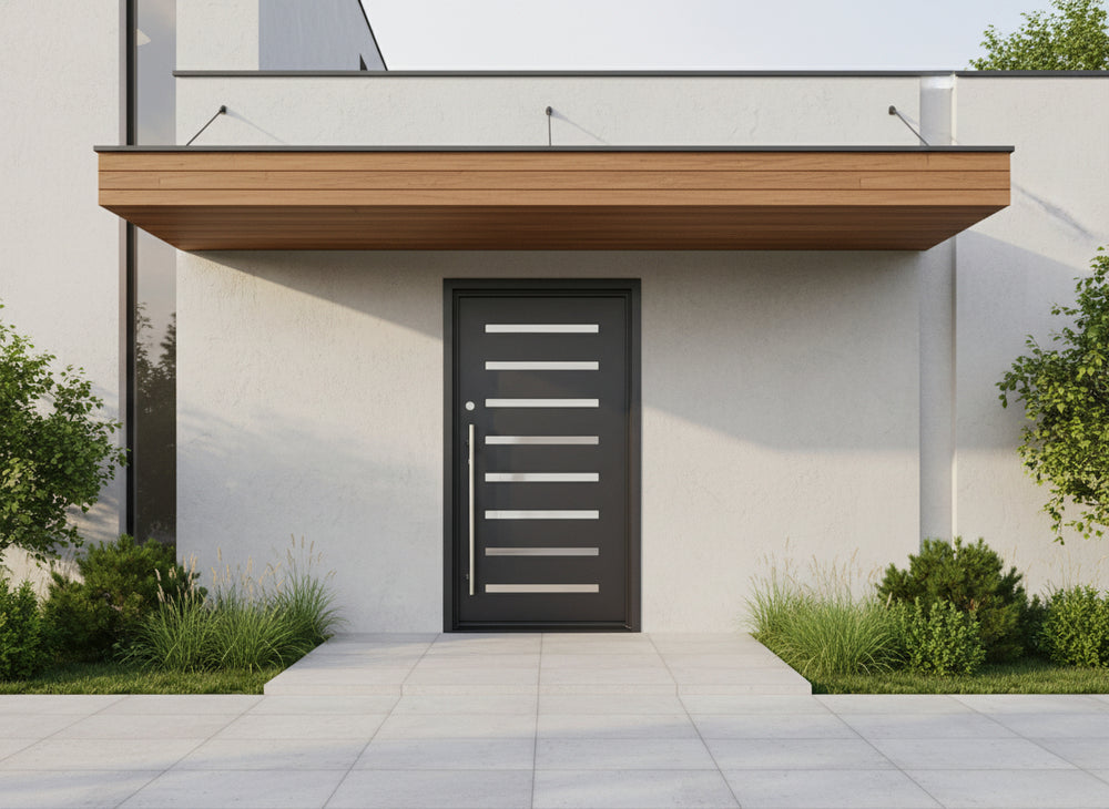 Upgrade your entryway with this modern iron door featuring a sleek square top and stainless steel horizontal accents. Designed from galvanized steel and powder-coated for enhanced durability and rust resistance, this contemporary steel door is ideal for homes and commercial buildings seeking both style and strength. With insulated jambs and double-pane glass, it promotes energy efficiency while the flush bolts and heavy-duty hinges provide top-tier security. Customize your steel entry door to match any architectural aesthetic, and enjoy reliable performance paired with elegant design. Discover high-end iron doors in Canada and USA with free delivery and expert craftsmanship.