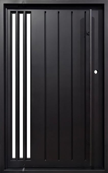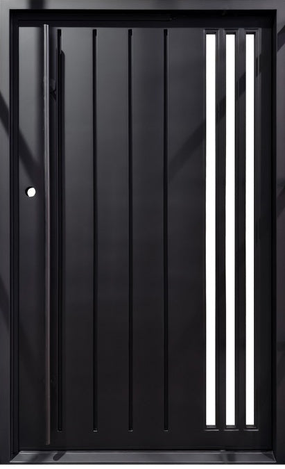 black steel door with white stripes, linear textured entry door, modern iron door Canada, solid steel door with circular handle, contemporary steel front door, matte black welded door, custom metal door for home, architectural black steel door, striped iron security door, residential steel entry Mississauga