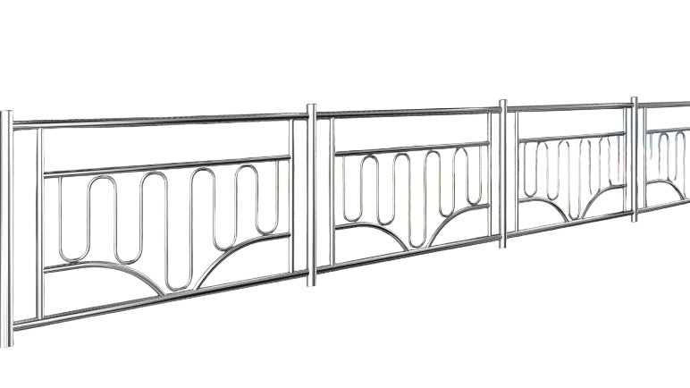 - Modern Stainless Steel Railing This modern design features a sleek and polished appearance, making it suitable for both indoor and outdoor use. The railing consists of multiple sections, each framed by vertical posts and featuring a pattern of vertical and curved bars. This design is both functional and decorative, providing safety while enhancing the aesthetic appeal of the space where it is installed.