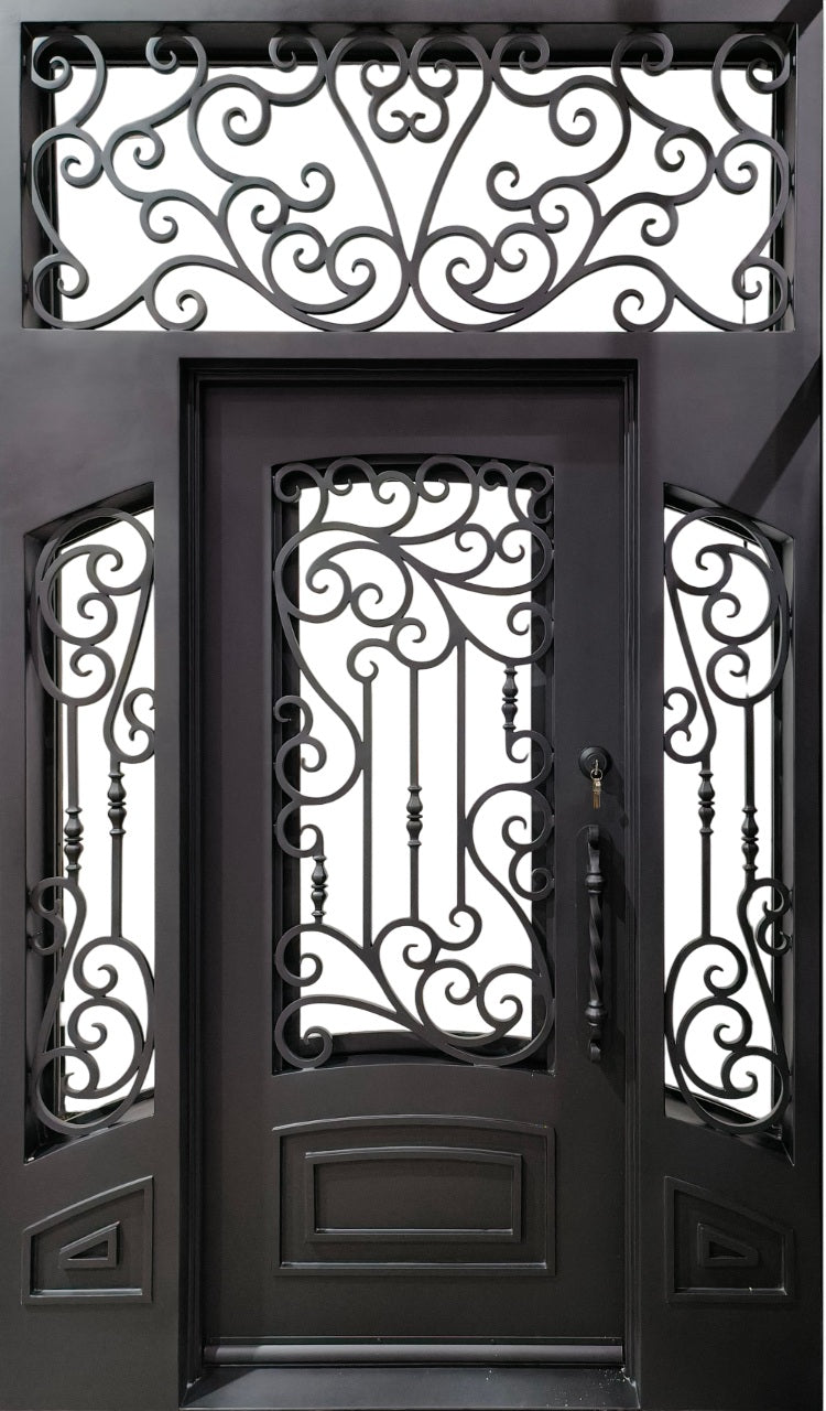 arched wrought iron door, double steel entry with transom, scrollwork iron door design, luxury black metal door, ornamental steel door Canada, heritage style iron gate, decorative steel front door, grand entry steel door, architectural iron door Mississauga, custom scrollwork iron door