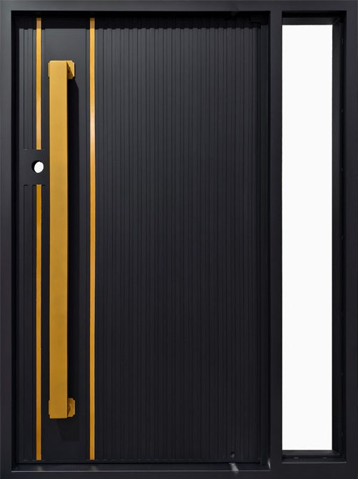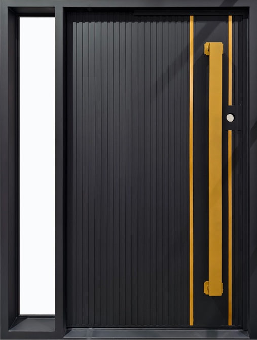 This single modern iron entry door features a sleek vertical-line design, complemented by a brushed brass handle and inlaid brass accent strips. The minimal surface treatment and bold contrast between the black powder-coated steel and metallic details make it a perfect fit for contemporary or luxury residential projects.