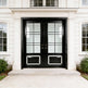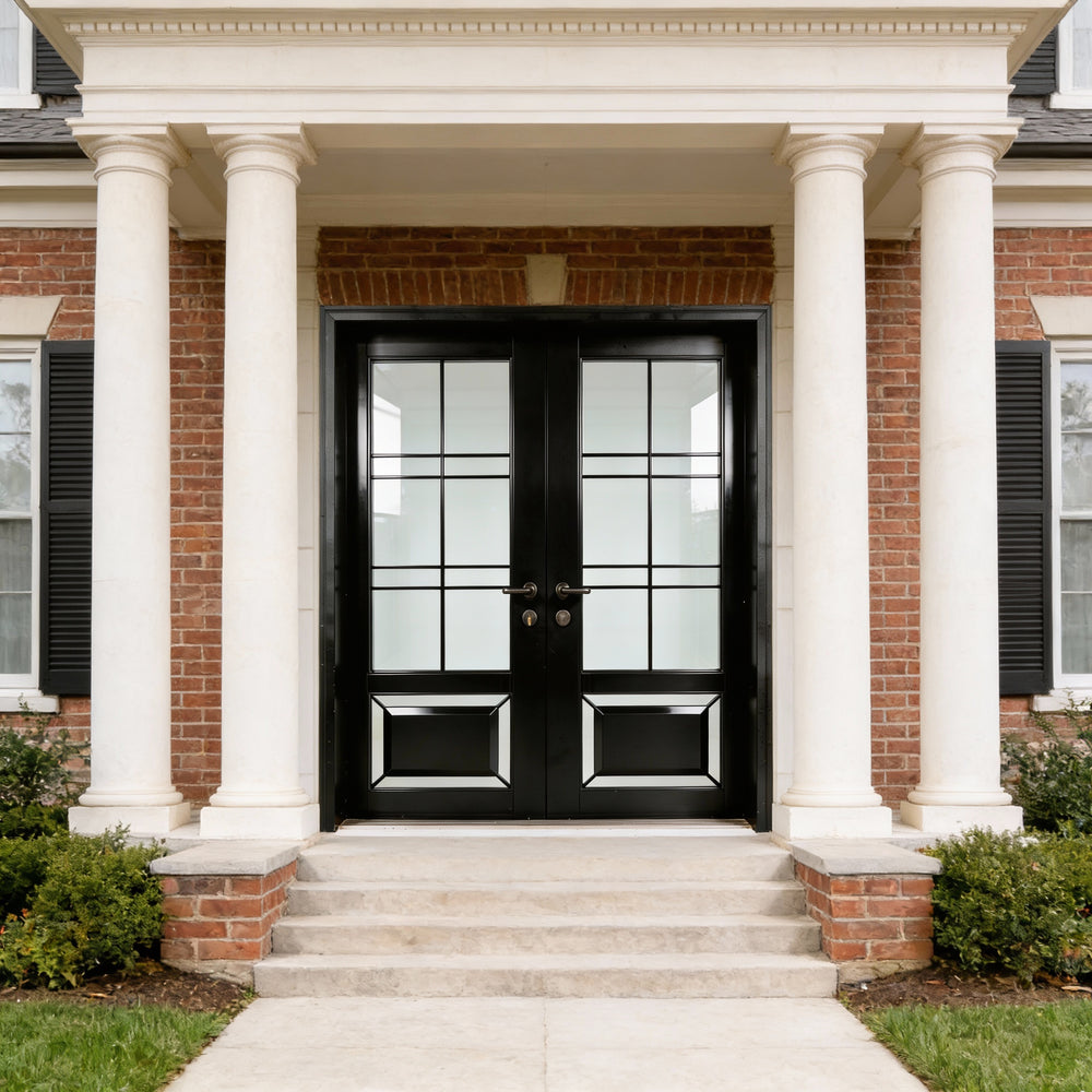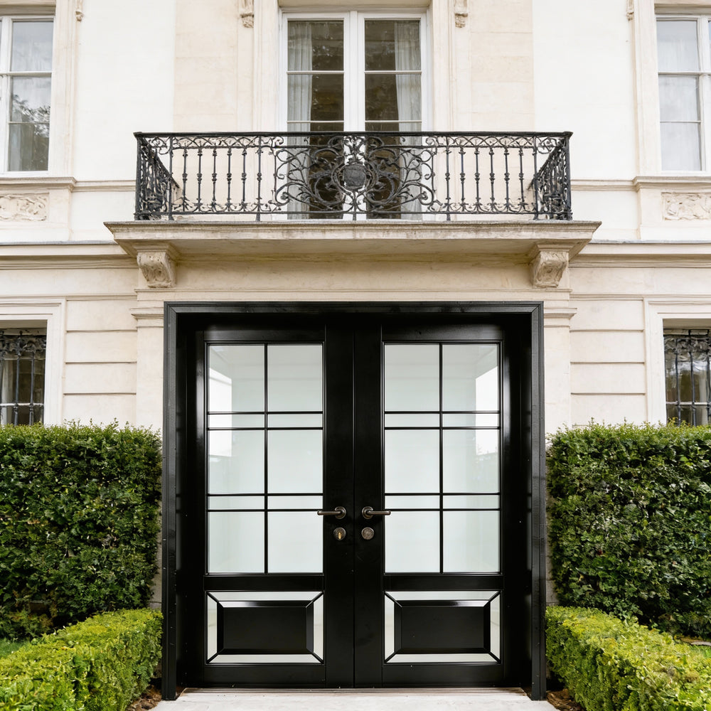 Model IWD979 is a masterclass in modern simplicity. With six textured glass inserts spaced evenly across each door leaf, this square-top iron entryway provides daylight access while maintaining privacy and clean geometry. Its matte black frame contrasts subtly against the light-filtering panels, and the streamlined vertical handles add balanced minimalism. Ideal for homes and commercial spaces with architectural precision in mind, this door blends style, symmetry, and dependable performance.