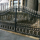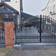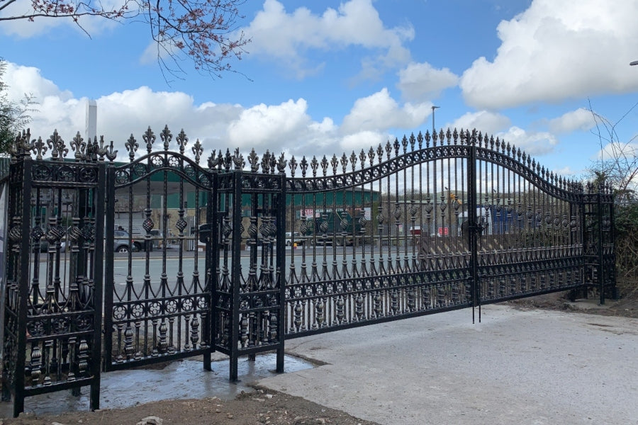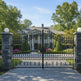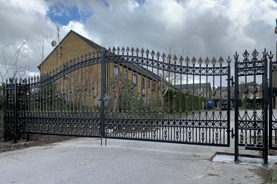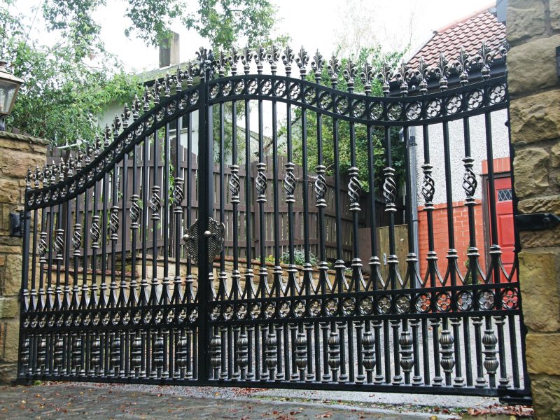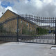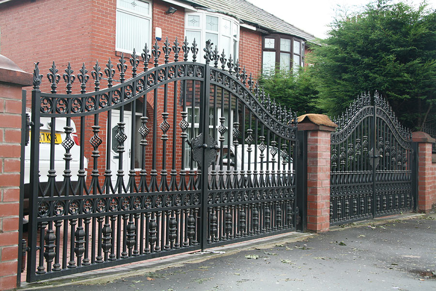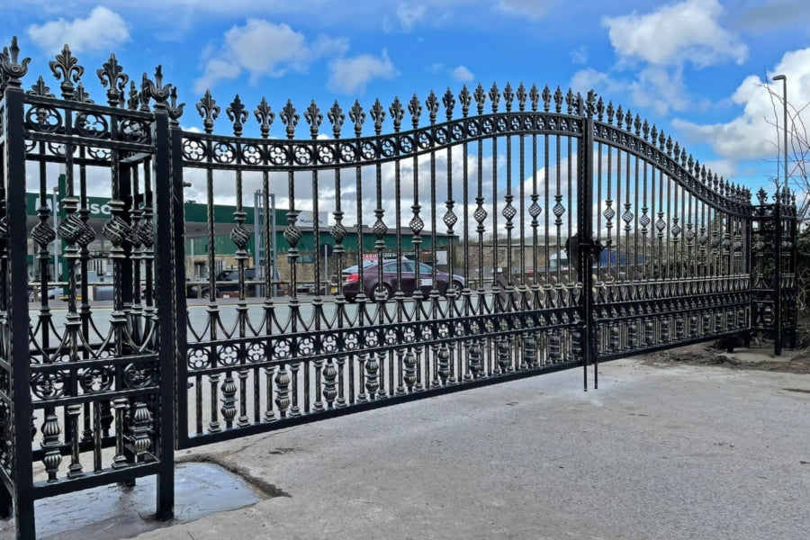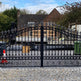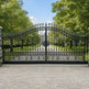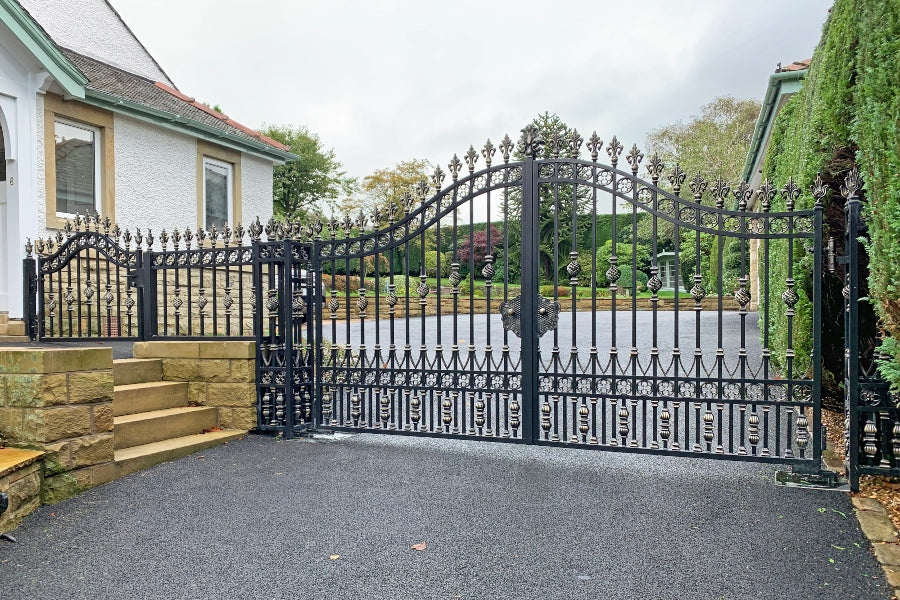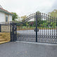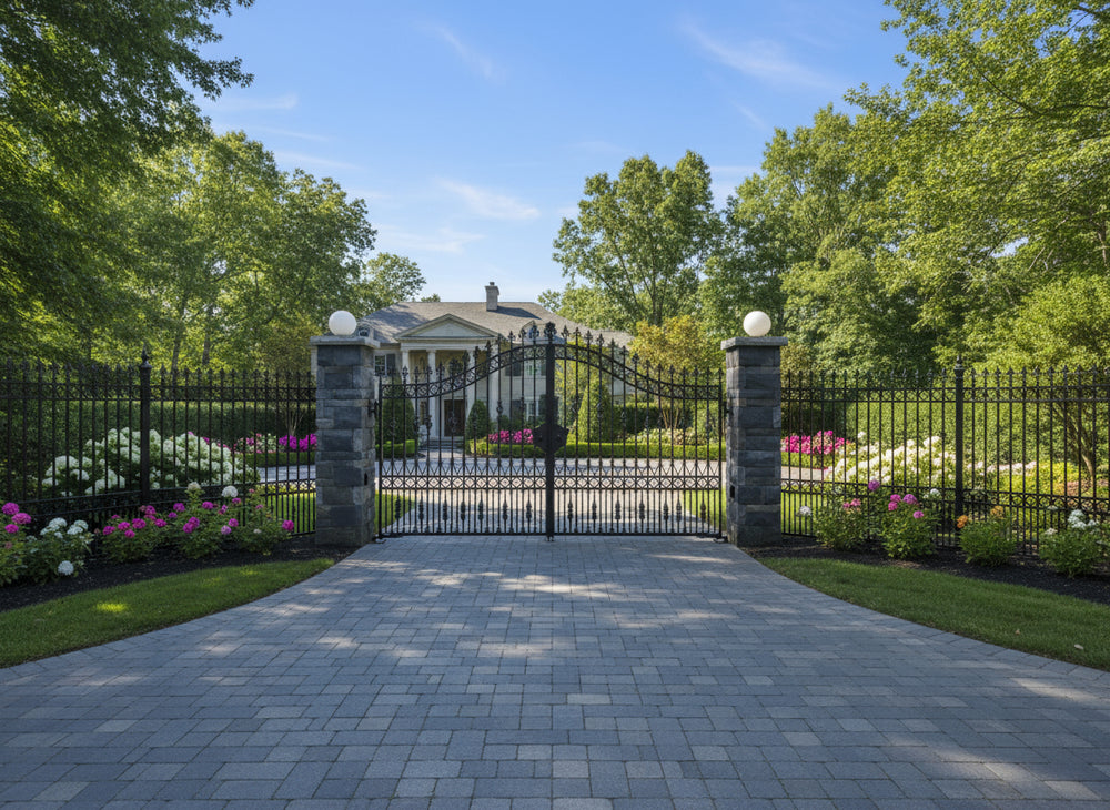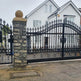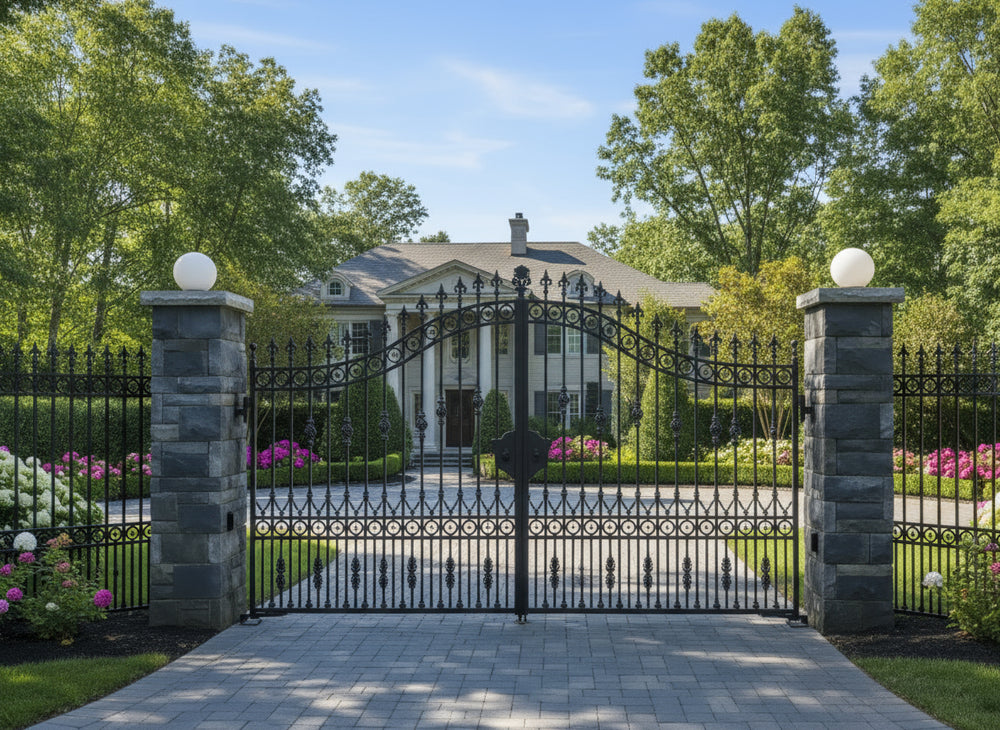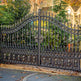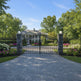 floral scroll wrought iron gate, spherical pillar estate gate, circular motif driveway gate, Canadian custom gate, Taimco decorative gate, luxury property gate, architectural ornamental gate, heavy-duty artistic gate design