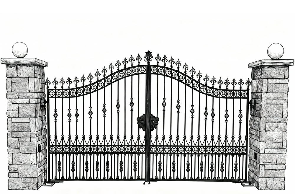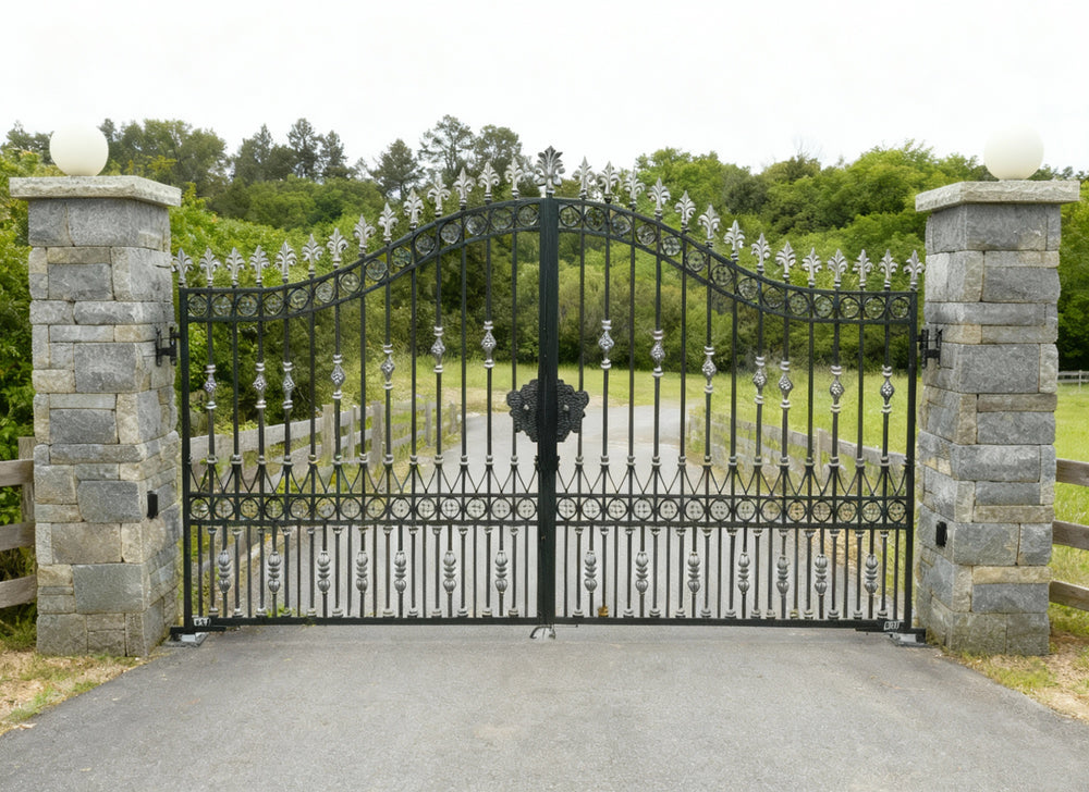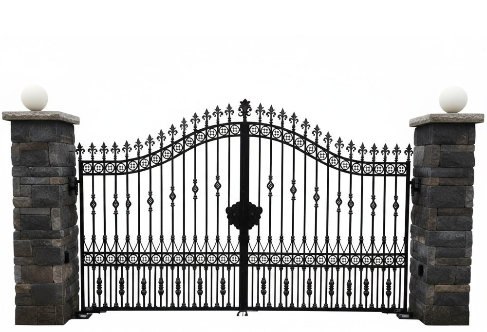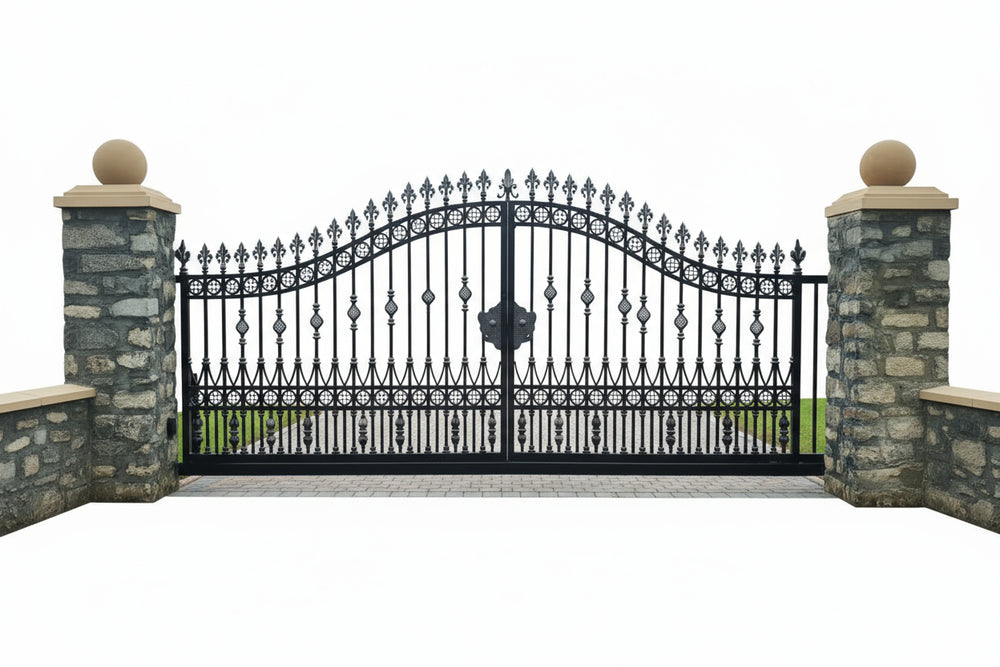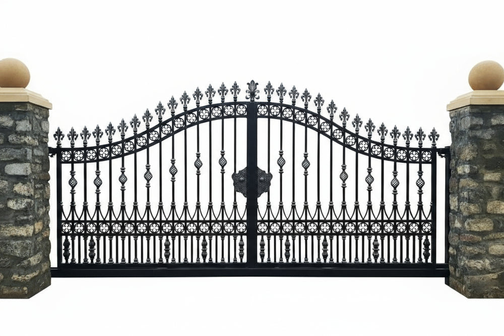 A gate that greets with grace and geometry. Orbcrest Harmony features dual swing panels crowned by a gentle arch, adorned with pointed finials, circular motifs, and a central floral emblem. The lower section includes vertical bars and ornamental scrollwork, while the flanking stone pillars—topped with flat caps and spherical ornaments—anchor the design in timeless sophistication. This gate evokes balance, craftsmanship, and refined presence.