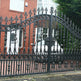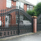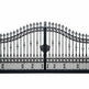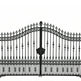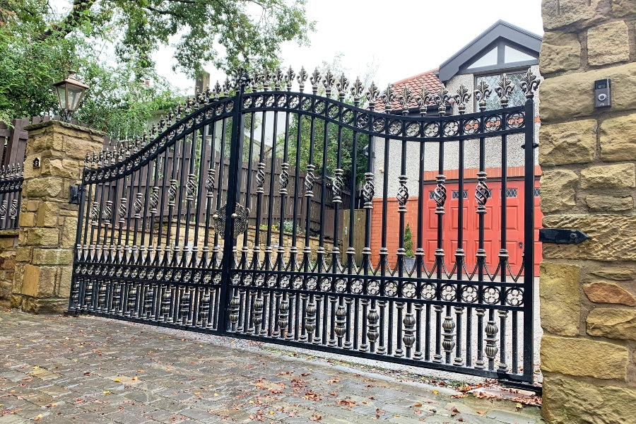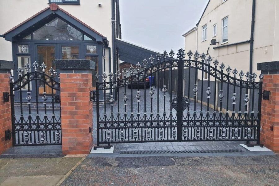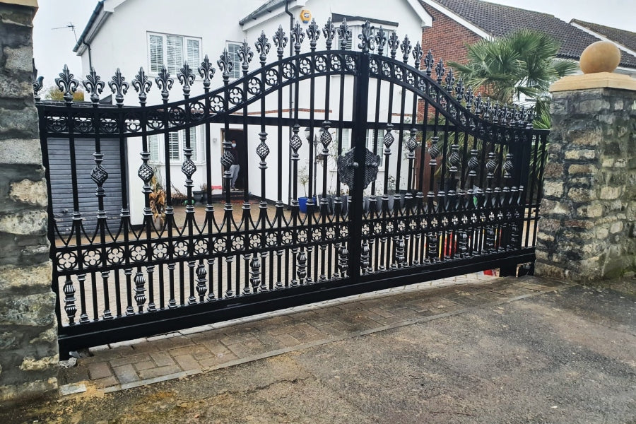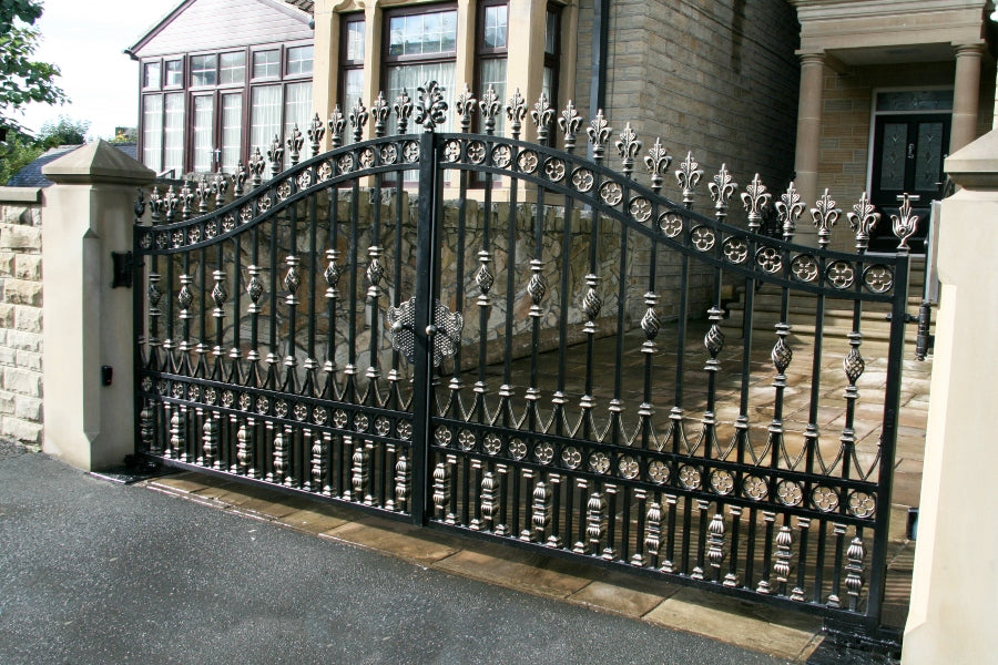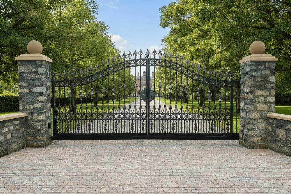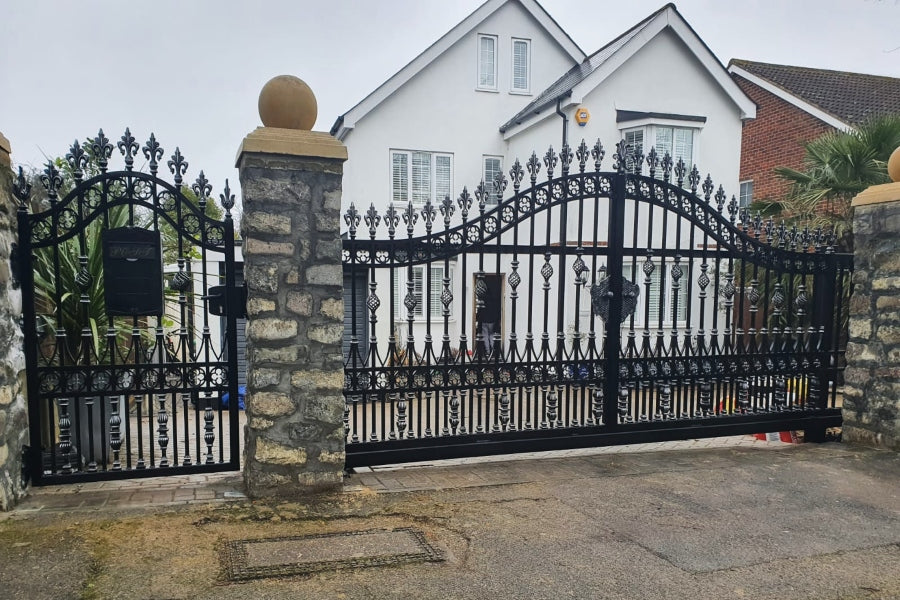 A gate that greets with grace and geometry. Orbcrest Harmony features dual swing panels crowned by a gentle arch, adorned with pointed finials, circular motifs, and a central floral emblem. The lower section includes vertical bars and ornamental scrollwork, while the flanking stone pillars—topped with flat caps and spherical ornaments—anchor the design in timeless sophistication. This gate evokes balance, craftsmanship, and refined presence.