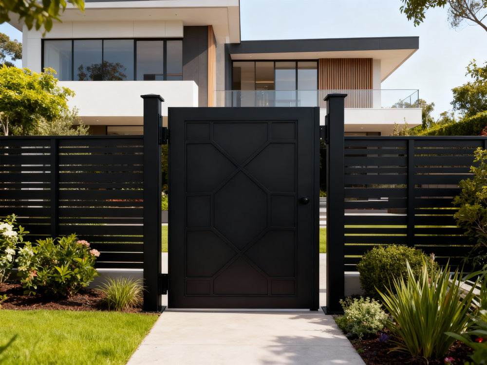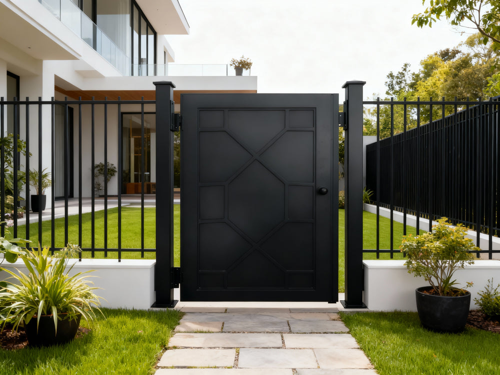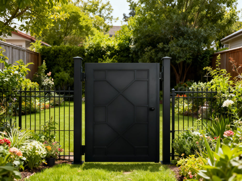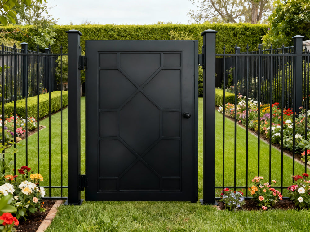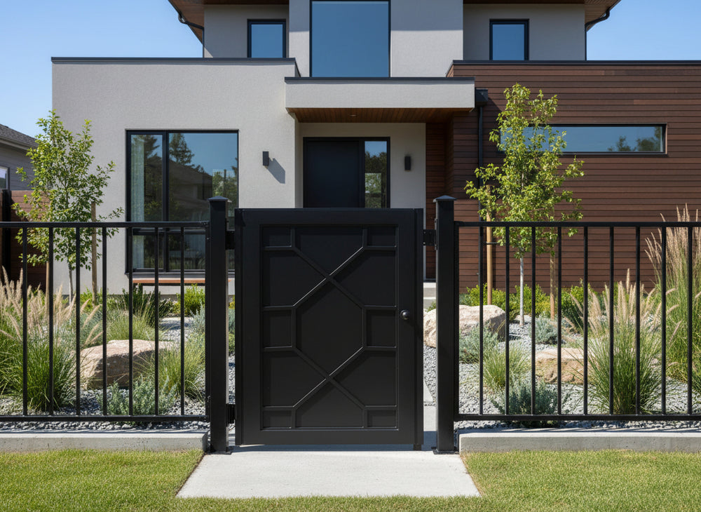 modern grid man door, circular motif metal gate, geometric security entry, Canadian custom gate, Taimco architectural passage door, manual operation estate gate