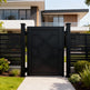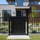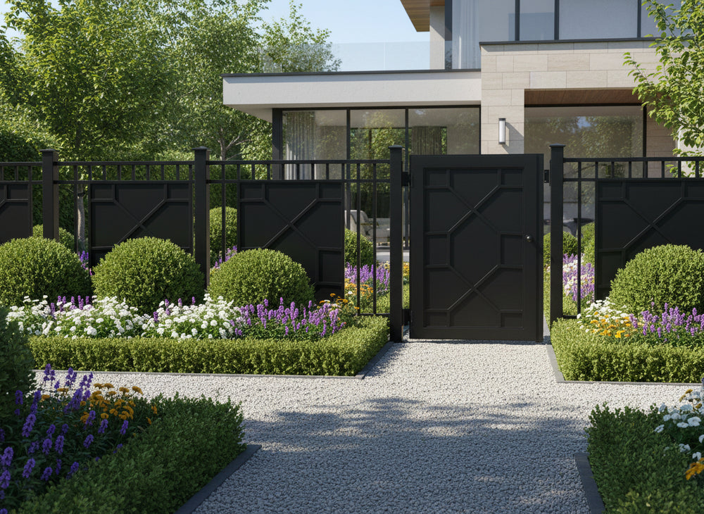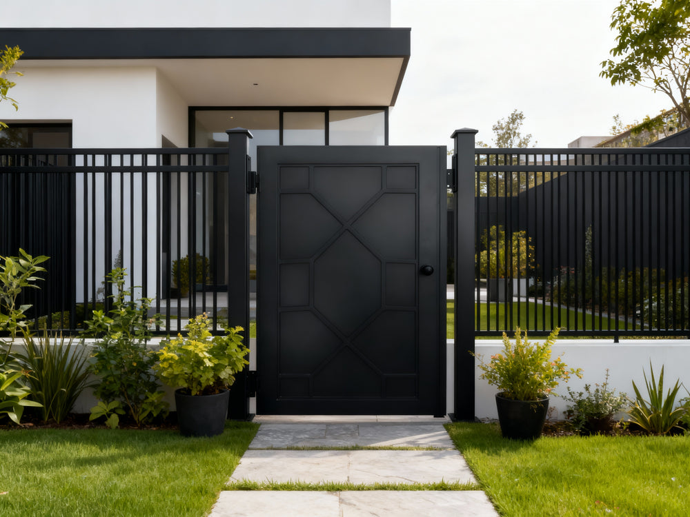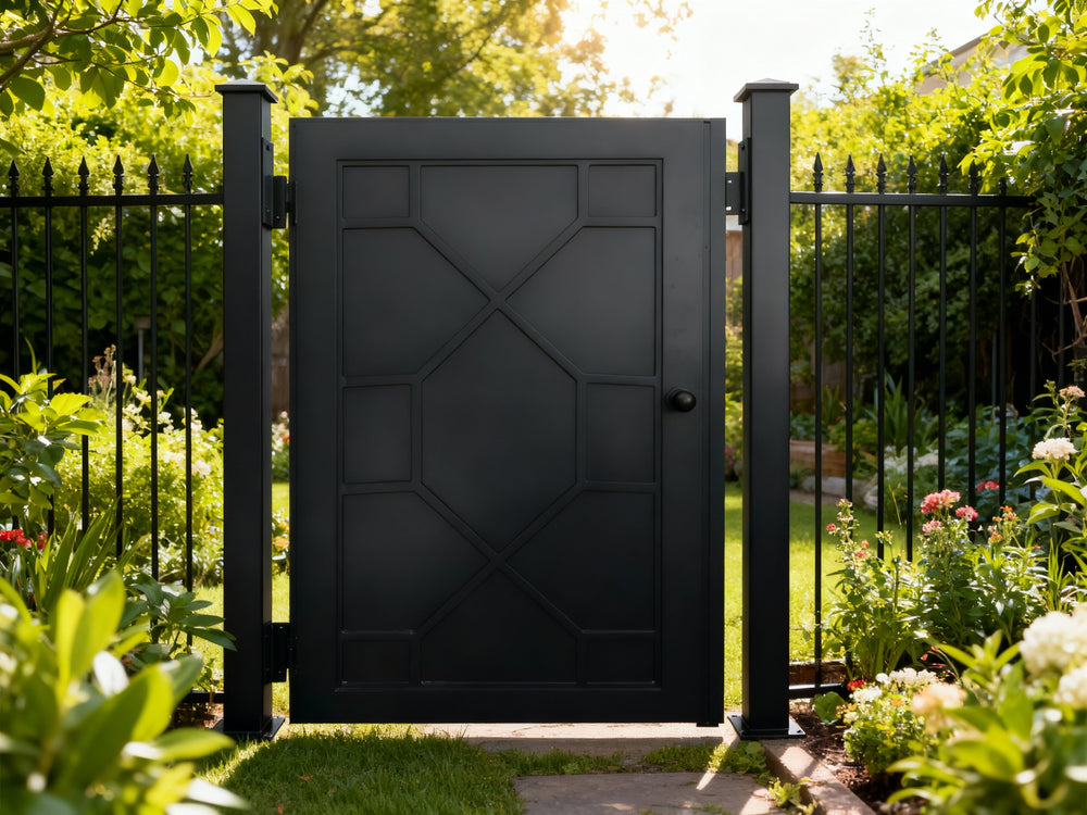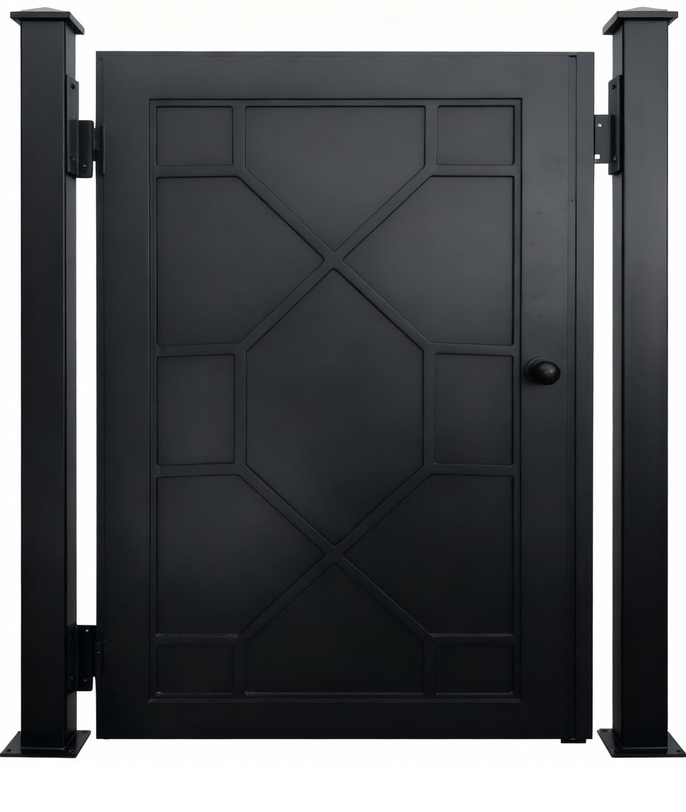 modern grid man door, circular motif metal gate, geometric security entry, Canadian custom gate, Taimco architectural passage door, manual operation estate gate