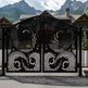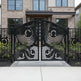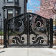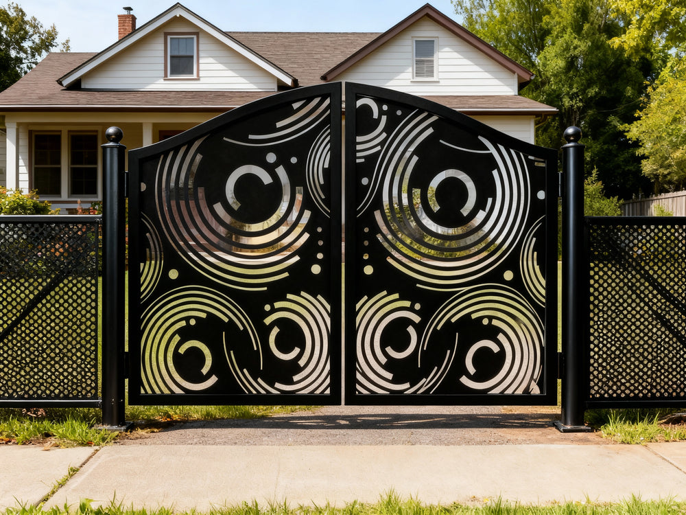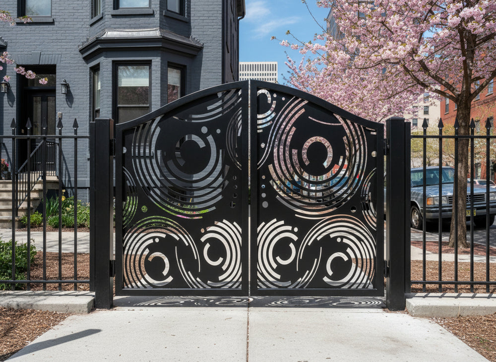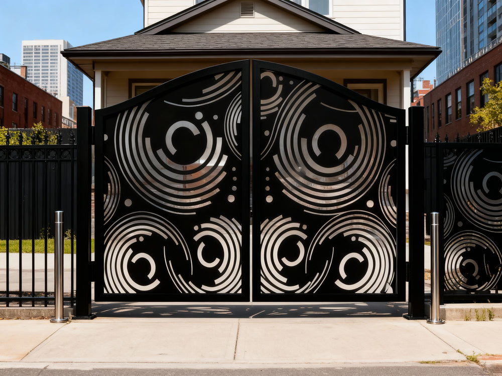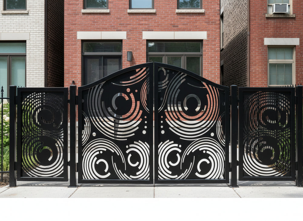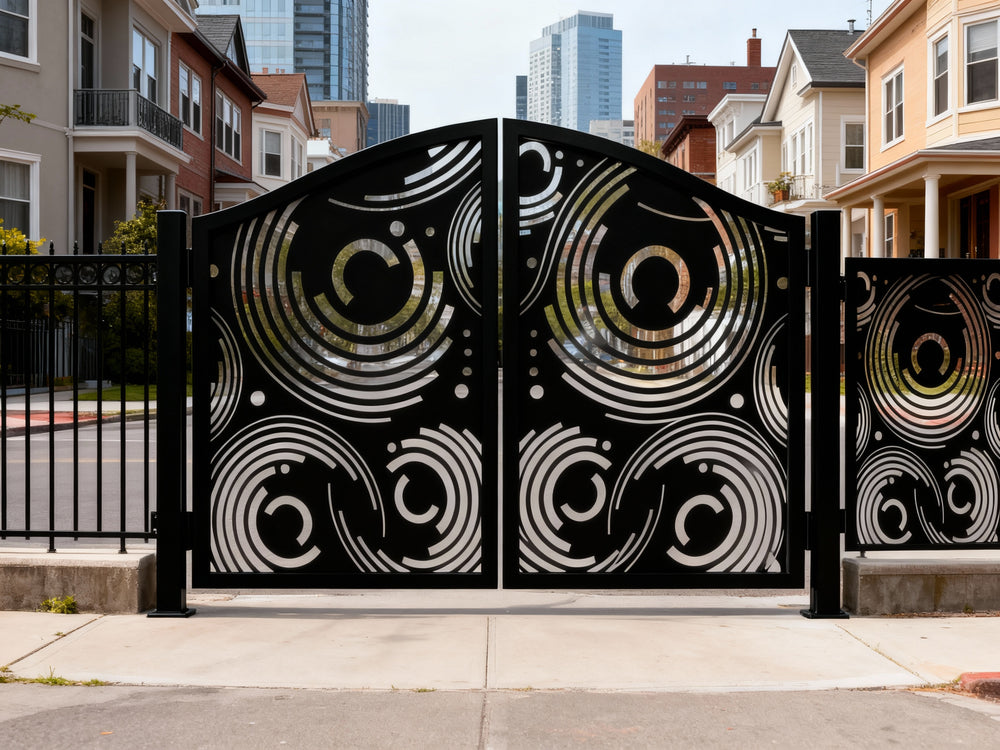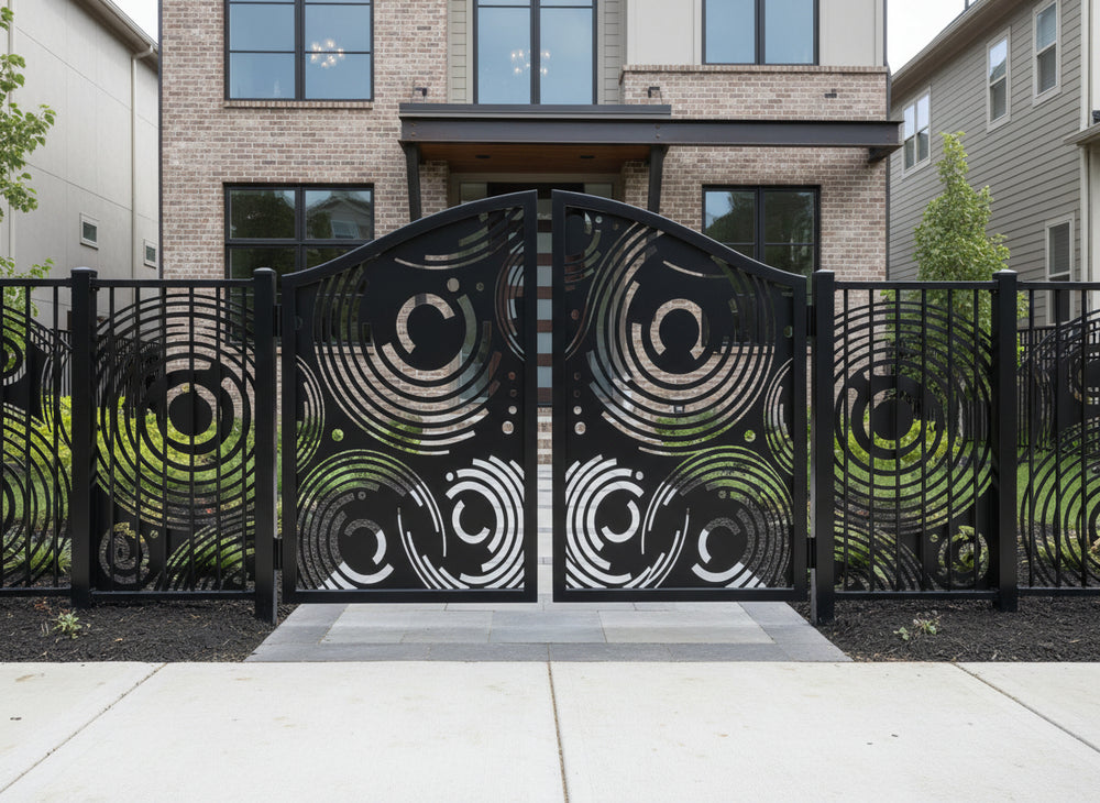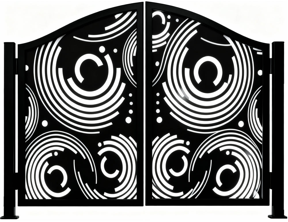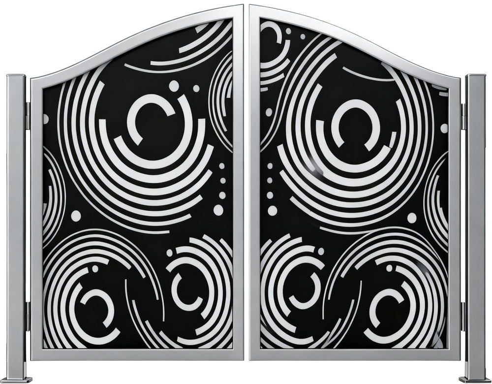 A door that pulses with precision. Orbitveil Passage features two symmetrical panels with concentric circular and semi-circular motifs, interspersed with arc segments and dot accents. The curved top edges and metallic silver frame add elegance and contrast, making this gate ideal for modern estates, architectural entries, or decorative boundaries that blend cosmic rhythm with artistic clarity.