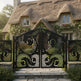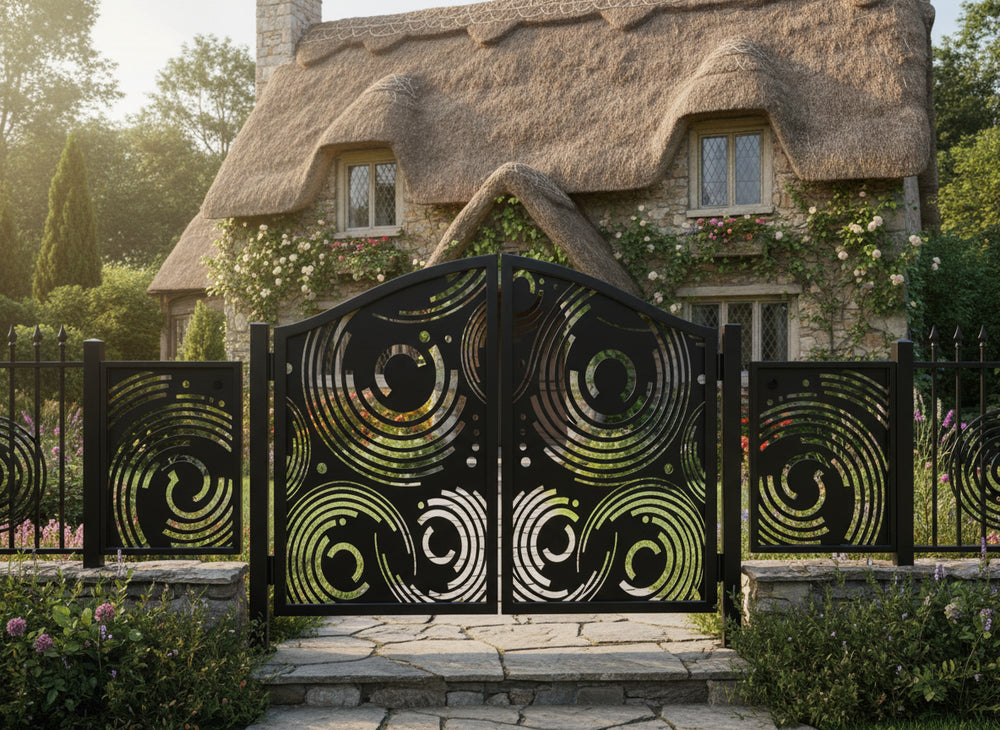 concentric ring man door, arc-dot metal gate, modern cosmic garden entry, Canadian custom gate, Taimco architectural passage door, manual operation estate gate