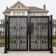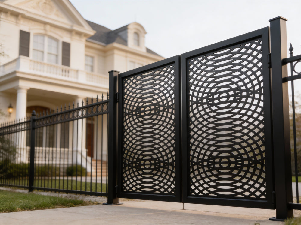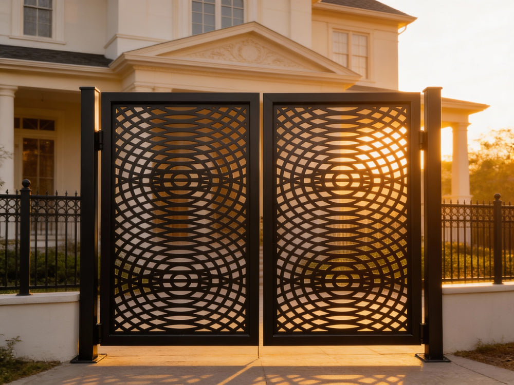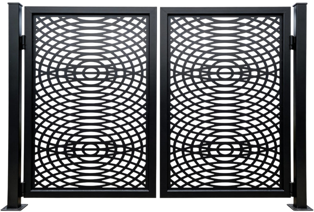 orbital lattice man door, geometric metal gate, concentric circle garden entry, Canadian custom gate, Taimco Orbitveil Passage model, manual operation decorative door