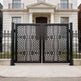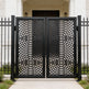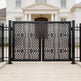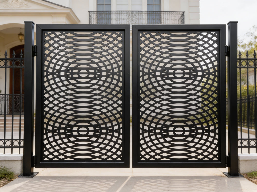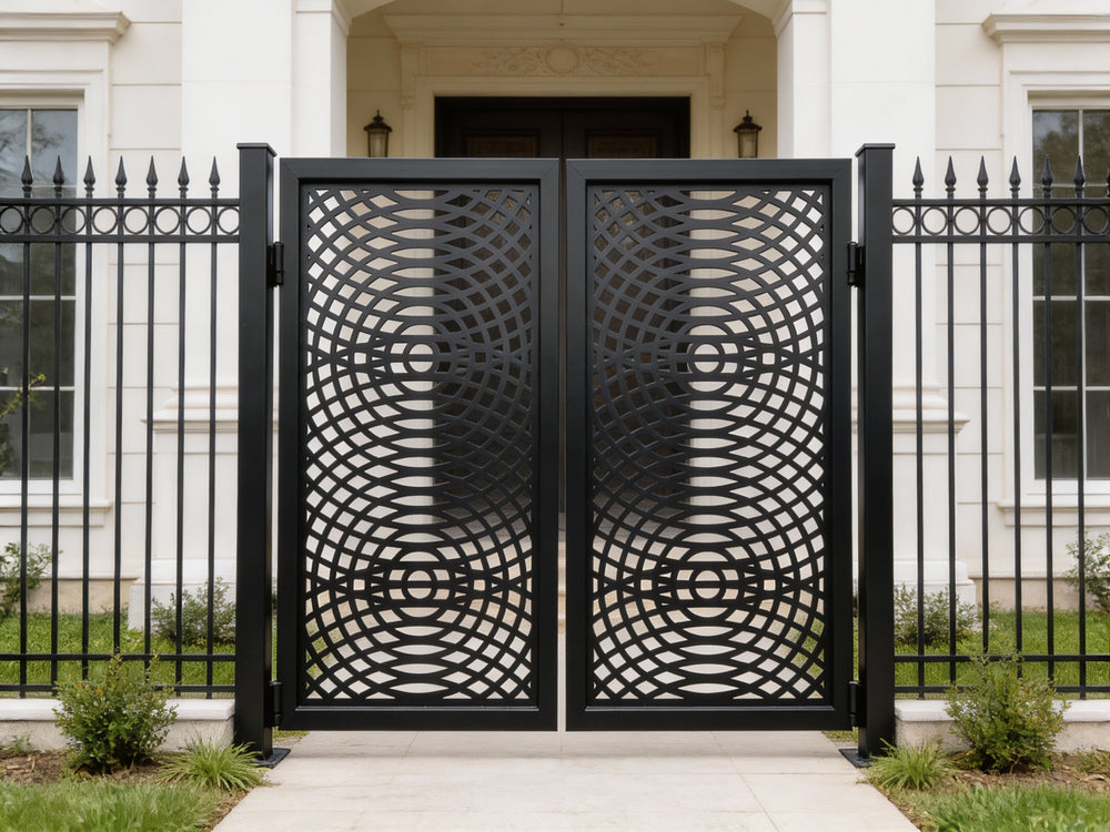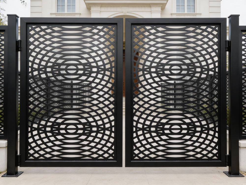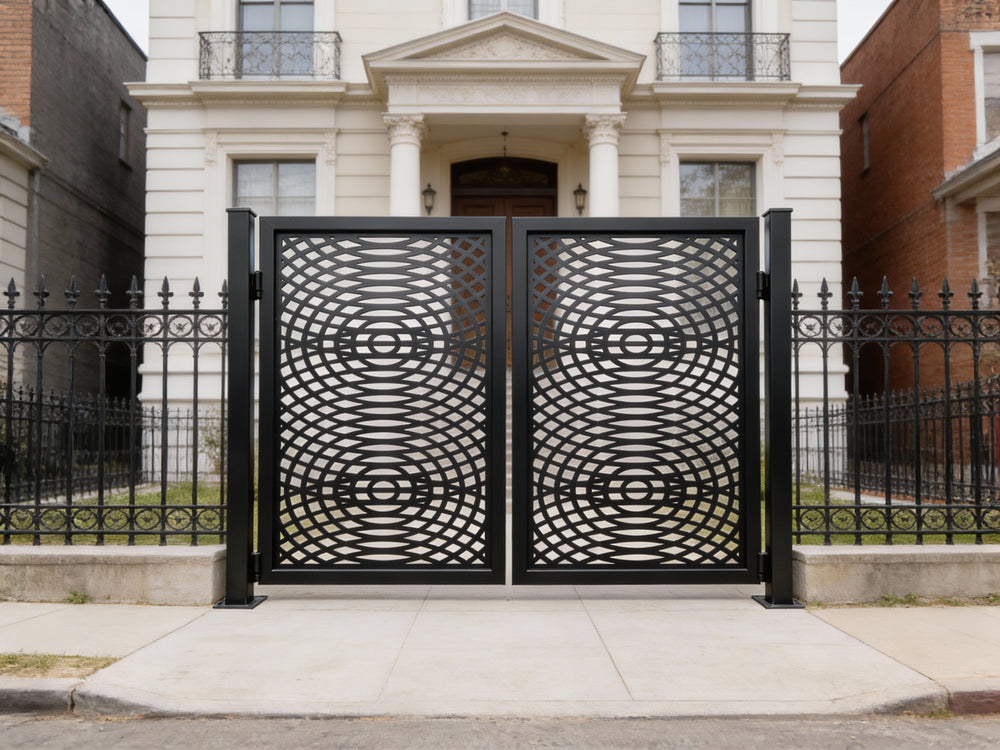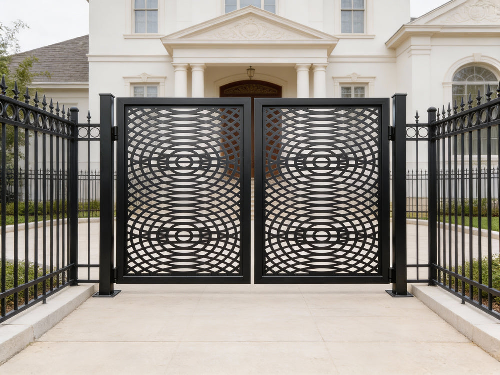 A door that balances motion and symmetry. Orbitveil Passage features two mirrored panels framed in matte black, each showcasing concentric circles intersected by horizontal and vertical lines. The design evokes planetary rhythm and architectural precision, offering partial visibility and airflow with bold visual impact. Ideal for garden entries, residential walkways, or modern transitions, this man door blends geometric elegance with secure craftsmanship.