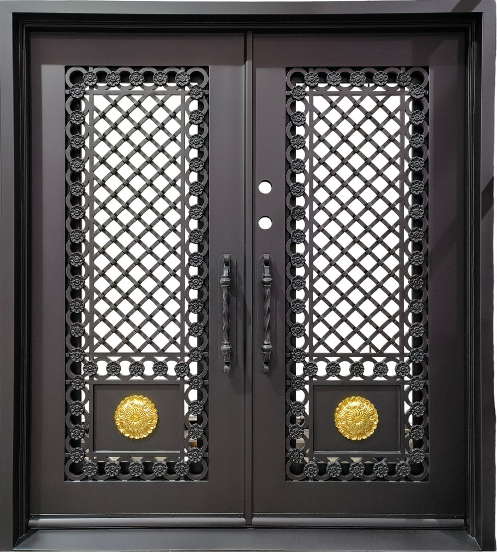 Make a grand entrance with the IWD 1066 double wrought iron doors by Taimco. Crafted from hot-dipped, powder-coated galvanized steel, these doors feature elegant lattice scrollwork and signature golden medallions for a luxurious visual punch. Pre-hung for easy installation and built to endure Canadian weather, this model blends timeless artistry with top-tier security.