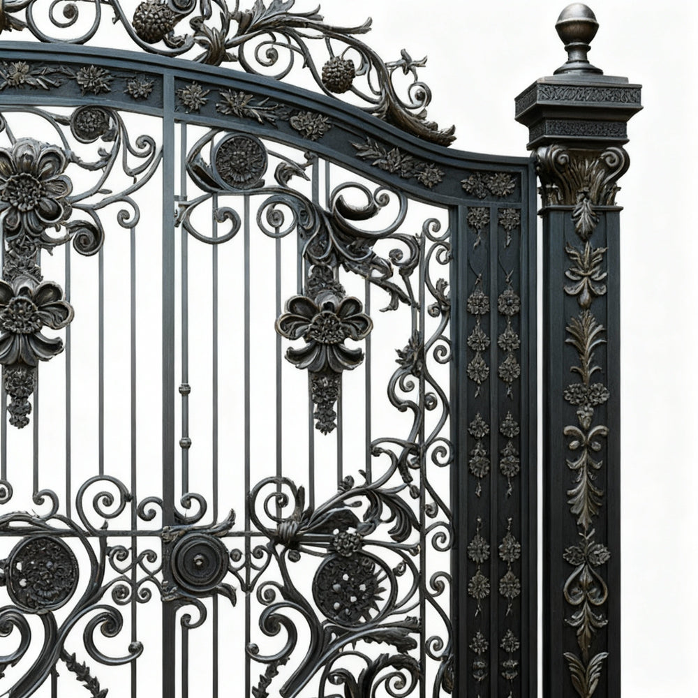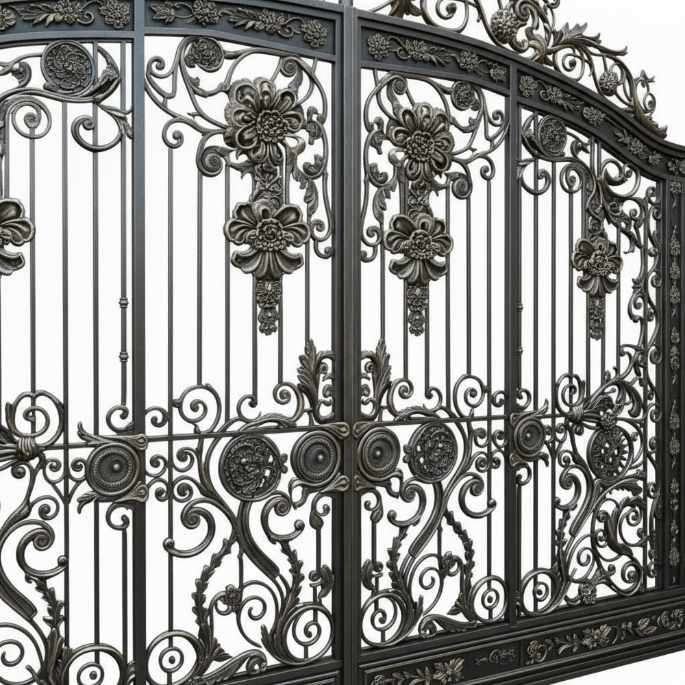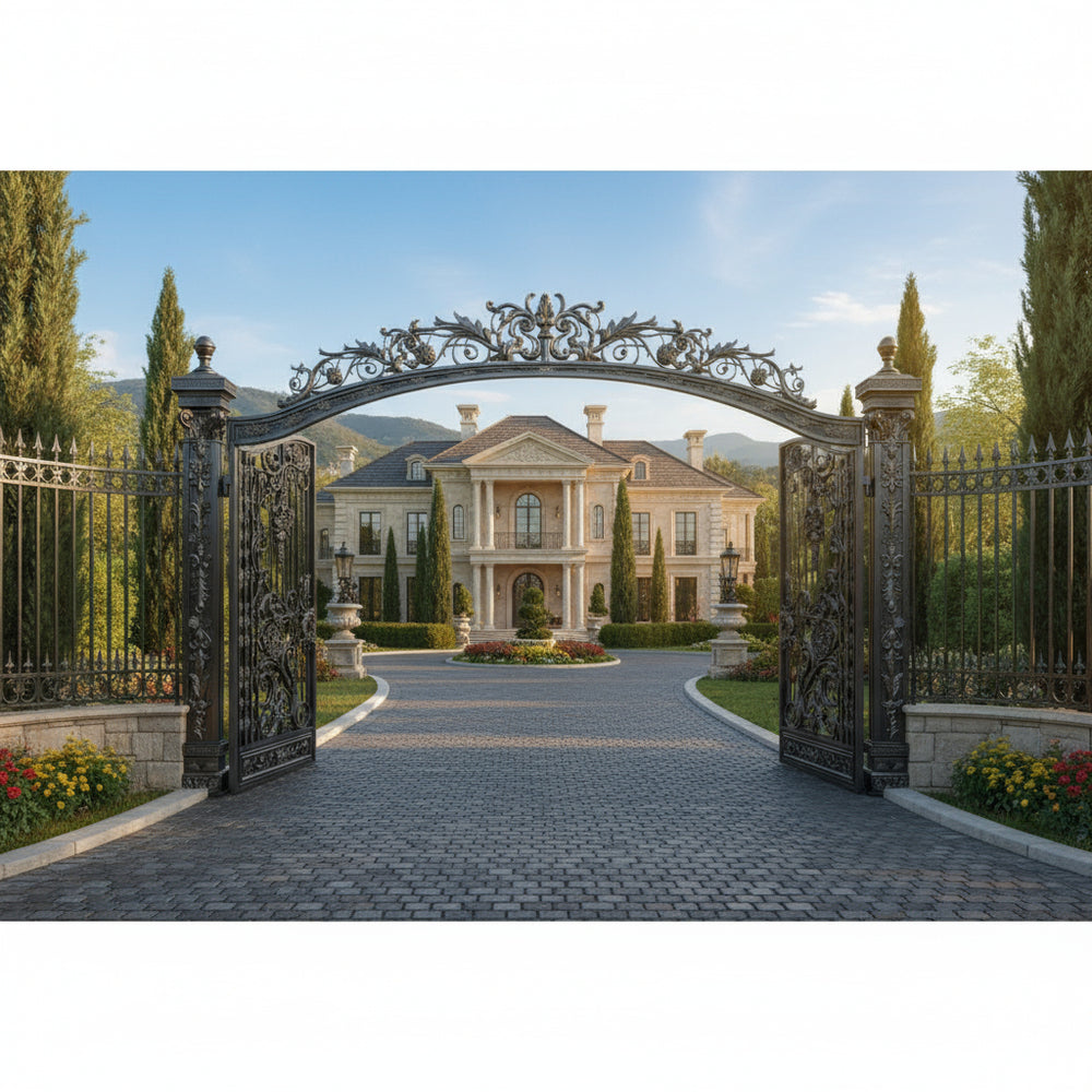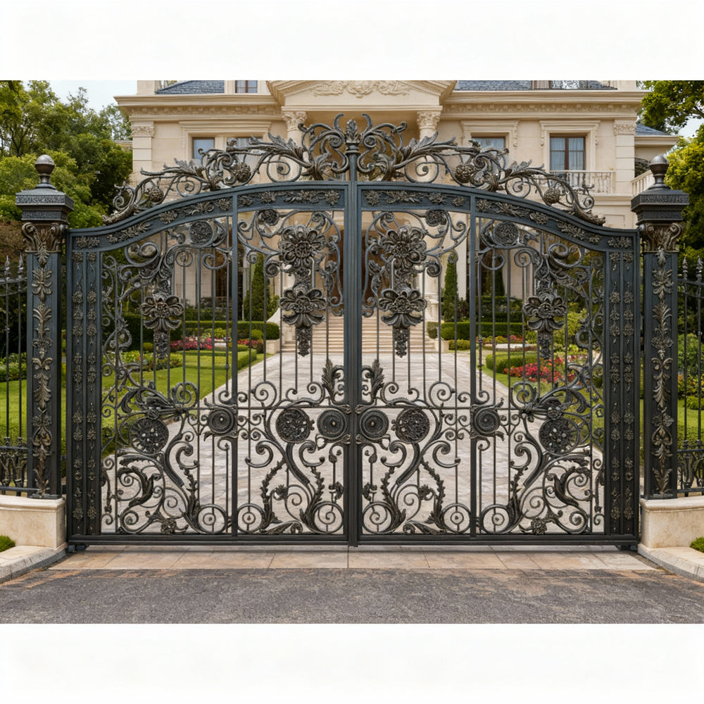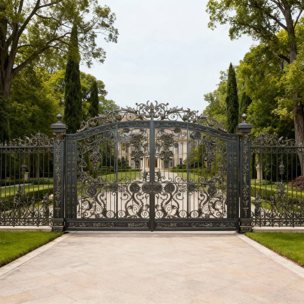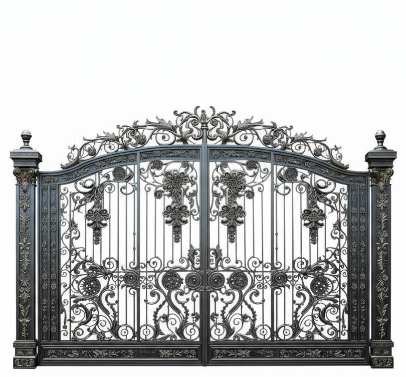 A gate that rises with elegance. Crestarch Reverie features dual swing panels adorned with mirrored floral and vine scrollwork, crowned by a central crest flourish and arched silhouette. The flanking posts echo the ornamental rhythm, creating a unified architectural statement. This gate evokes legacy, artistry, and timeless refinement—perfect for estates that demand presence and poetic symmetry.