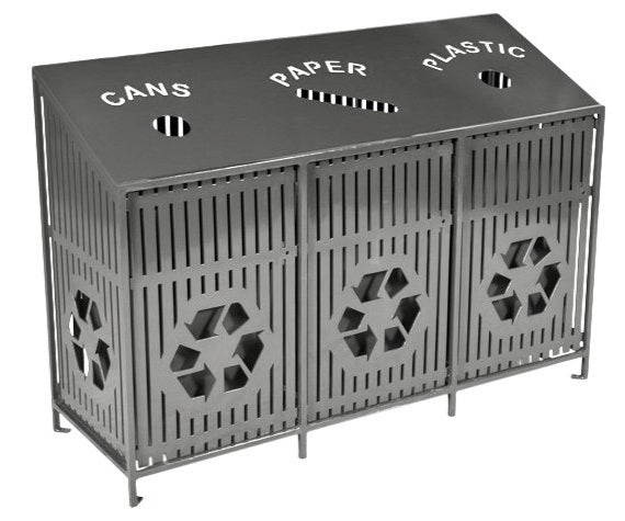 Designed for efficiency and clarity, the three-stream recycling system helps users easily separate waste with laser-cut labeling and distinct opening shapes—a slanted slot for paper and circular openings for cans and plastic. Includes three removable 38-gallon rigid plastic liners for convenient maintenance.