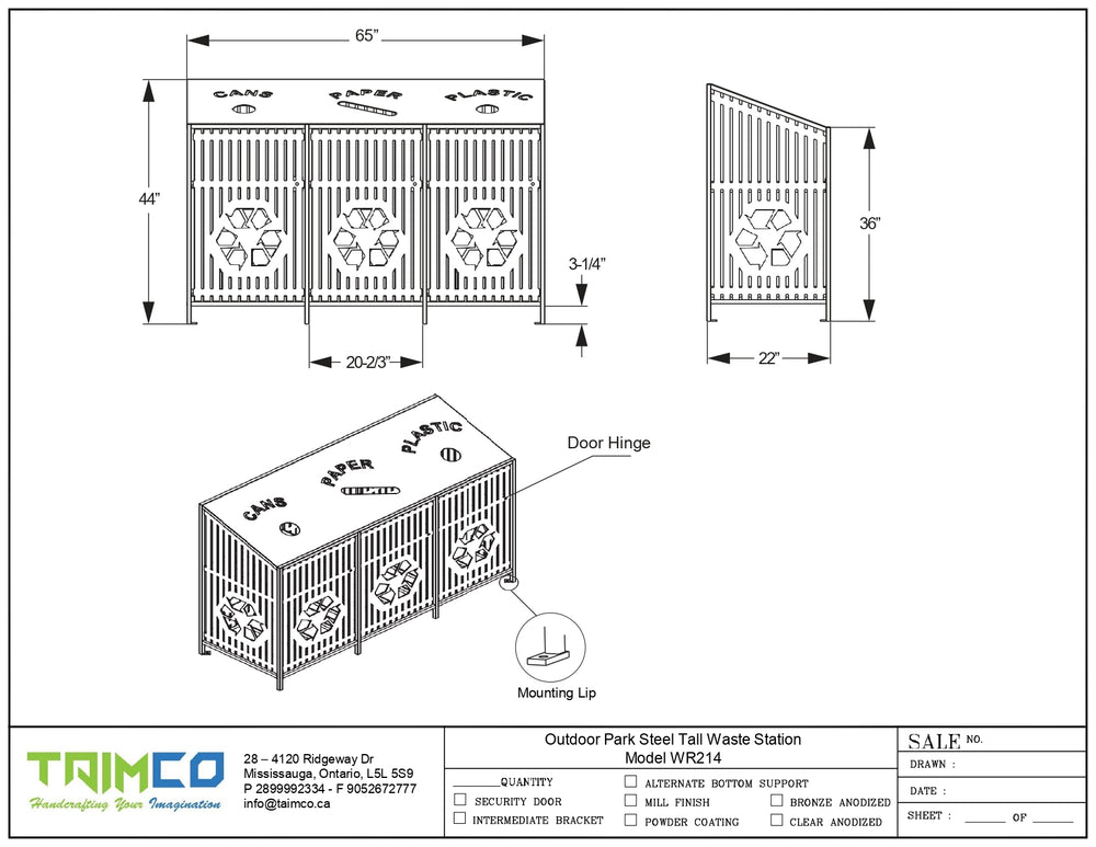 Outdoor recycling bin, steel recycling station, three-stream waste bin, commercial recycling container, TAIMCO WR214, powder-coated recycling bin, eco-friendly waste management, park recycling receptacle.