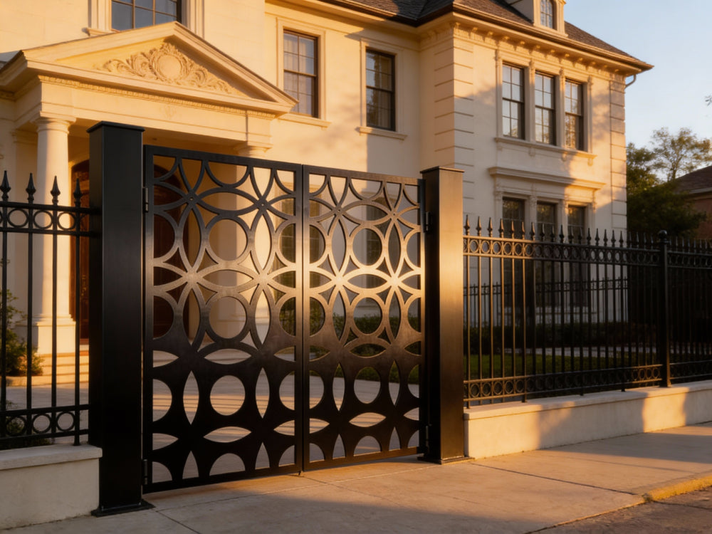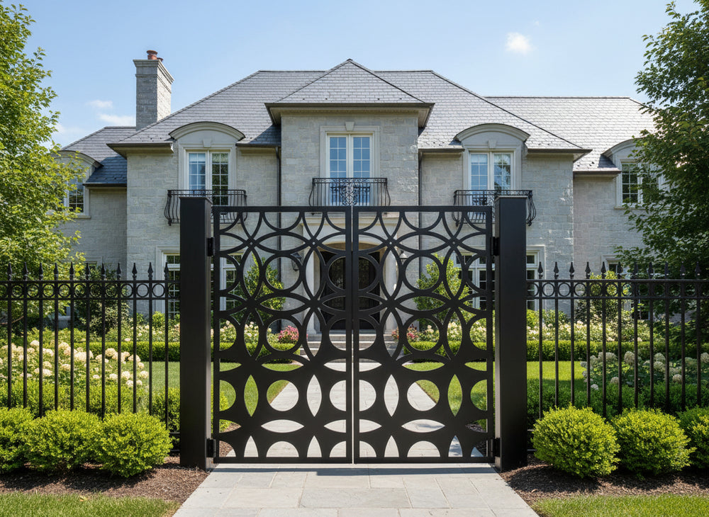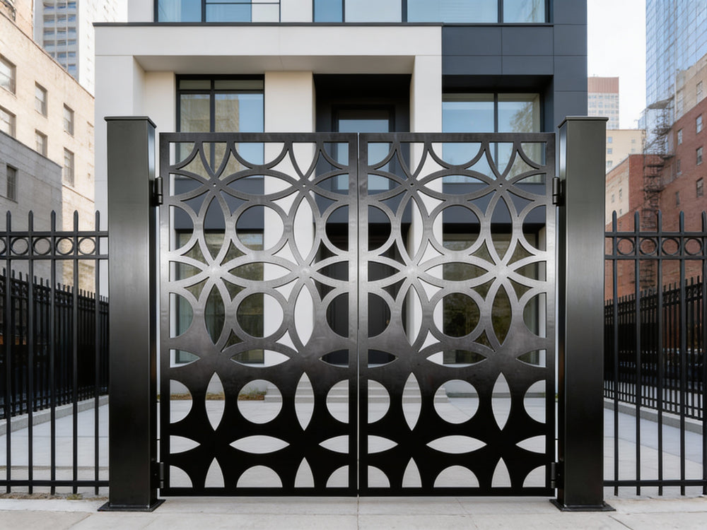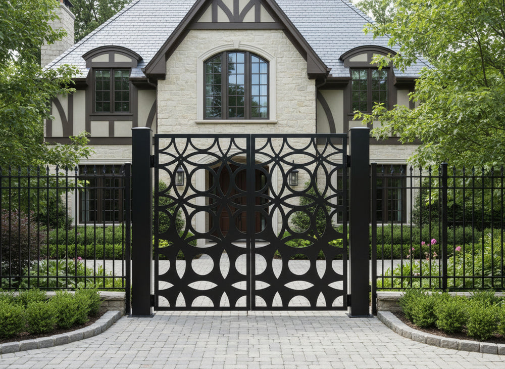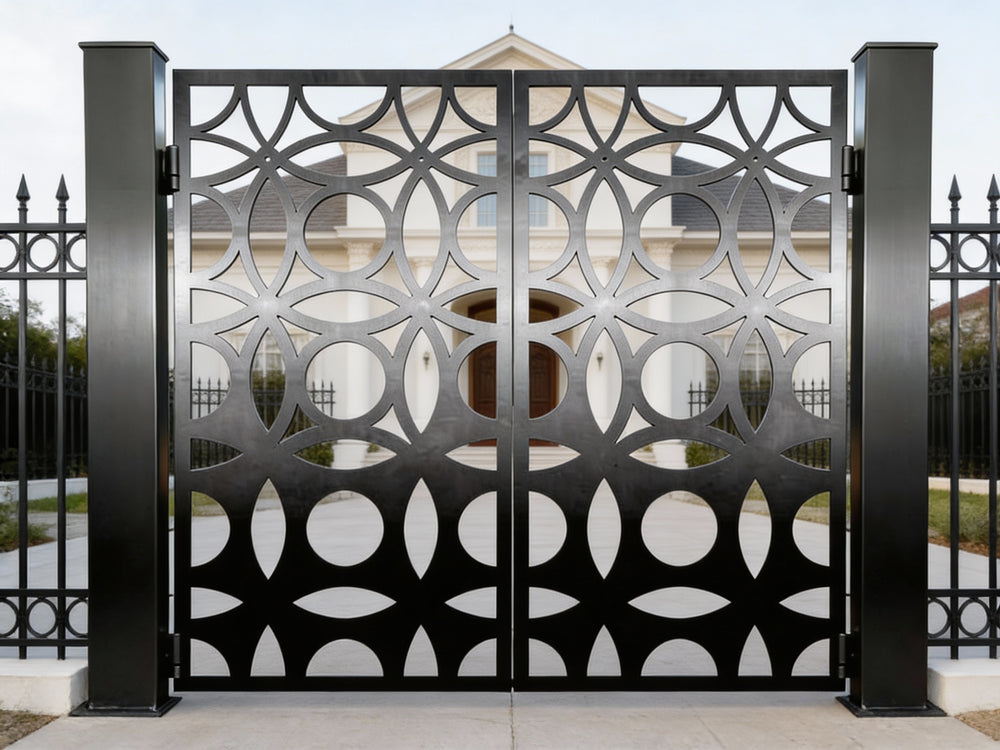 A door that flows with modern rhythm. Ovalveil Passage features two symmetrical panels framed in matte black, each showcasing a repeating pattern of interlocking ovals and circles. The laser-cut design offers partial visibility and airflow while delivering contemporary elegance and architectural precision. Ideal for garden entries, residential walkways, or boutique transitions, this man door blends geometric artistry with secure craftsmanship.