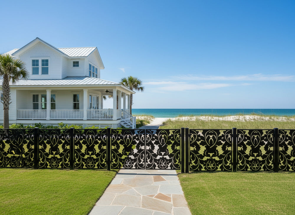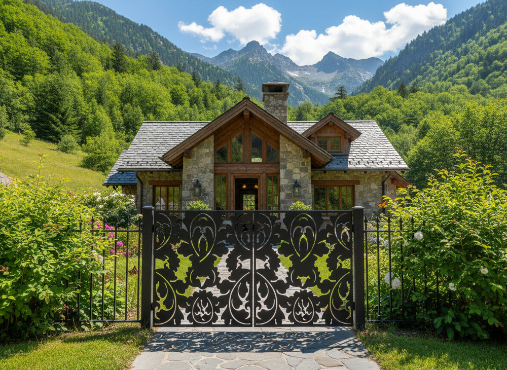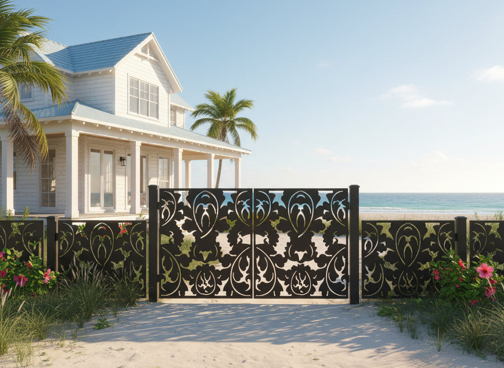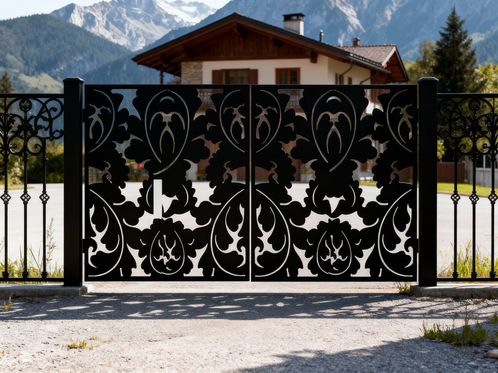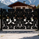 A door that frames nature in symmetry. Ovalvine Passage features two mirrored panels with stylized organic shapes—leaves, vines, and abstract flourishes—enclosed within oval frames. The black-and-white contrast highlights the intricate cut-outs, making this gate ideal for garden entries, courtyard transitions, or architectural boundaries that blend ornamental elegance with secure craftsmanship.