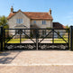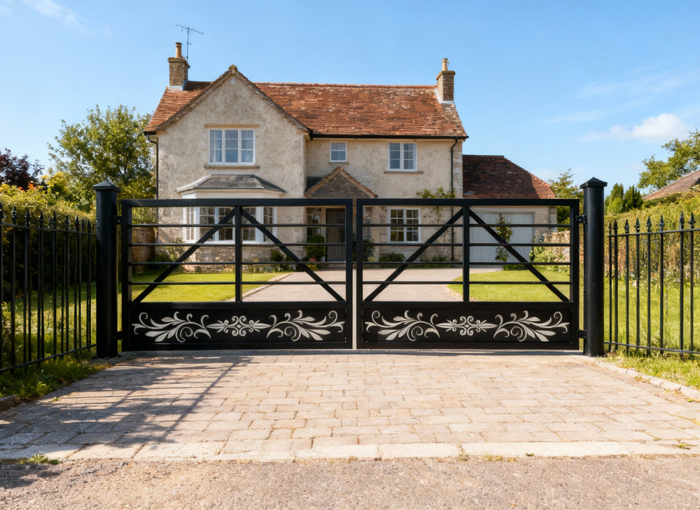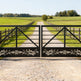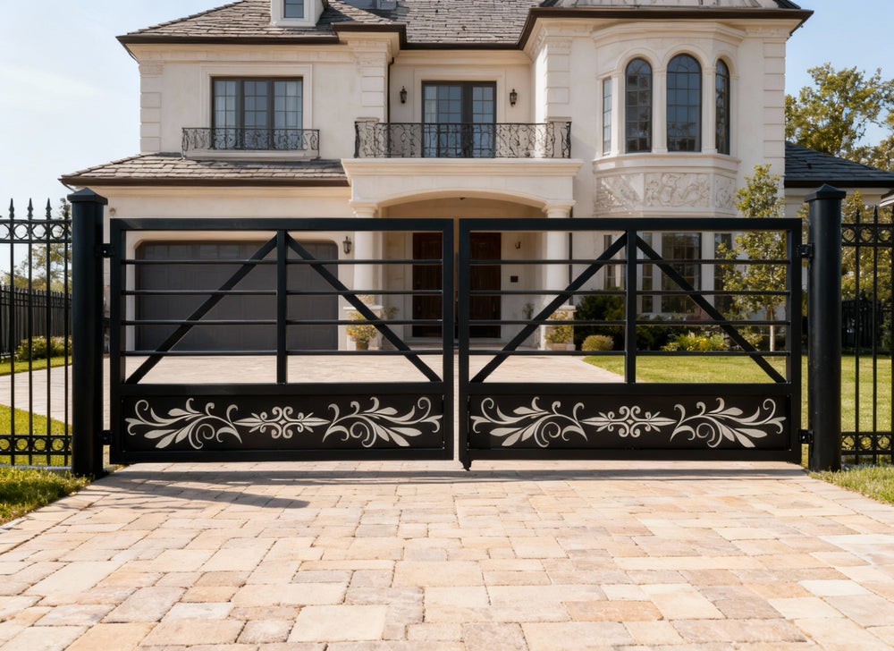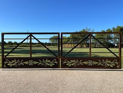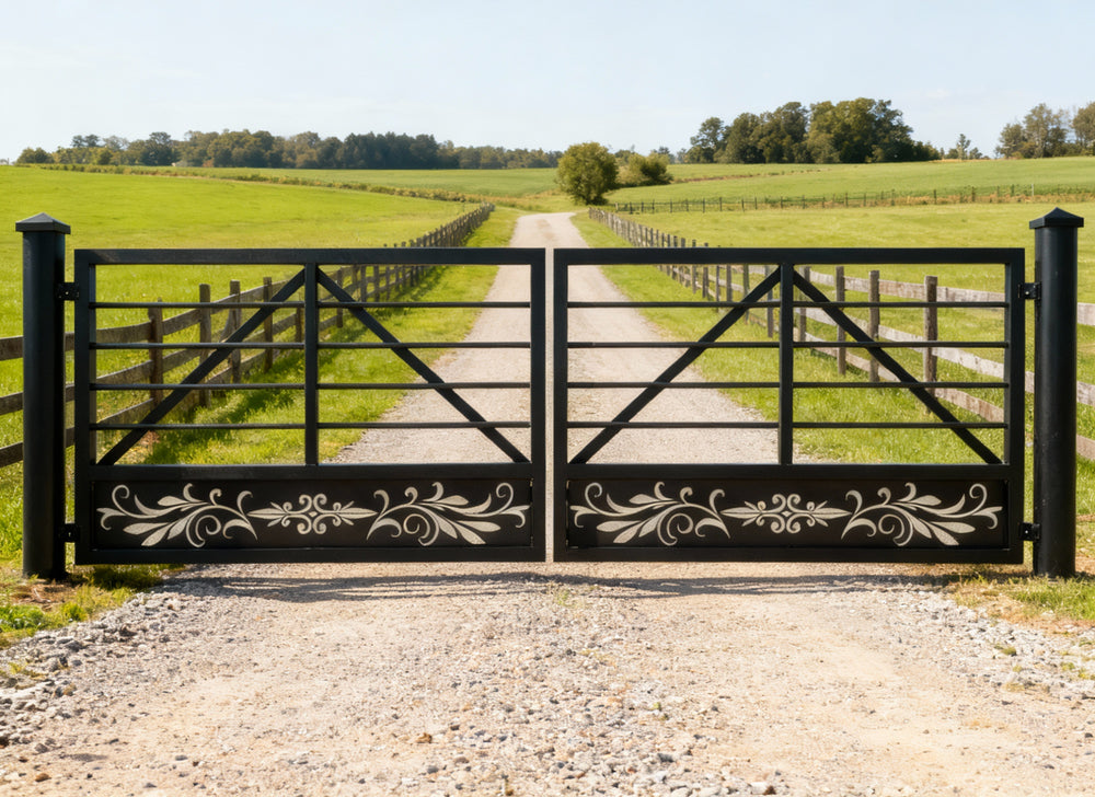 decorative steel driveway gate, floral and geometric gate design, custom metal entrance gate, Canadian artistic gate, farm estate gate, Taimco driveway gate, ornamental outdoor gate, heavy-duty decorative gate, landscape-inspired gate