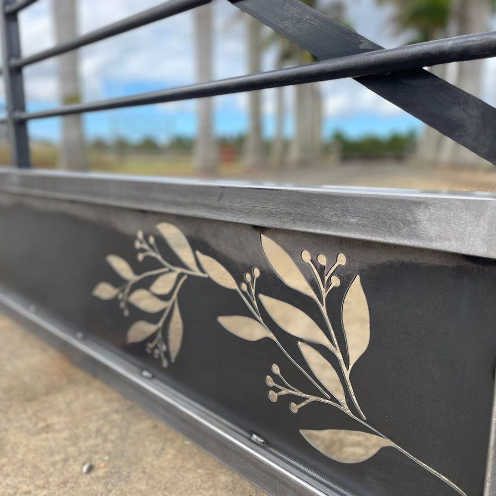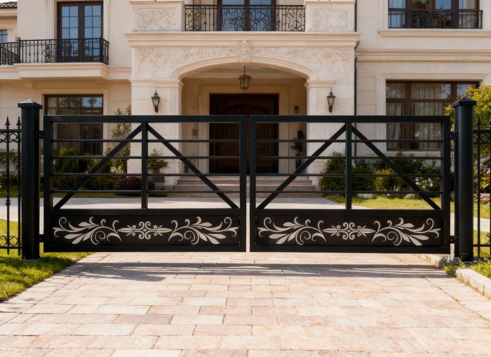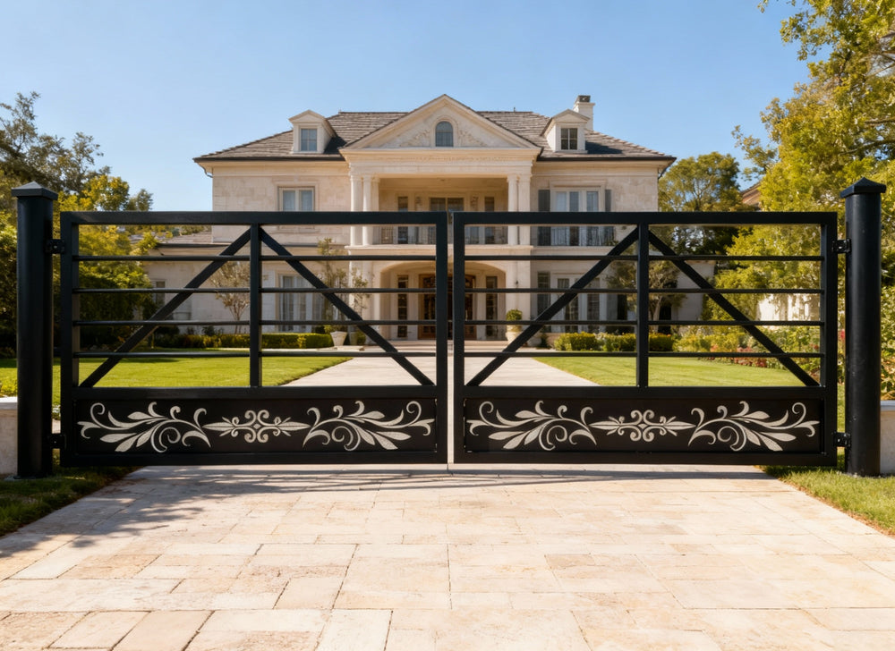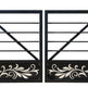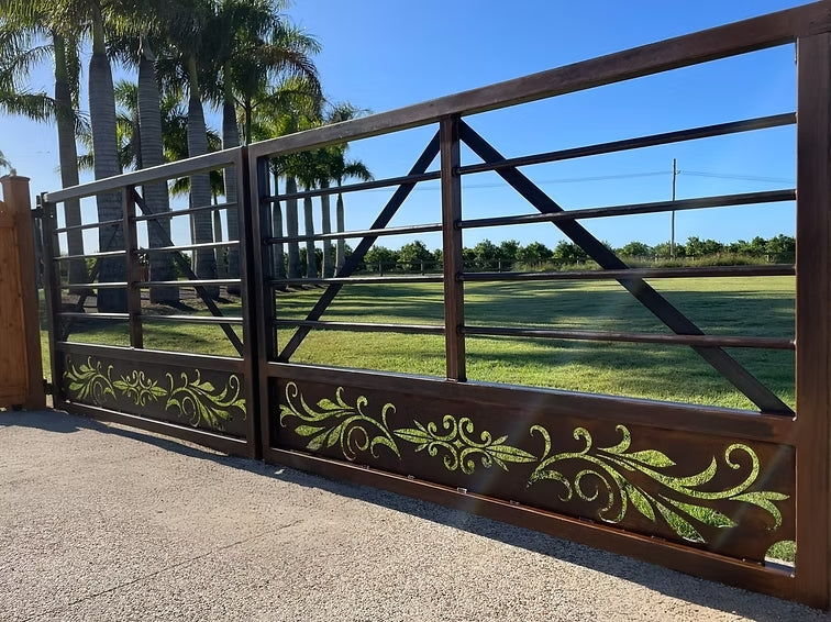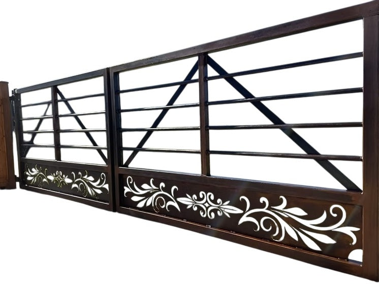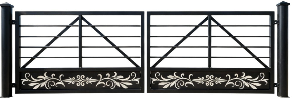 Welcome guests with a gate that reflects the harmony of nature and design. PalmVista Bloom features a striking combination of diagonal and horizontal bars in the upper section and ornate floral motifs in the lower panels. Set against a backdrop of palm trees and open sky, this gate is ideal for estates, farms, or properties that value both structure and softness.