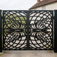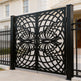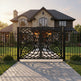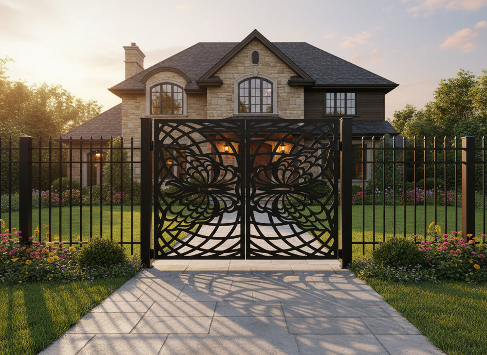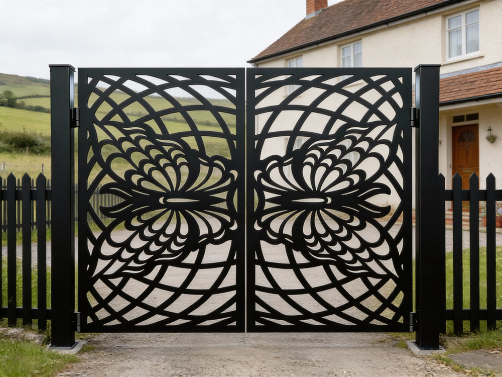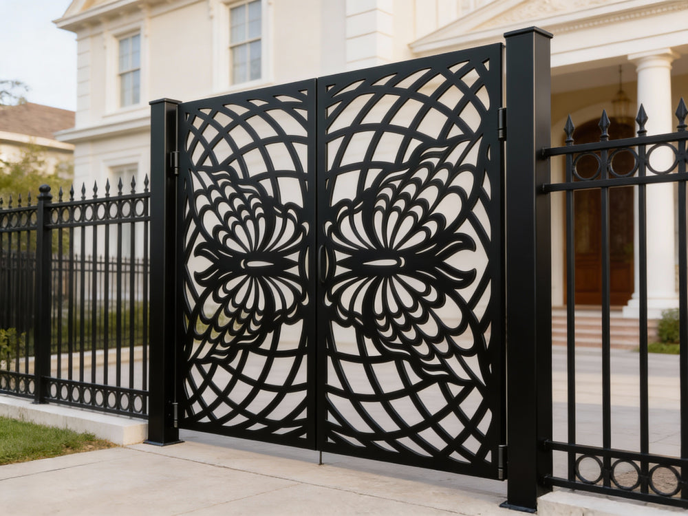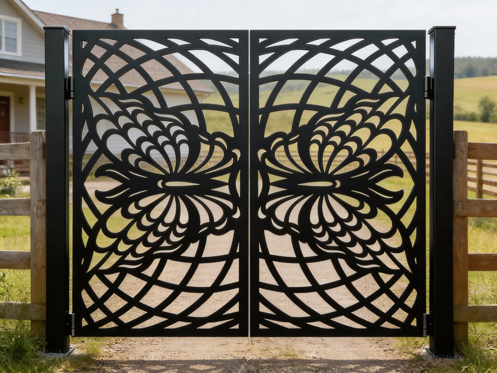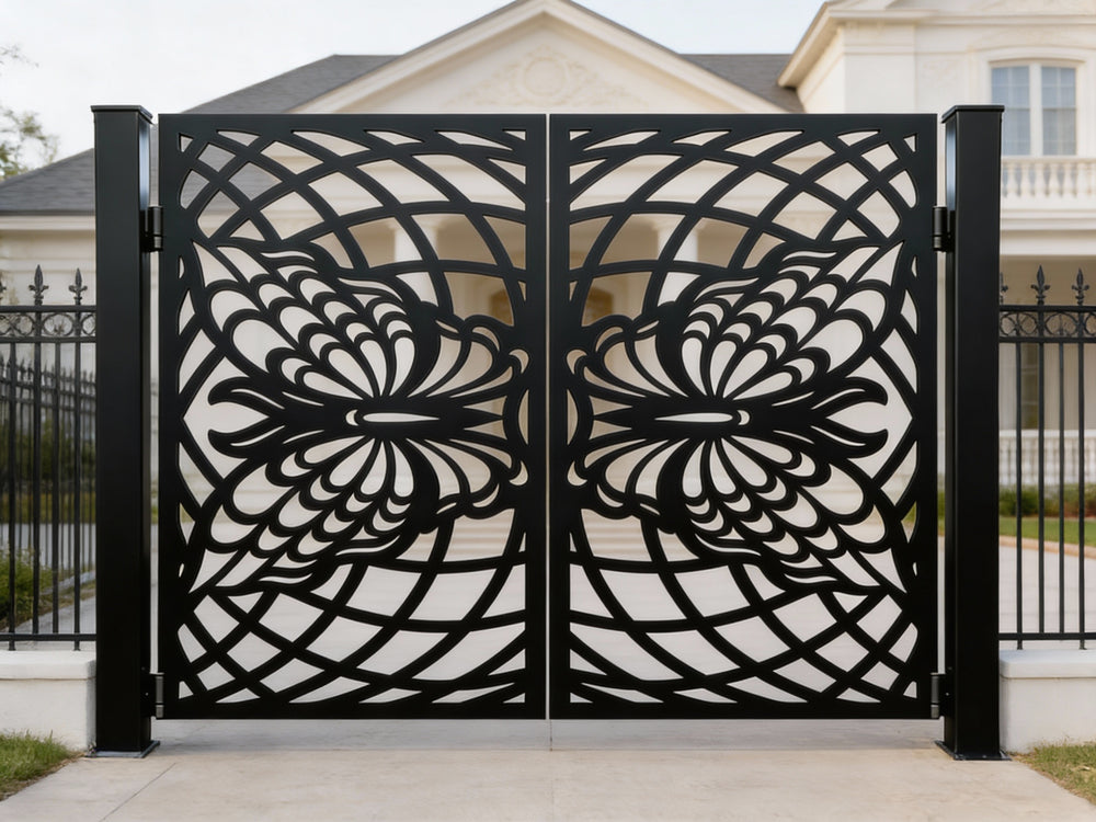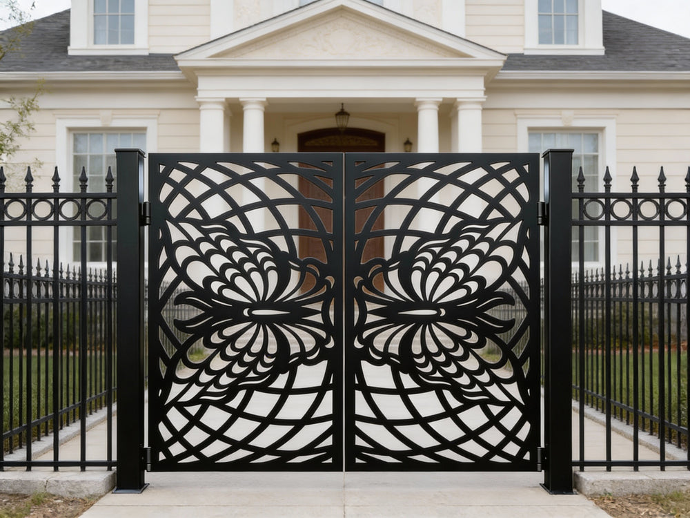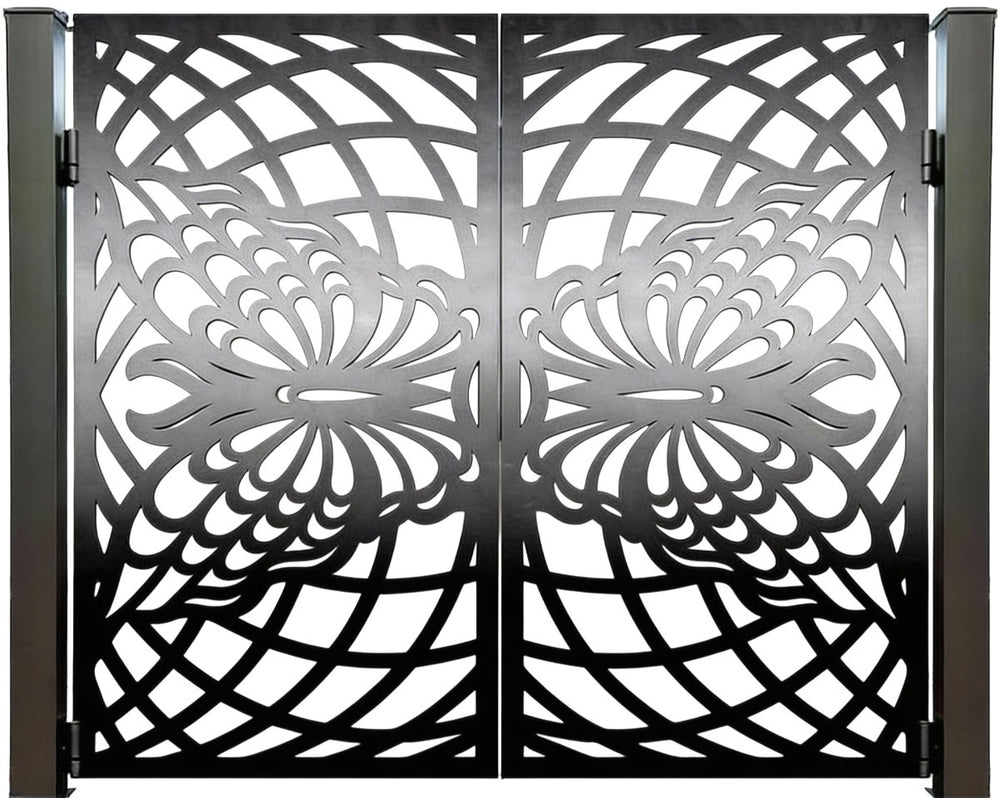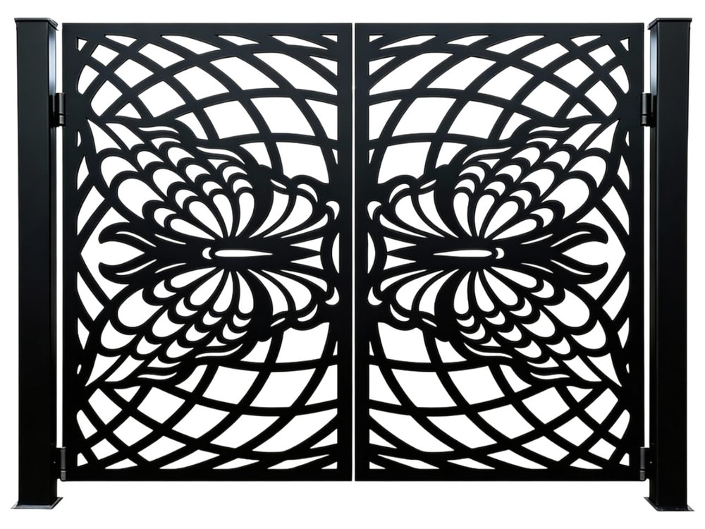 A door that flutters with elegance and precision. Papillonveil Passage features two symmetrical panels framed in matte black, each showcasing a central butterfly-like motif surrounded by a web of angular latticework. The laser-cut design offers partial visibility and airflow while delivering architectural drama and ornamental charm. Ideal for garden entries, boutique walkways, or residential transitions, this man door blends organic symbolism with secure craftsmanship.