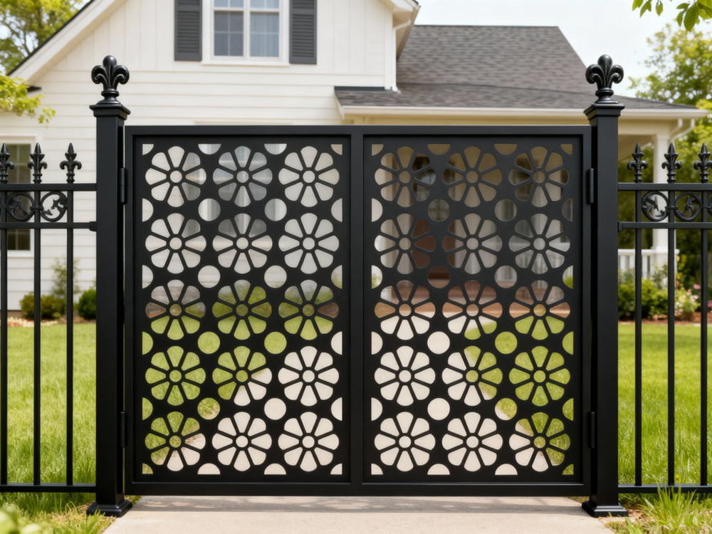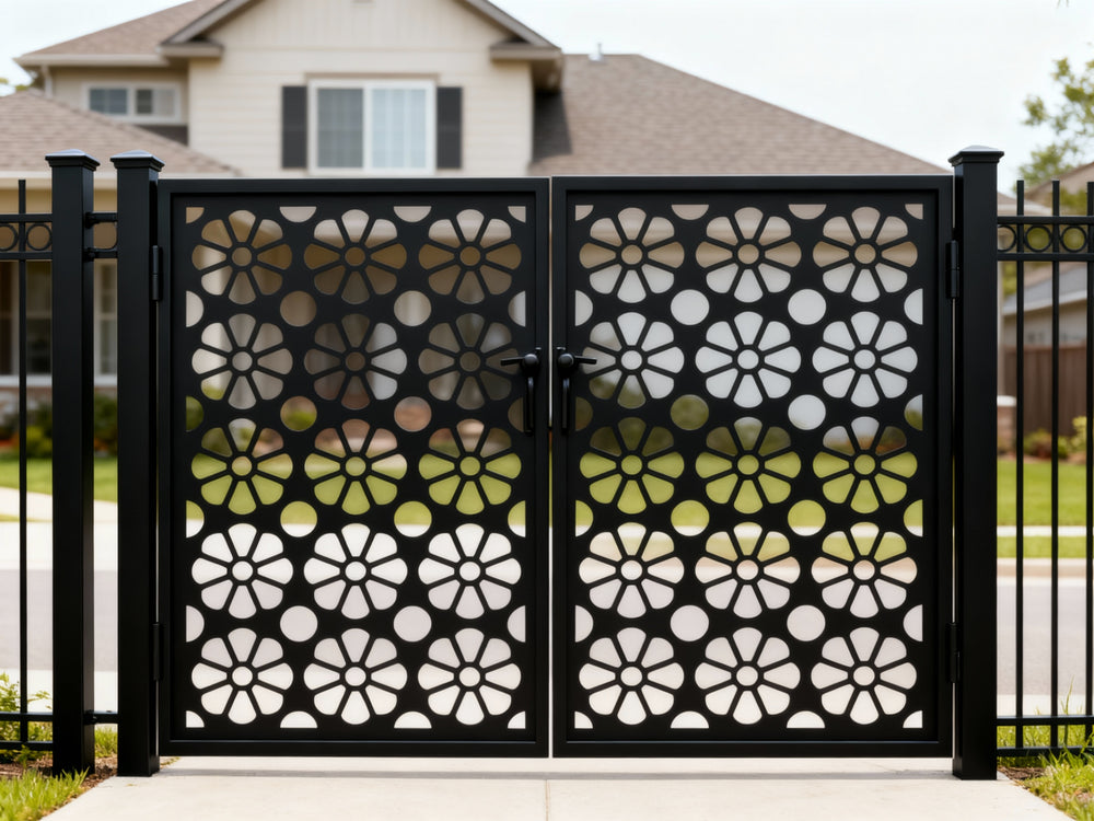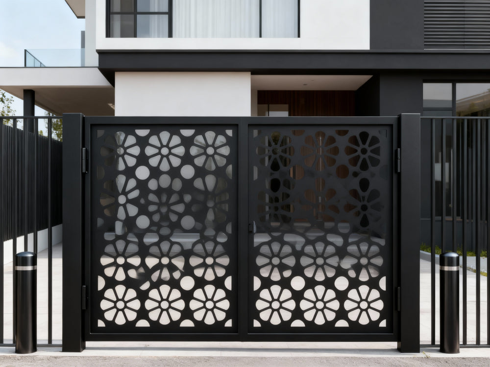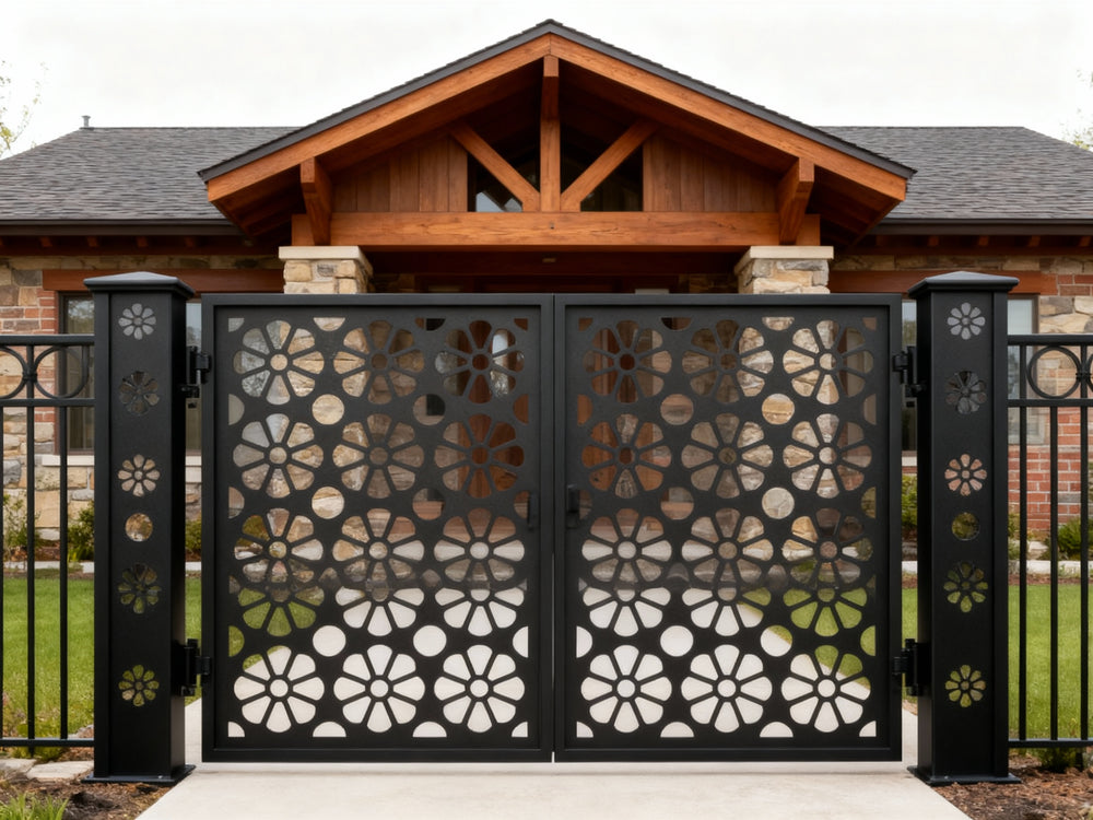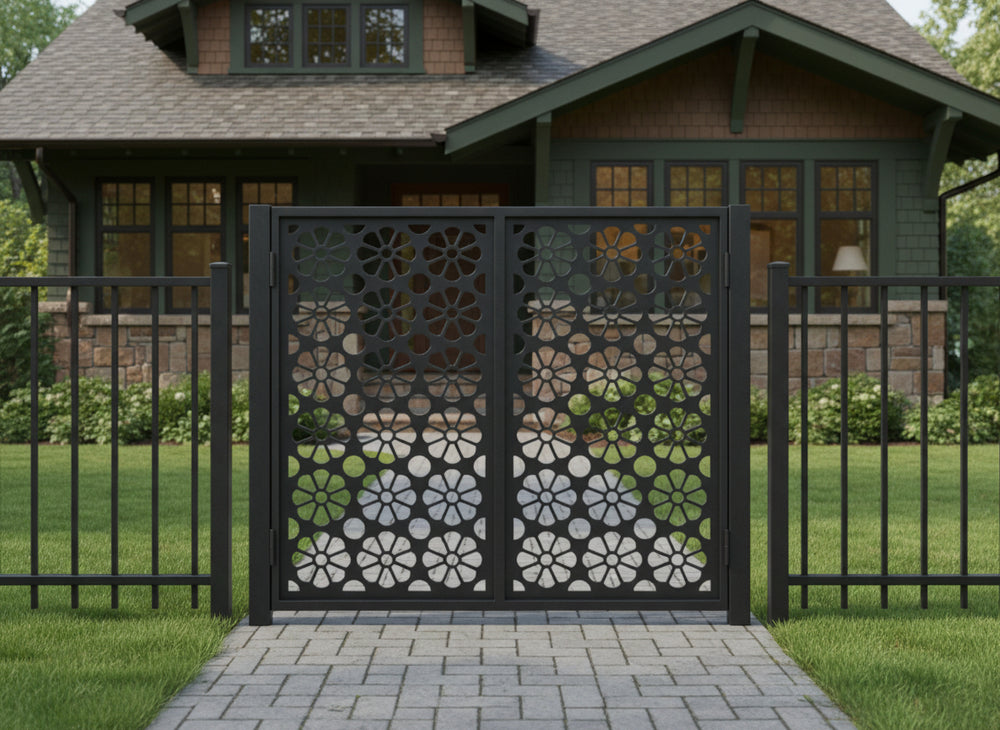 A door that blossoms with symmetry. Petalbloom Passage features two mirrored panels arranged in a grid of eight-petal floral motifs, each surrounded by circular cut-outs. The design evokes harmony and natural rhythm, ideal for garden entries, courtyard transitions, or architectural boundaries that blend ornamental softness with geometric clarity.