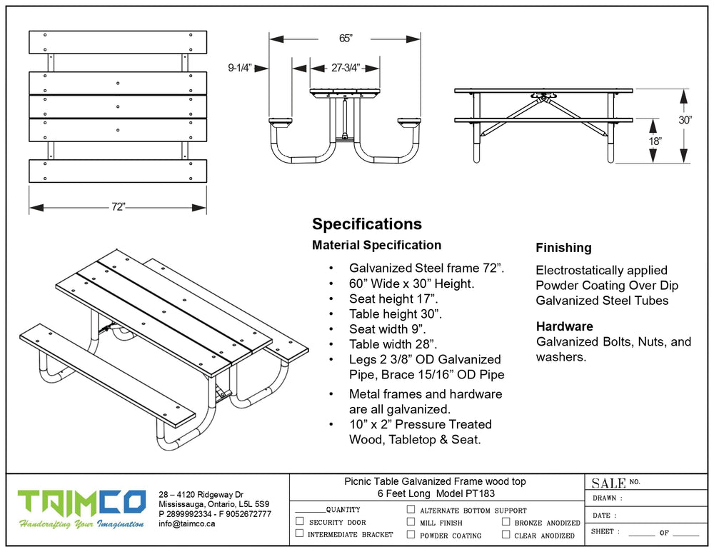 Picnic Table Galvanized Fame wood top 6 Feet Long | Model PT183