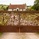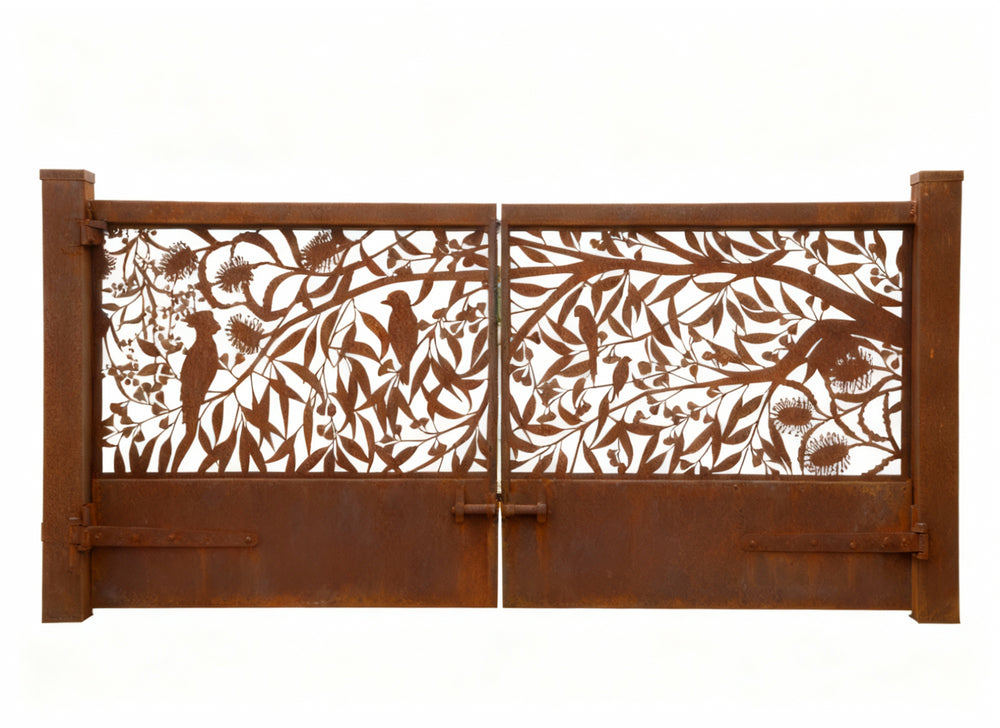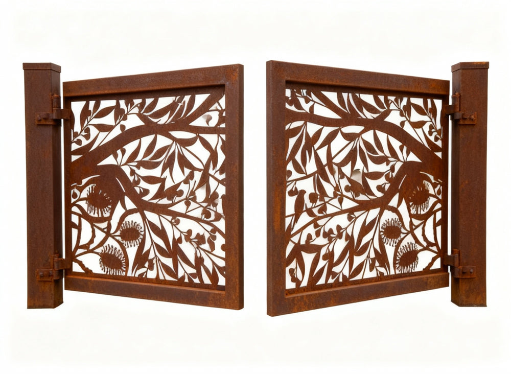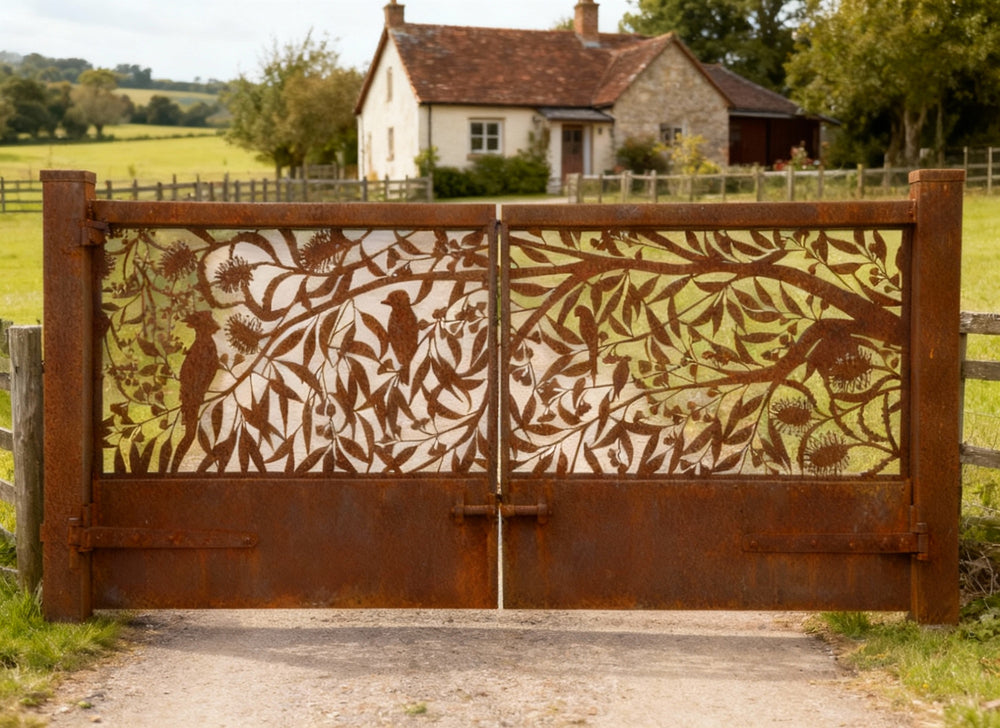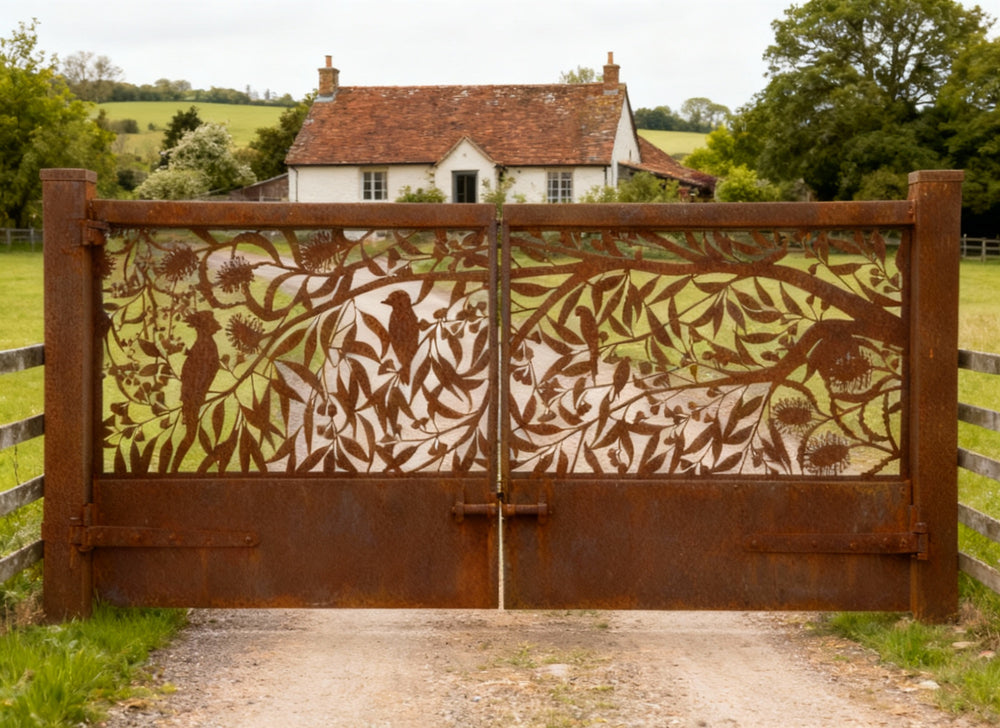 Botanical steel gate, bird-themed driveway gate, handcrafted garden gate, artistic iron fencing, custom nature-inspired gate, ornamental wrought iron gate, decorative corten steel panel