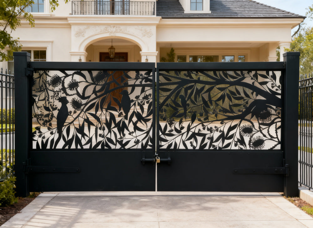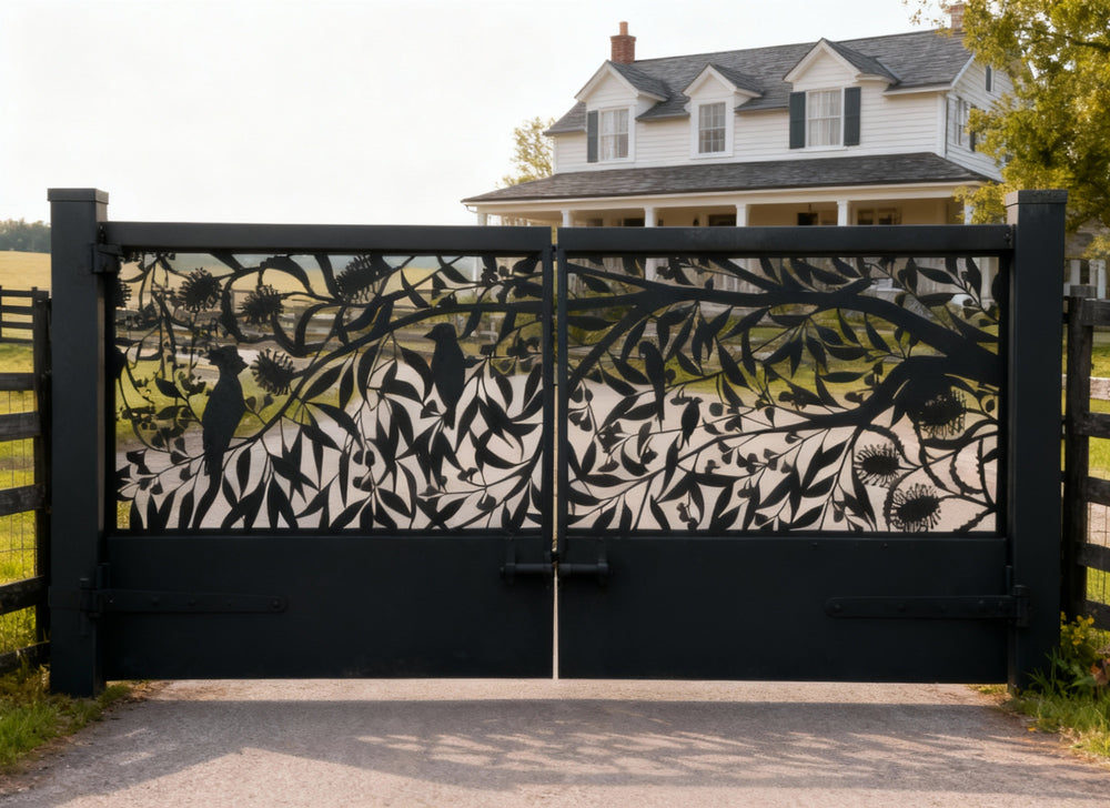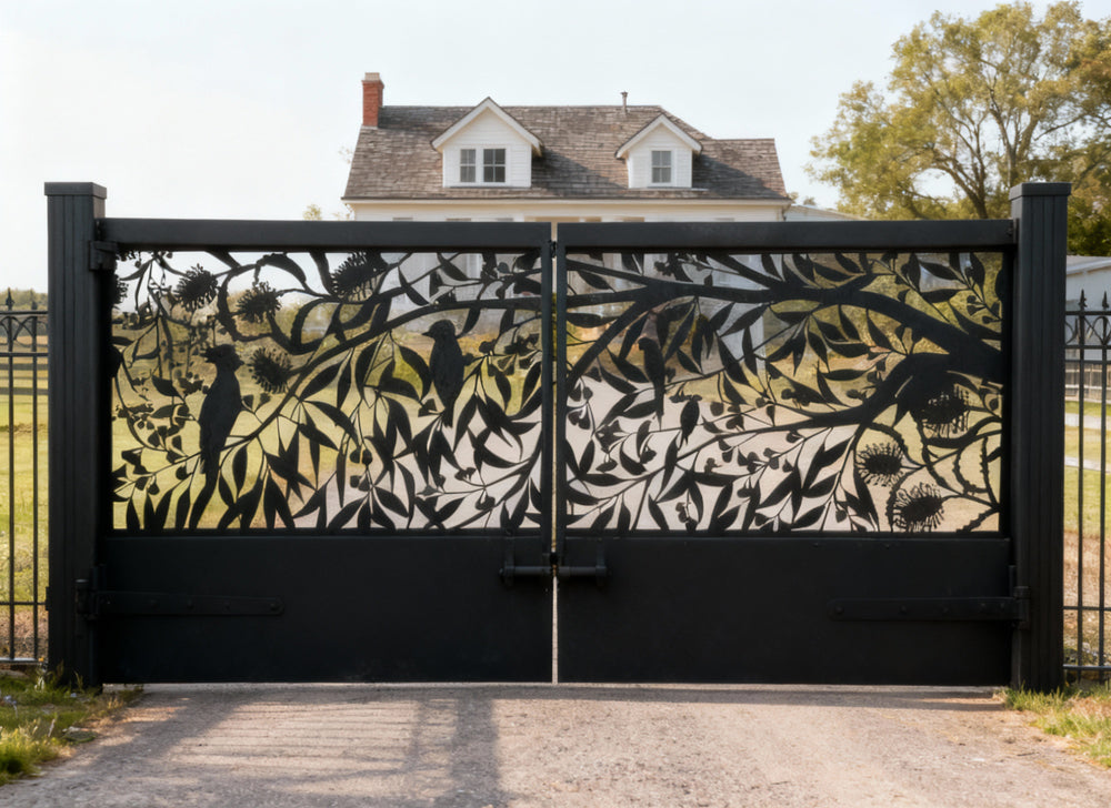 Plasma-Cut Steel Driveway Gate Botanical & Bird Design Model # DWG098