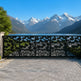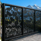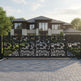 A gate that blossoms with presence. Poppy veil Luxe features four symmetrical panels adorned with stylized poppy motifs—leaves and petals rendered in intricate plasma-cut detail. The vertical columns on either side house embedded LED light strips, transforming the gate into a nighttime showpiece. Ideal for homes that blend nature-inspired design with modern architectural flair.