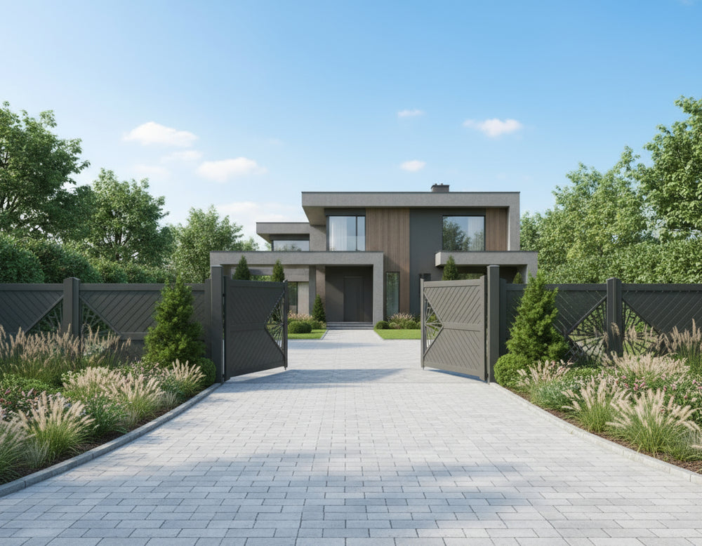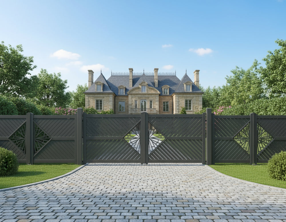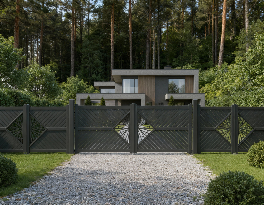 chevron driveway gate, diamond cutout steel gate, modern residential entrance, Canadian custom gate, Taimco architectural gate, radiant centerpiece gate, heavy-duty artistic gate, contemporary estate gate design