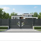 A gate that radiates precision. Radiant Chevron features dual swing panels with diagonally arranged slats forming a chevron pattern, converging at a central diamond-shaped cutout with radiating lines. The symmetrical layout and matte black finish offer sleek modernity, while the geometric centerpiece adds a touch of artistry and architectural intrigue. Framed by minimalist vertical posts, this gate is ideal for properties that blend clean design with bold visual identity.