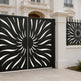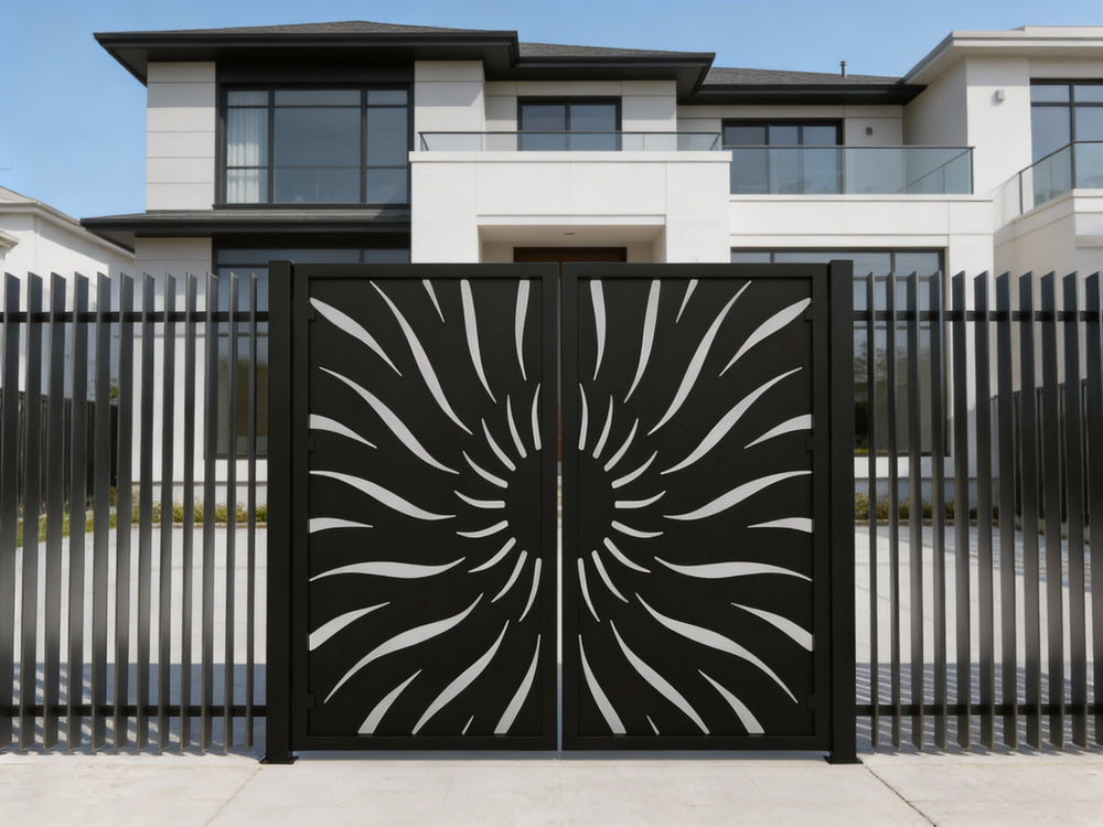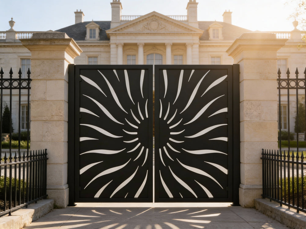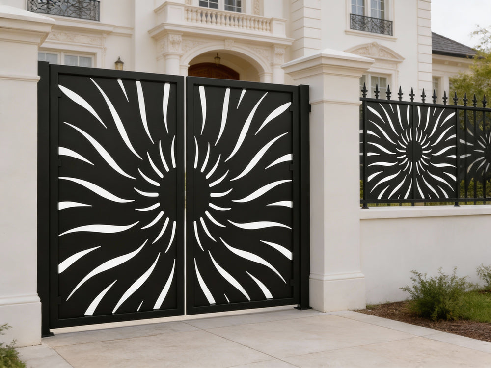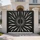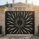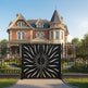 A door that glows with sculptural clarity. Rayveil Passage features two symmetrical panels framed in matte black, each showcasing a curved sunburst pattern of tapering rays radiating from the center. The cutout design allows filtered visibility while maintaining privacy, making it ideal for garden entries, patio transitions, or architectural walkways. This man door blends modern artistry with secure craftsmanship.