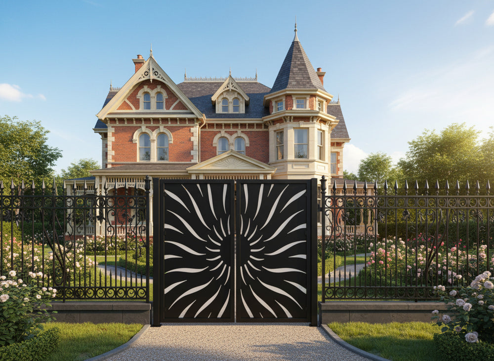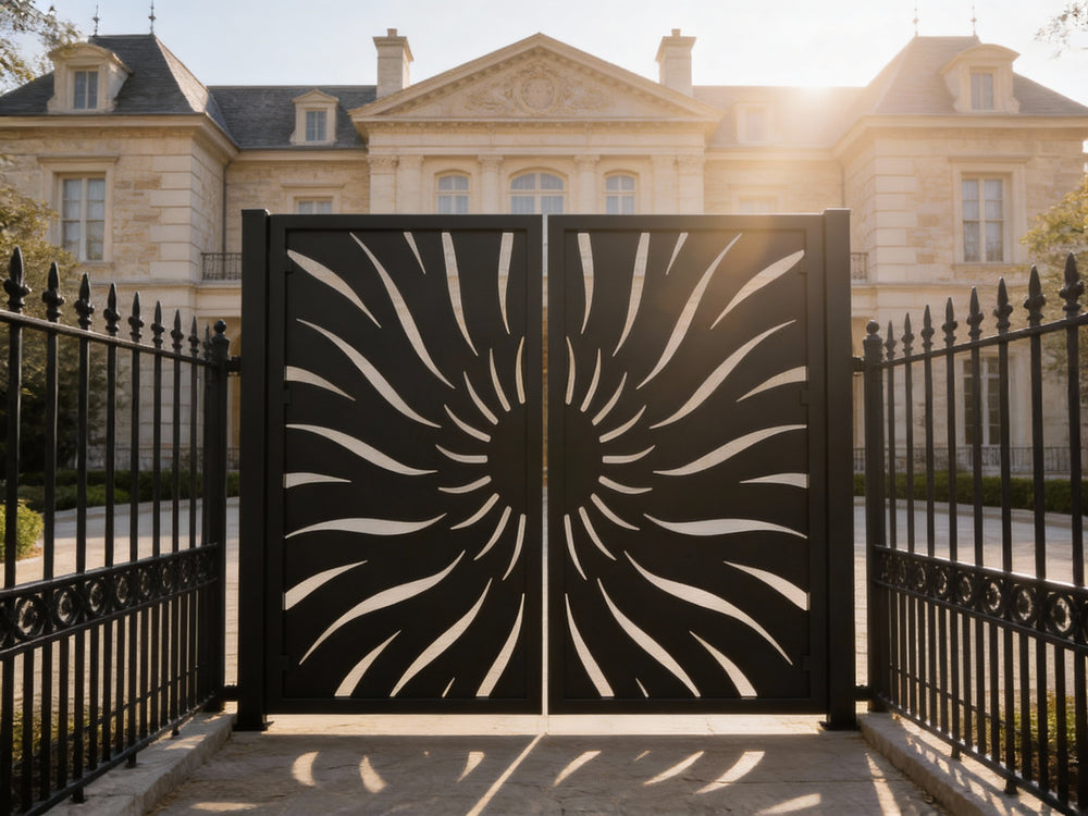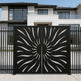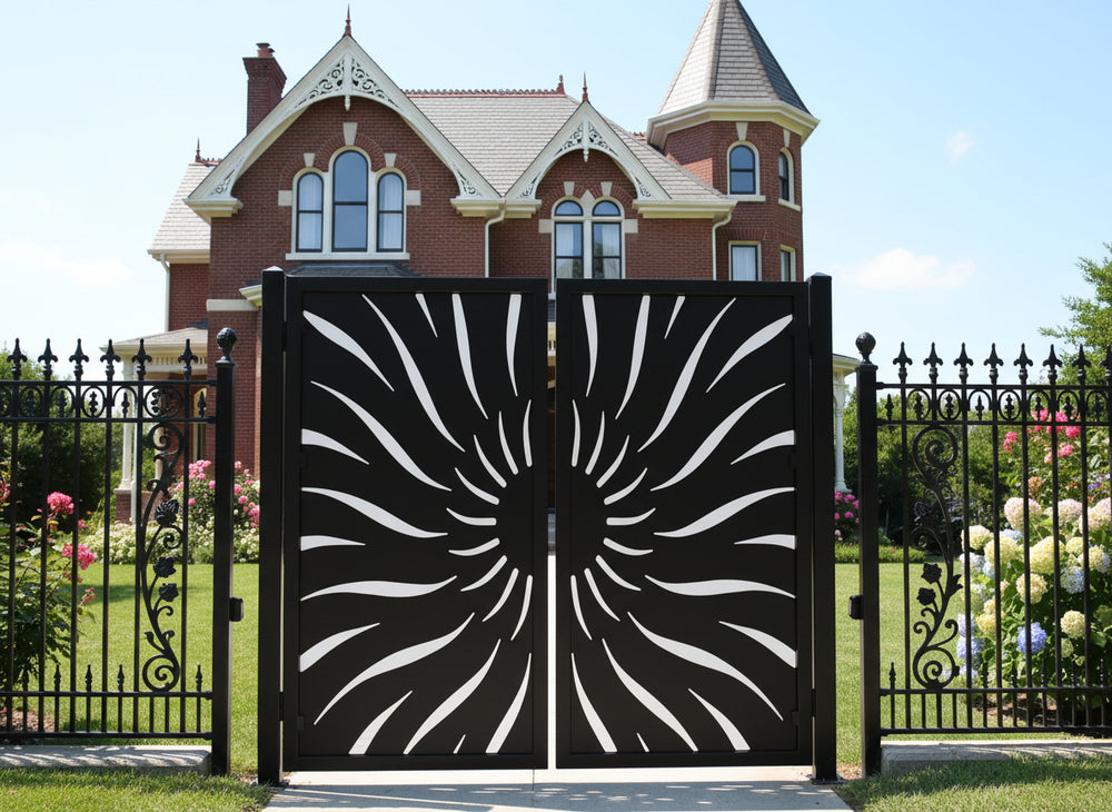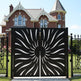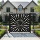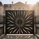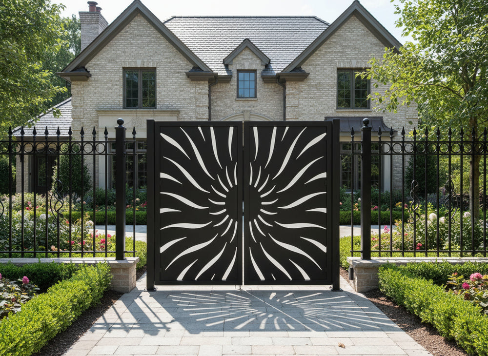 sunburst privacy man door, ornamental metal gate, curved ray garden entry, Canadian custom gate, Taimco Rayveil Passage model, manual operation decorative door