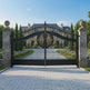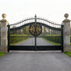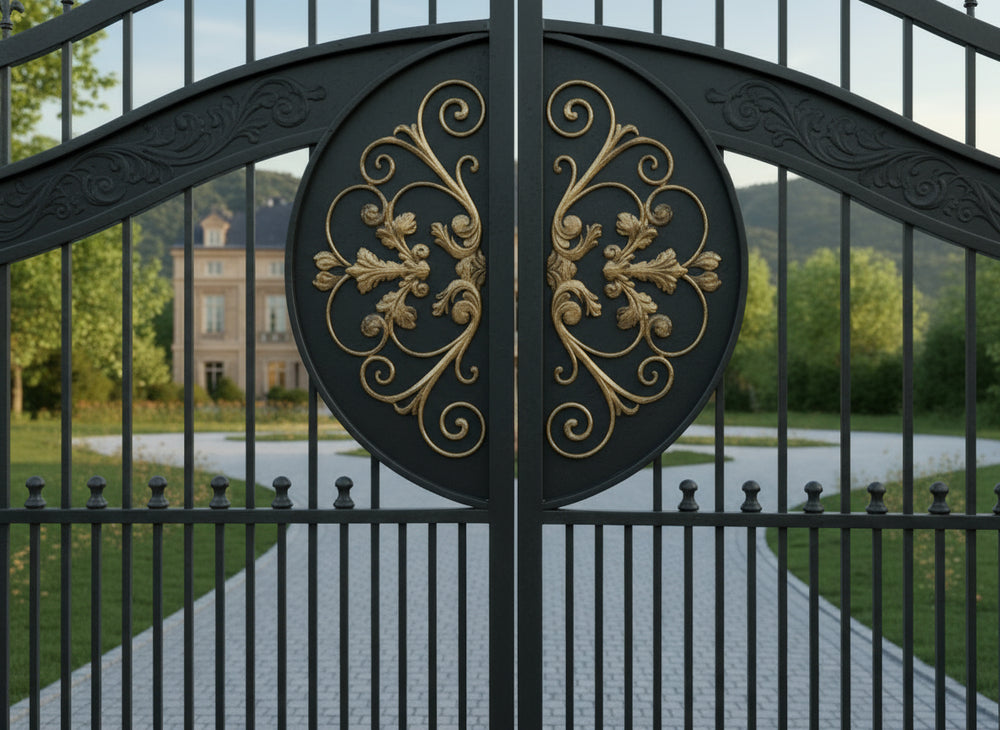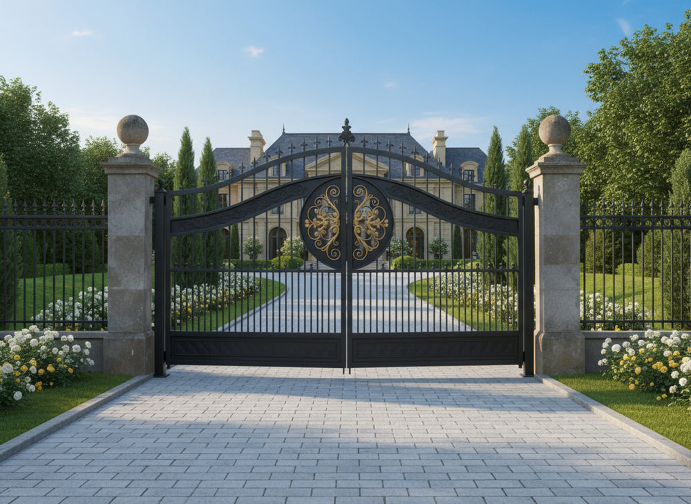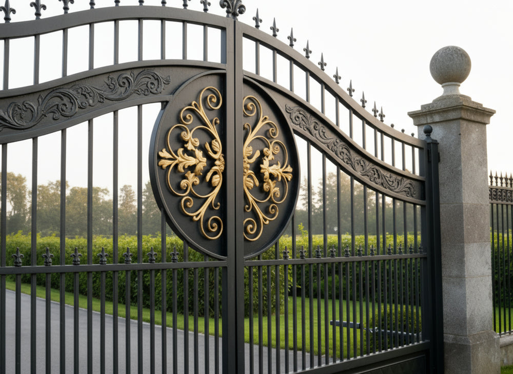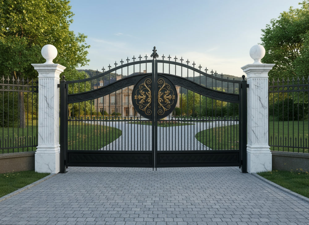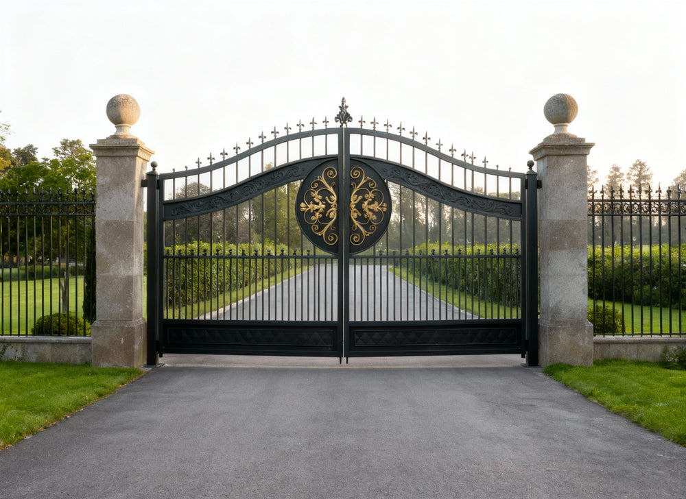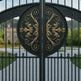 Regalcrest Dominion is a gate that reigns with elegance. It features dual swing panels crafted in matte black iron, each centred with a golden floral medallion enclosed in a circular crest. The upper edge is crowned with pointed finials and scrollwork, while the flanking stone pillars—topped with spherical ornaments—frame the entrance in classical symmetry. This gate evokes legacy, security, and timeless luxury.