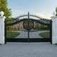 gold crest wrought iron gate, luxury estate entrance gate, scrollwork driveway gate, Canadian custom gate, Taimco decorative gate, ornamental iron gate, heavy-duty artistic gate design