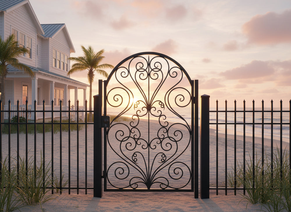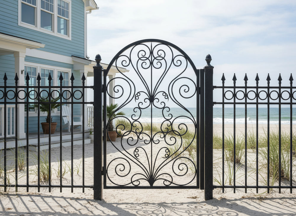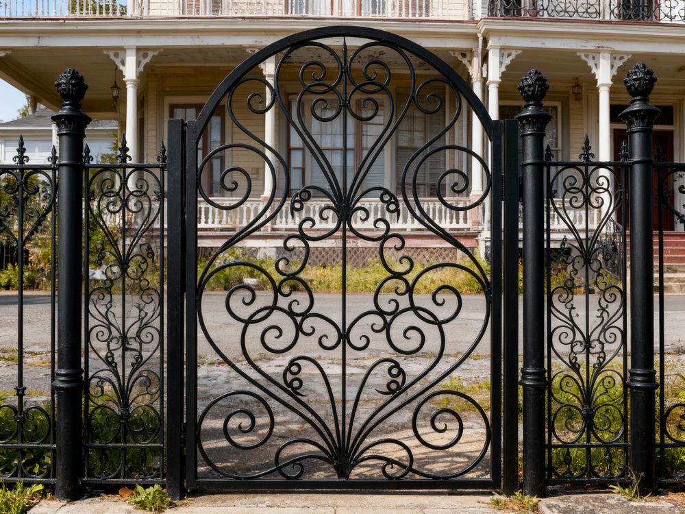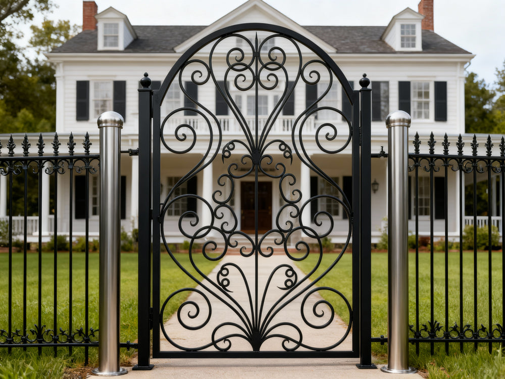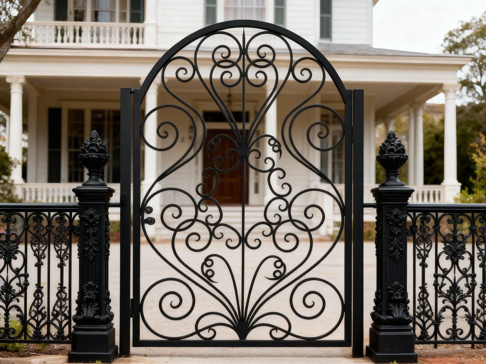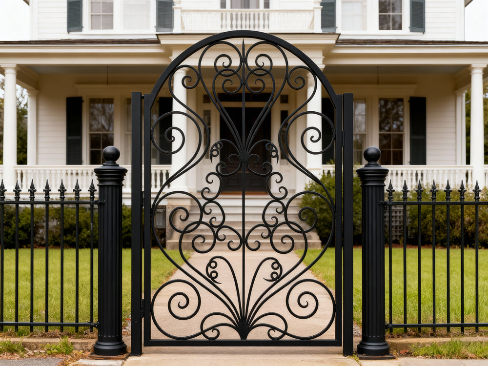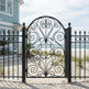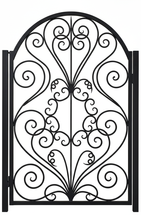A door that embodies elegance. Regal Scrollwork Passage features a black wrought-iron body with symmetrical ornamental detailing, including flowing scroll accents arranged in balanced harmony. The arched silhouette crowns the design with timeless sophistication, making this gate ideal for refined residential entries, garden transitions, or architectural boundaries that blend artistry with durability.