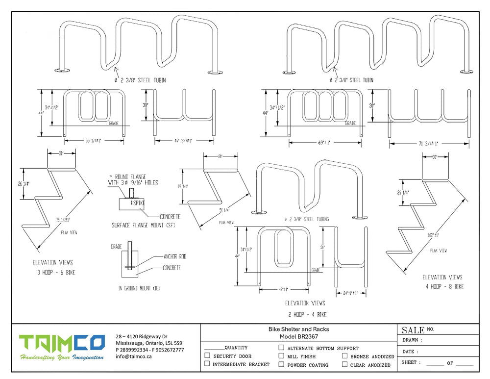 The TAIMCO bicycle rack transcends form and function to make a bold, aesthetic statement. When empty, the simple “floating” concentric rings of the TAIMCO™ look like an attractive outdoor sculpture. When full, these same concentric rings park bikes safely and securely.