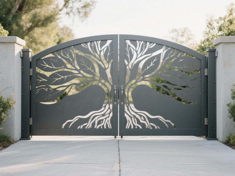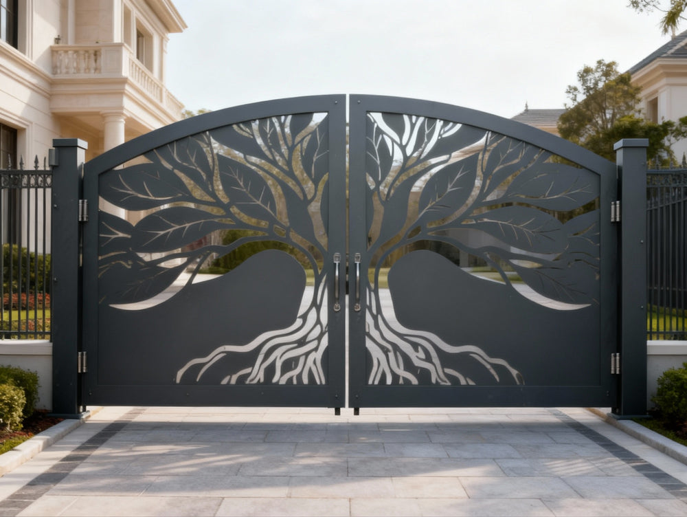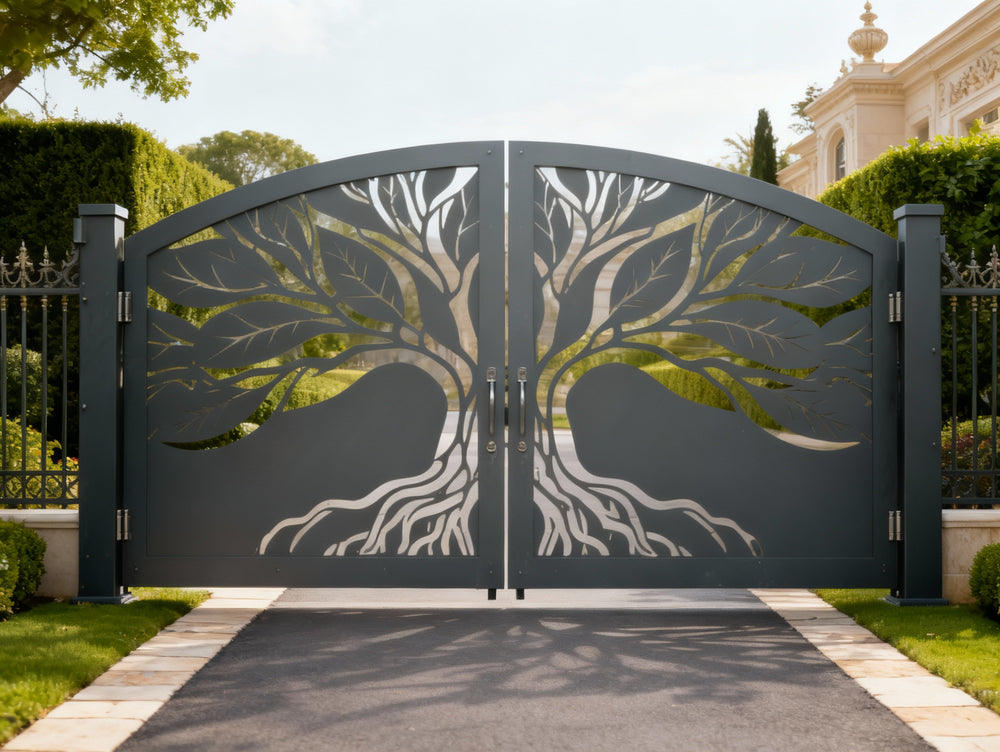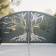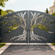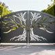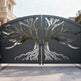 tree silhouette metal gate, split tree driveway gate, nature-inspired estate gate, Canadian custom gate, Taimco artistic gate, root and branch gate design