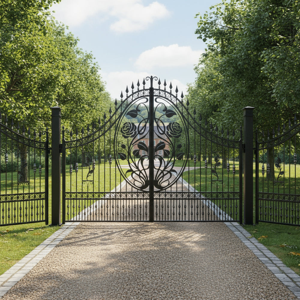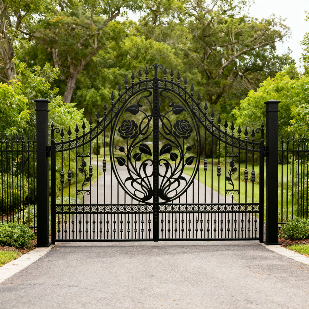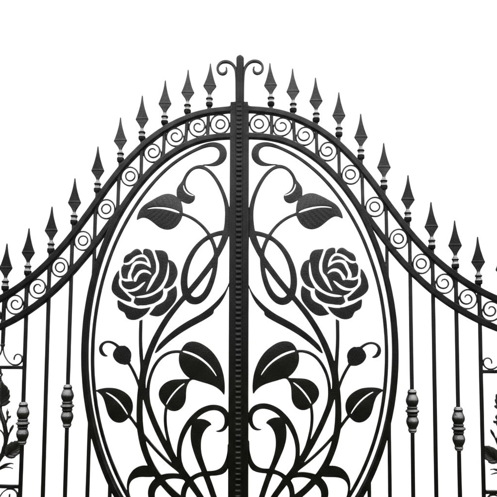 A gate that blooms with meaning. Rosaria Crest gate features dual swing panels crowned by a gentle arch lined with pointed finials. At its heart, two sculpted roses—complete with stems and leaves—face each other within an oval frame, forming a visual emblem of love, legacy, and symmetry. Surrounding scrollwork and floral motifs add rhythm and depth, while vertical bars ensure strength and security. Framed by bold black pillars, this gate evokes romance, craftsmanship, and timeless grandeur.
