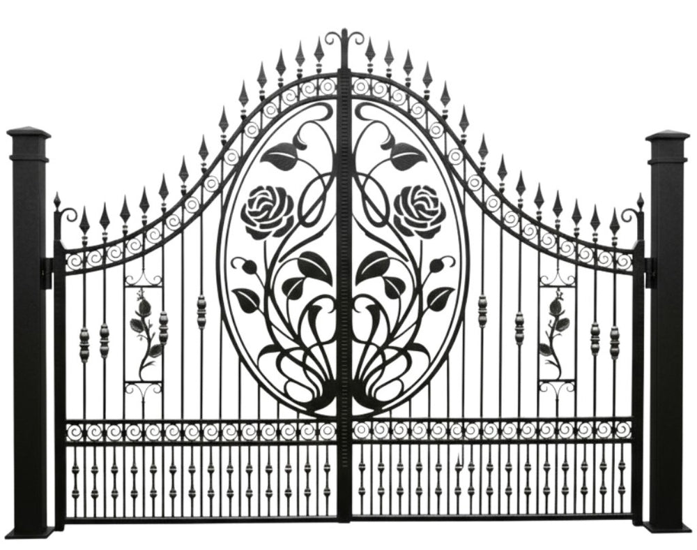 Rosaria Crest gate – Wrought Iron Gate with Twin Roses & Finial Arch Model # DWG143