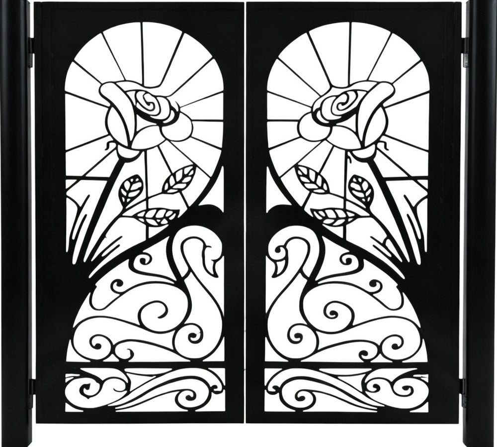 rose and swan man door, symbolic wrought iron gate, radiant line garden entry, Canadian custom gate, Taimco artistic passage door, manual operation estate gate