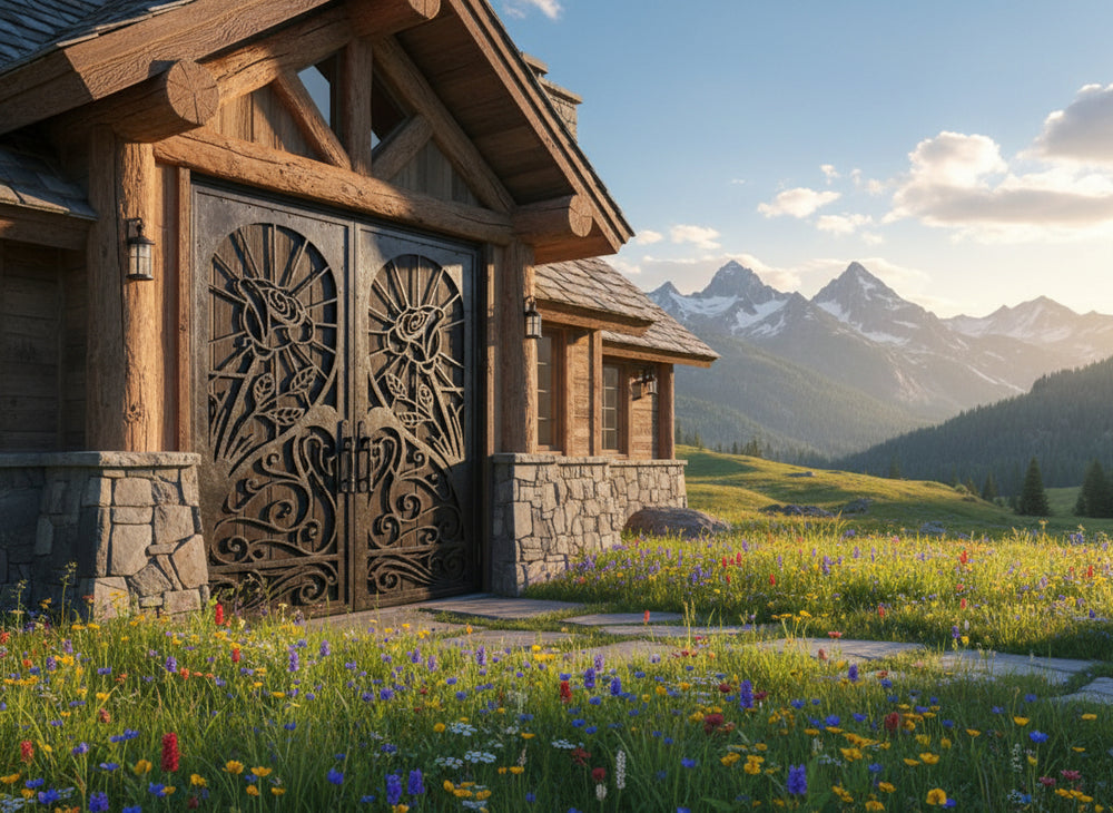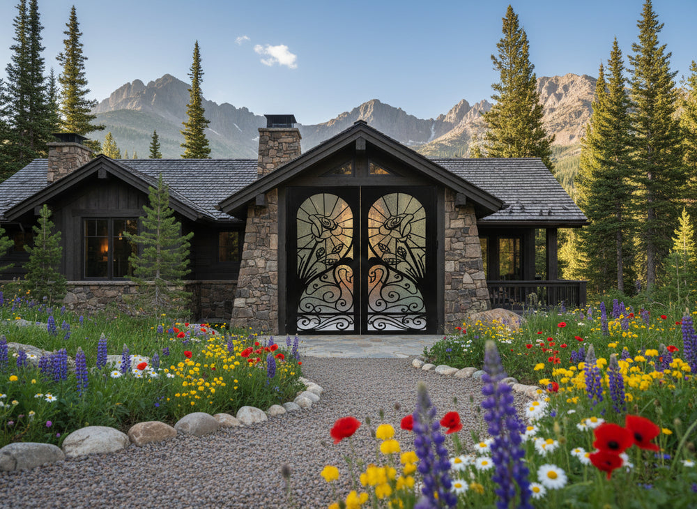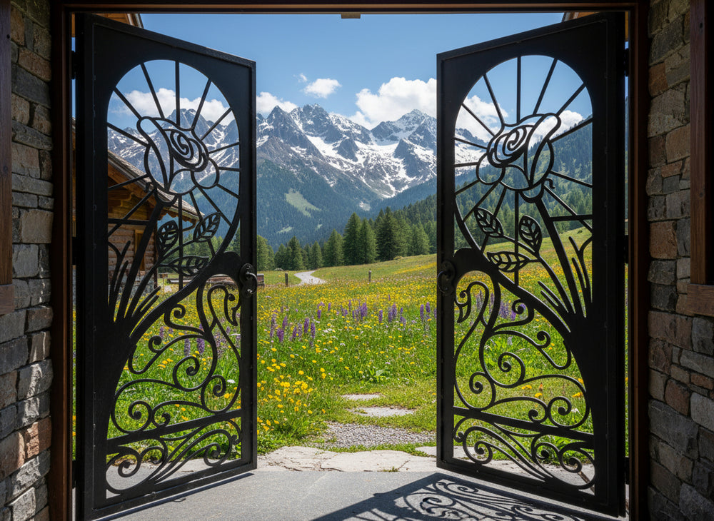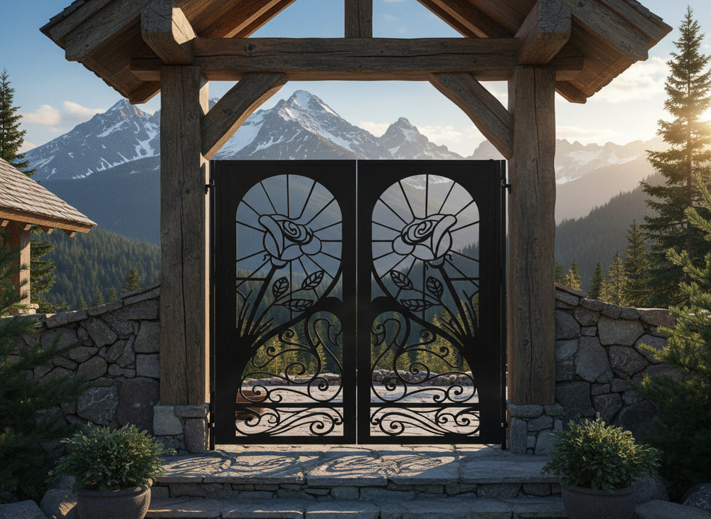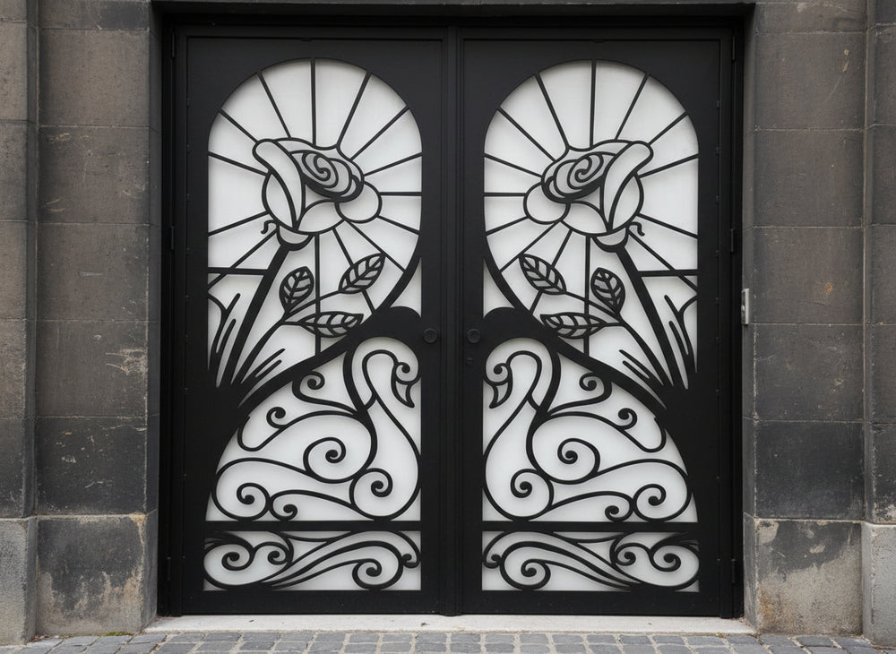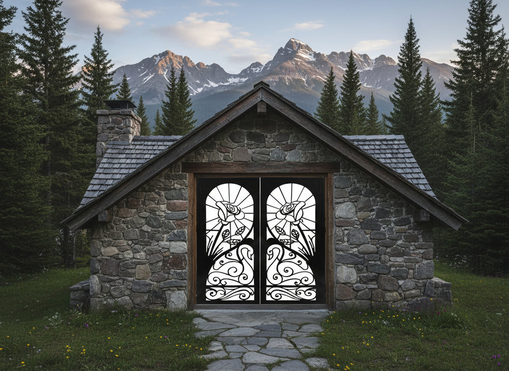 A door that tells a story of grace and serenity. Roses Wan Passage features symmetrical panels adorned with long-stemmed roses at the top and stylized swans at the base, framed by radiant linework that evokes the warmth of sunlight or the beauty of stained glass. The composition seamlessly blends symbolism and elegance—ideal for garden entrances, estate transitions, or architectural passages that celebrate beauty, tranquillity, and craftsmanship.