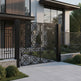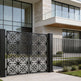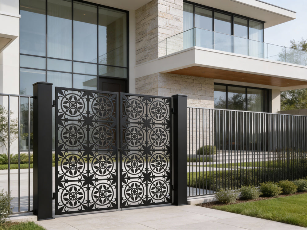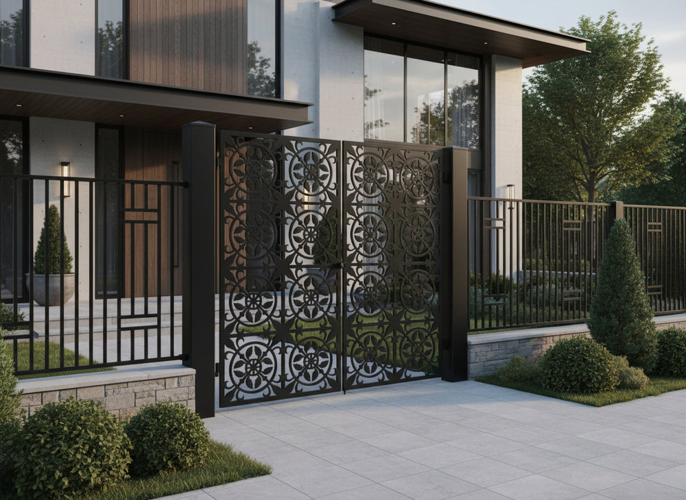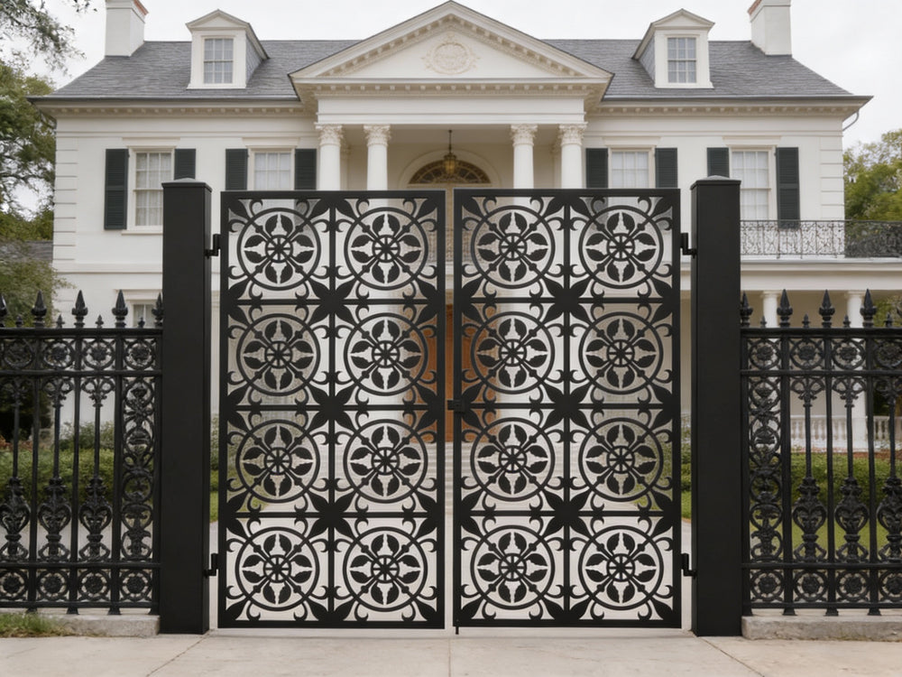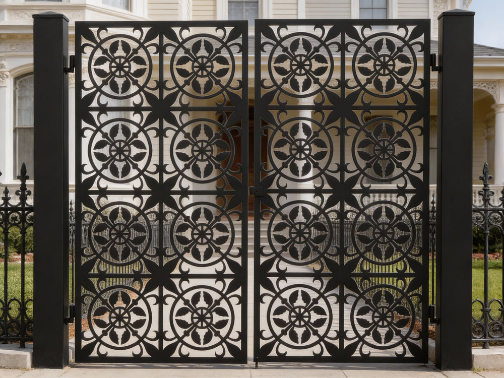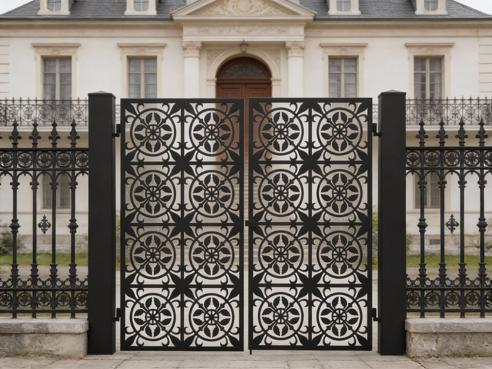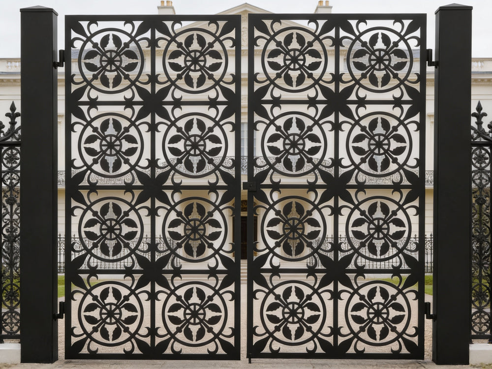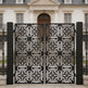 A door that blooms with symmetry and grace. Rosetteveil Passage features two mirrored panels, each showcasing a grid of six circular rosettes—wheel-like medallions surrounded by leaf-shaped flourishes and ornate scrolls. The design evokes classical elegance and botanical rhythm, ideal for garden entries, courtyard transitions, or estate walkways.