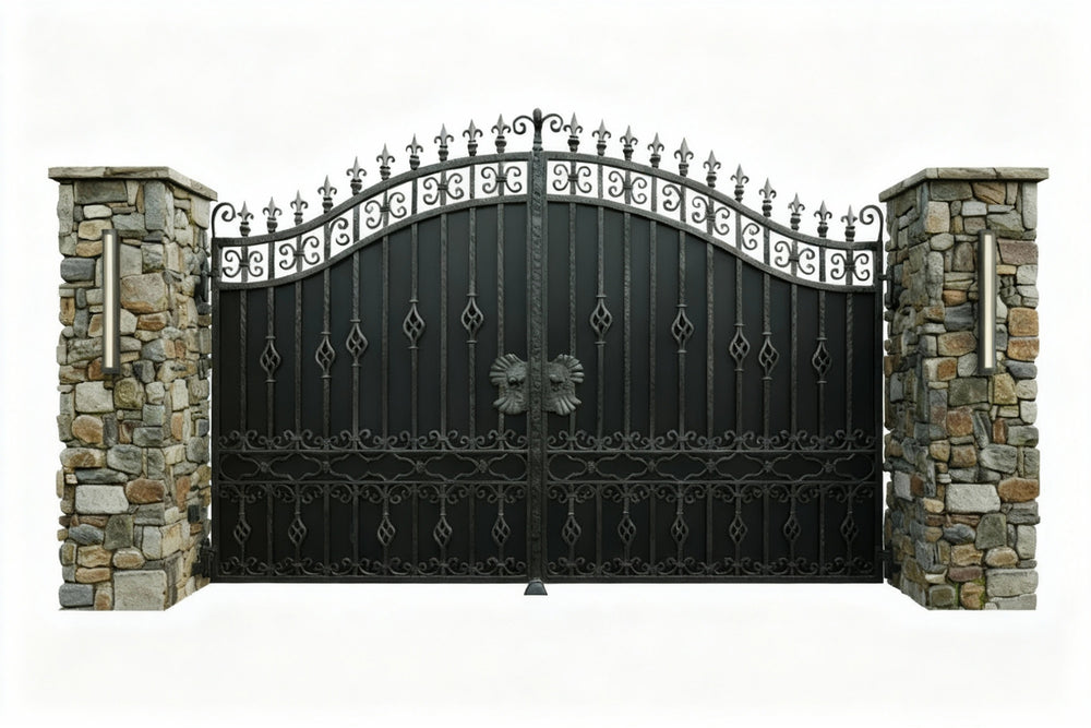 A gate that greets with grace. Scrollcrest Bloom features dual swing panels adorned with symmetrical scrollwork and floral motifs, crowned by a curved arch lined with pointed finials. The flanking stone pillars—built from multi-toned masonry and topped with vertical lanterns—anchor the design with rustic charm. This gate evokes the elegance of classical gardens and the strength of handcrafted ironwork.