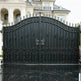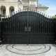 floral scroll wrought iron gate, arched estate gate, rustic stone pillar gate, Canadian custom gate, Taimco decorative gate, garden entrance gate, heavy-duty ornamental gate, luxury property gate design