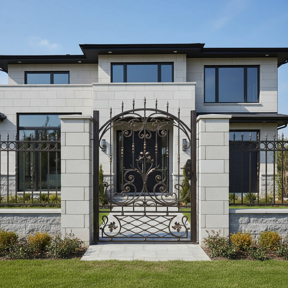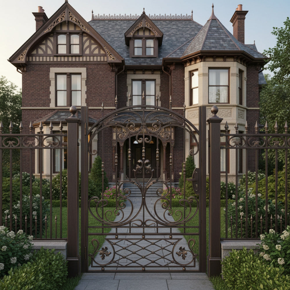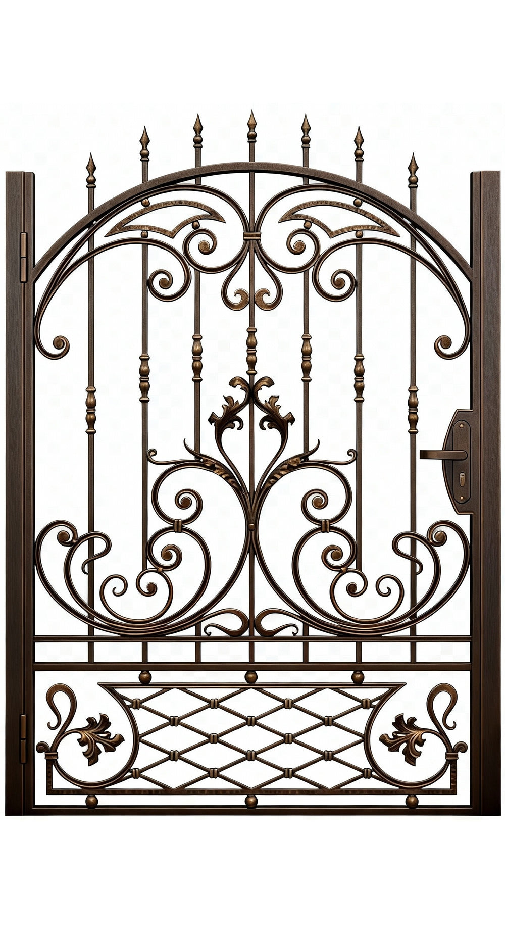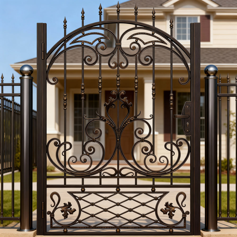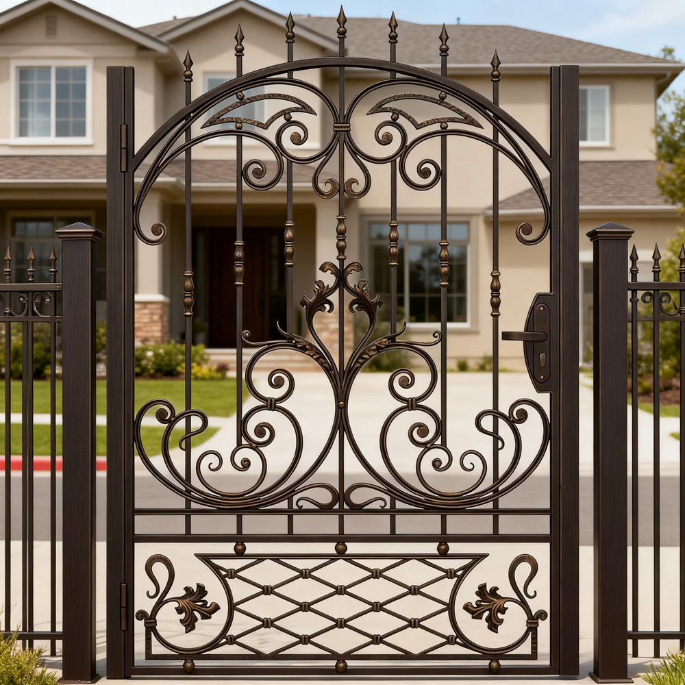 A door that welcomes with elegance. Scrollhaven Passage features a single swing panel adorned with intricate scrollwork and floral motifs, framed by vertical bars and a secure locking handle. Designed for garden entries, courtyard transitions, or residential walkways, this man door blends ornamental charm with functional strength—ideal for enhancing curb appeal while maintaining privacy and protection.