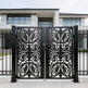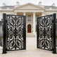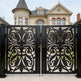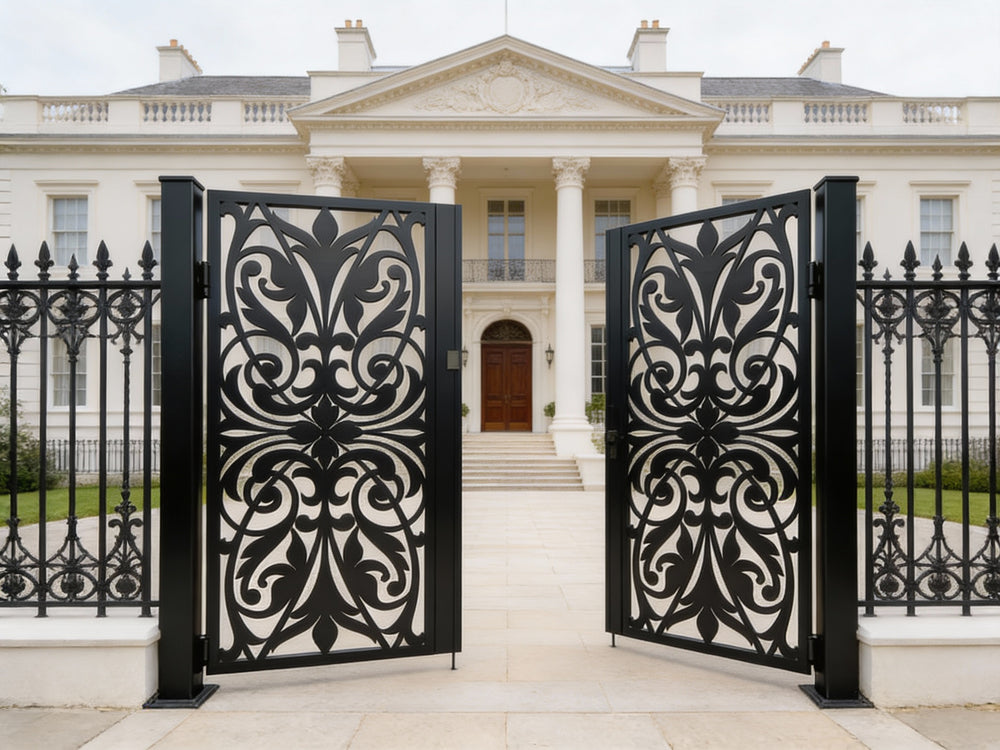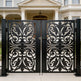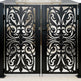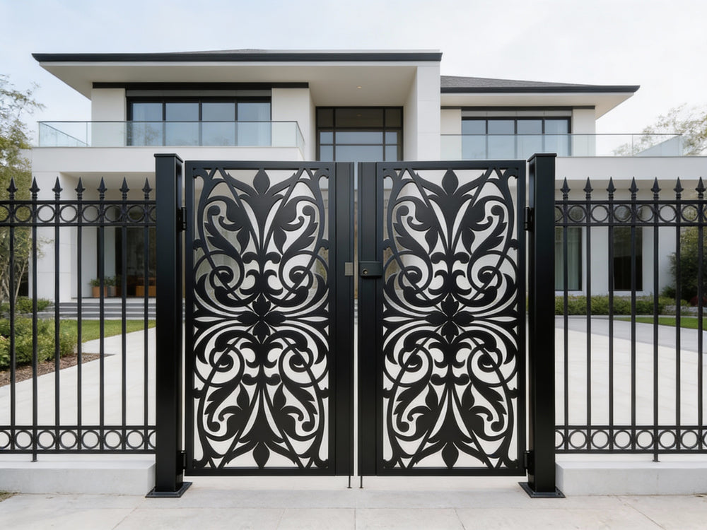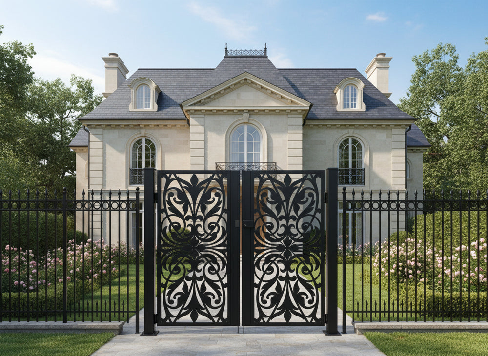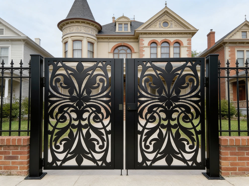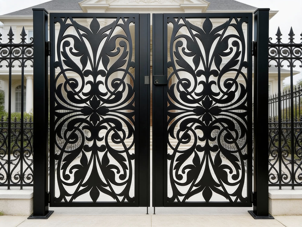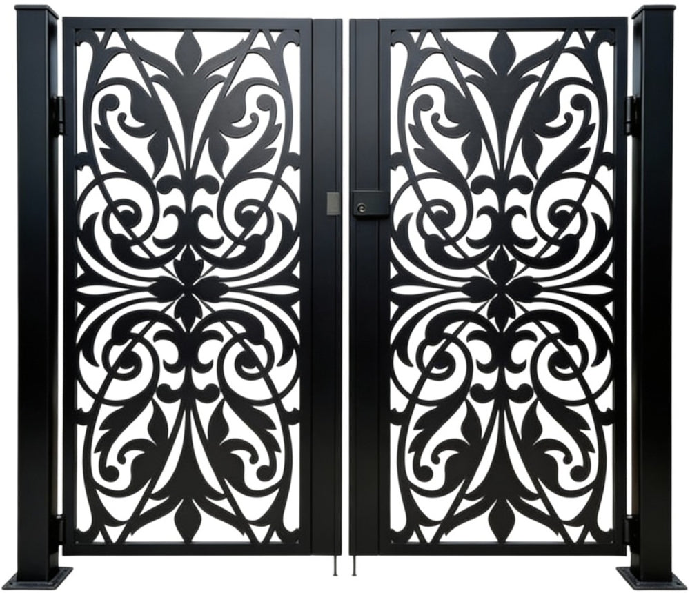 A door that flourishes with symmetry and grace. Scrollspire Passage features two mirrored panels joined at the center, each adorned with swirling scrollwork and floral motifs. The arched top adds architectural lift, while the bottom panel anchors the design with three evenly spaced floral medallions. Ideal for garden entries, courtyard transitions, or residential walkways, this man door blends ornamental elegance with secure craftsmanship.