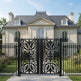 floral scroll man door, ornamental wrought iron gate, arched garden entry, Canadian custom gate, Taimco Scrollspire model, manual operation passage door