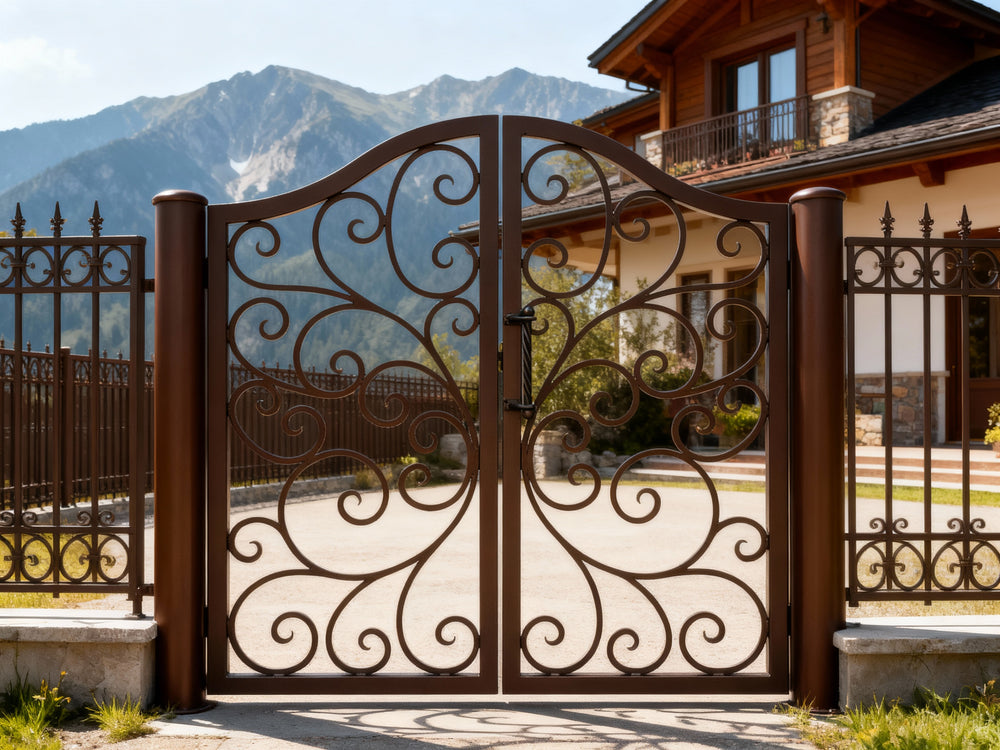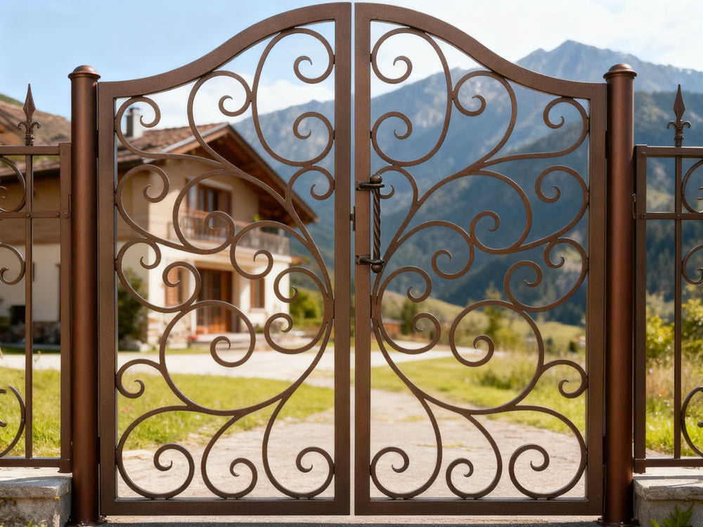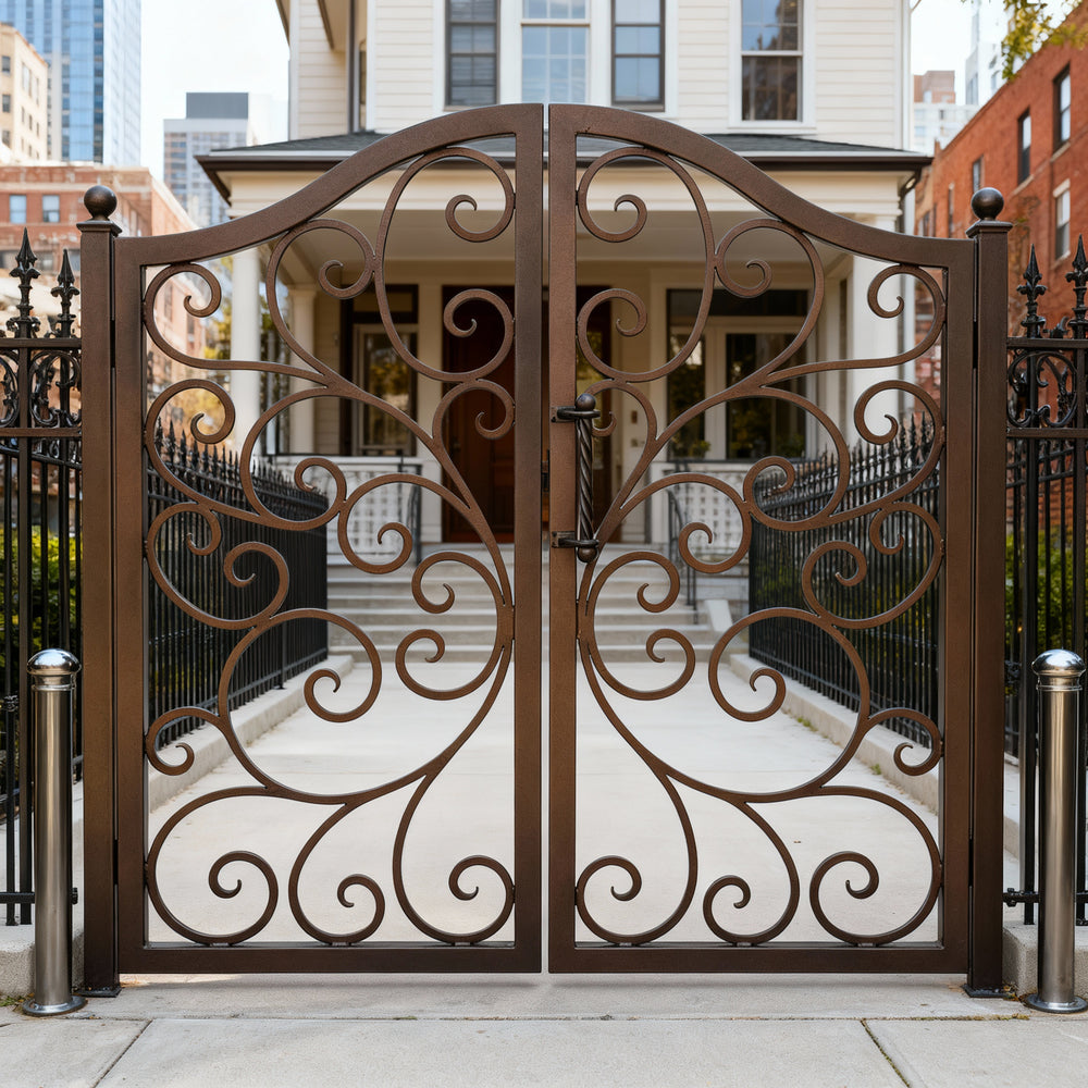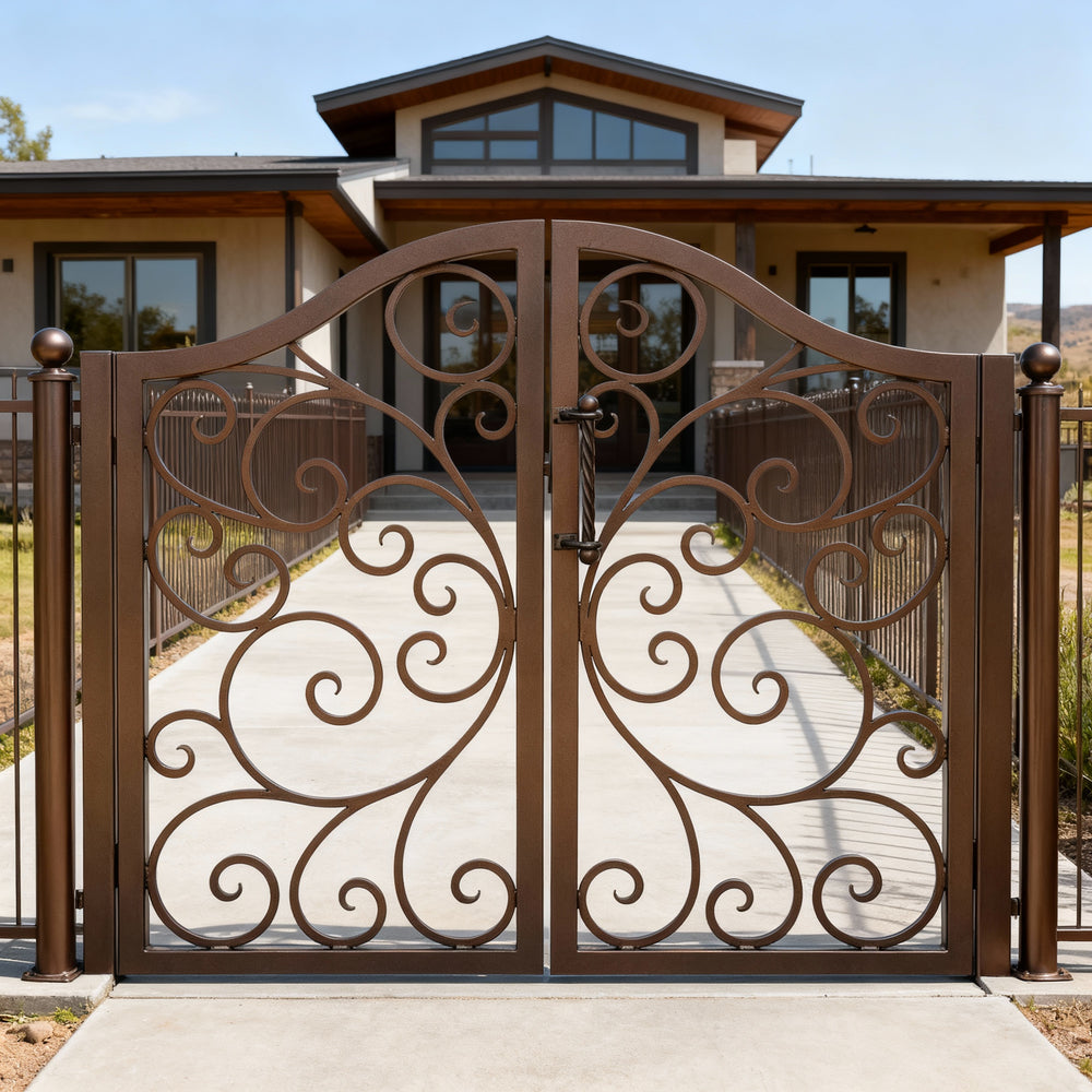 A door that flows with elegance. Scrollveil Passage features two mirrored panels adorned with swirling scrollwork, curvilinear accents, and a gentle arched top. The design evokes classical charm and ornamental richness—ideal for garden entries, courtyard transitions, or upscale residential boundaries that blend artistic craftsmanship with secure structure.